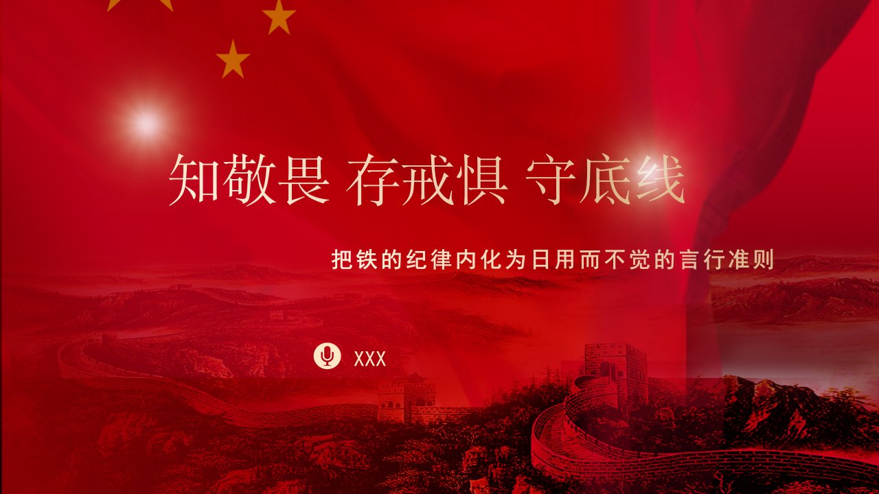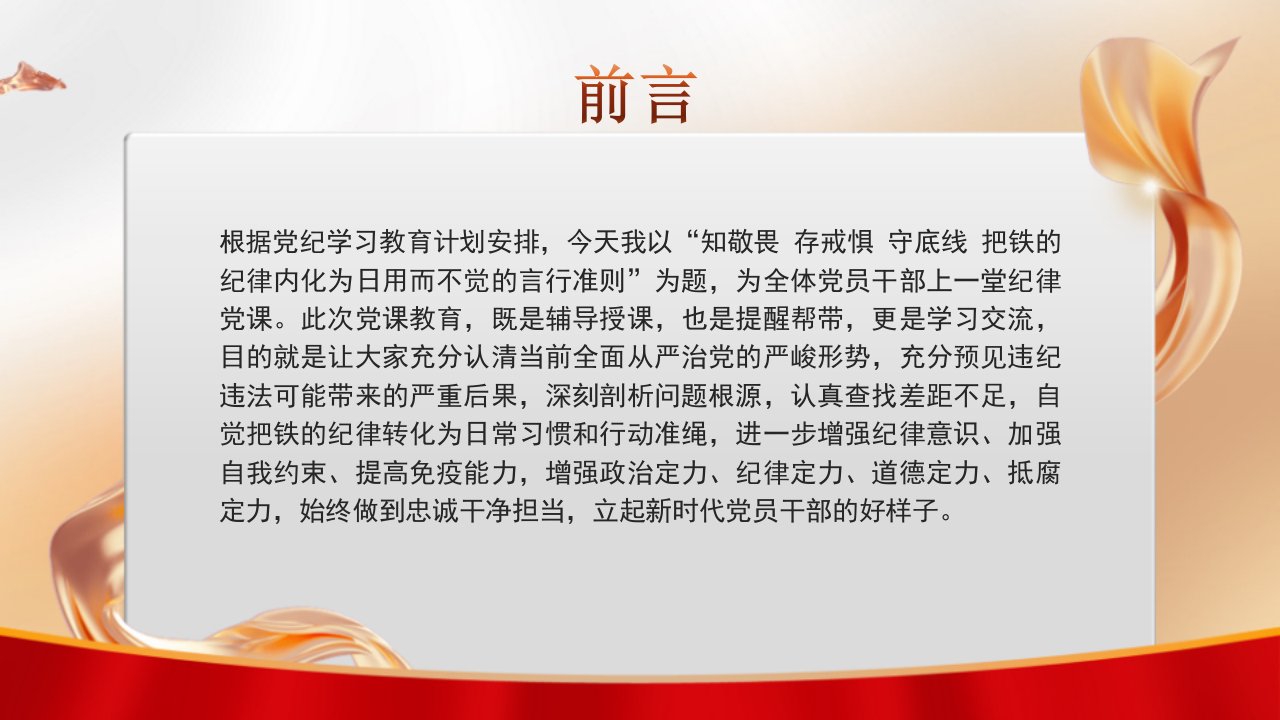 标题:党纪学习教育党课PPT课件含讲稿:知敬畏、存戒惧、守底线把铁的纪律内化为日用而不觉的言行准则