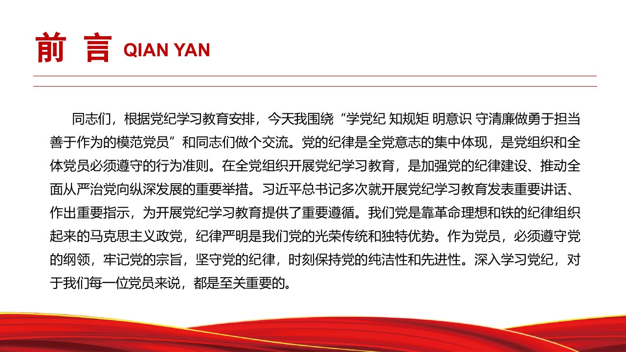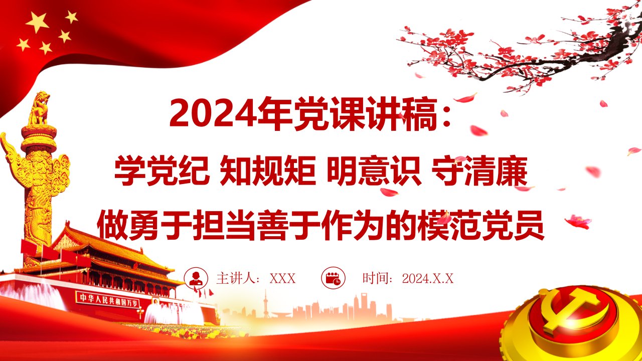 标题:2024年党纪学习教育专题党课讲稿ppt课件【两套】供参考:学党纪 知规矩 明意识 守清廉 做勇于担当作为的模范党员与学纪、知纪、明纪、守纪,自觉遵守党的纪律