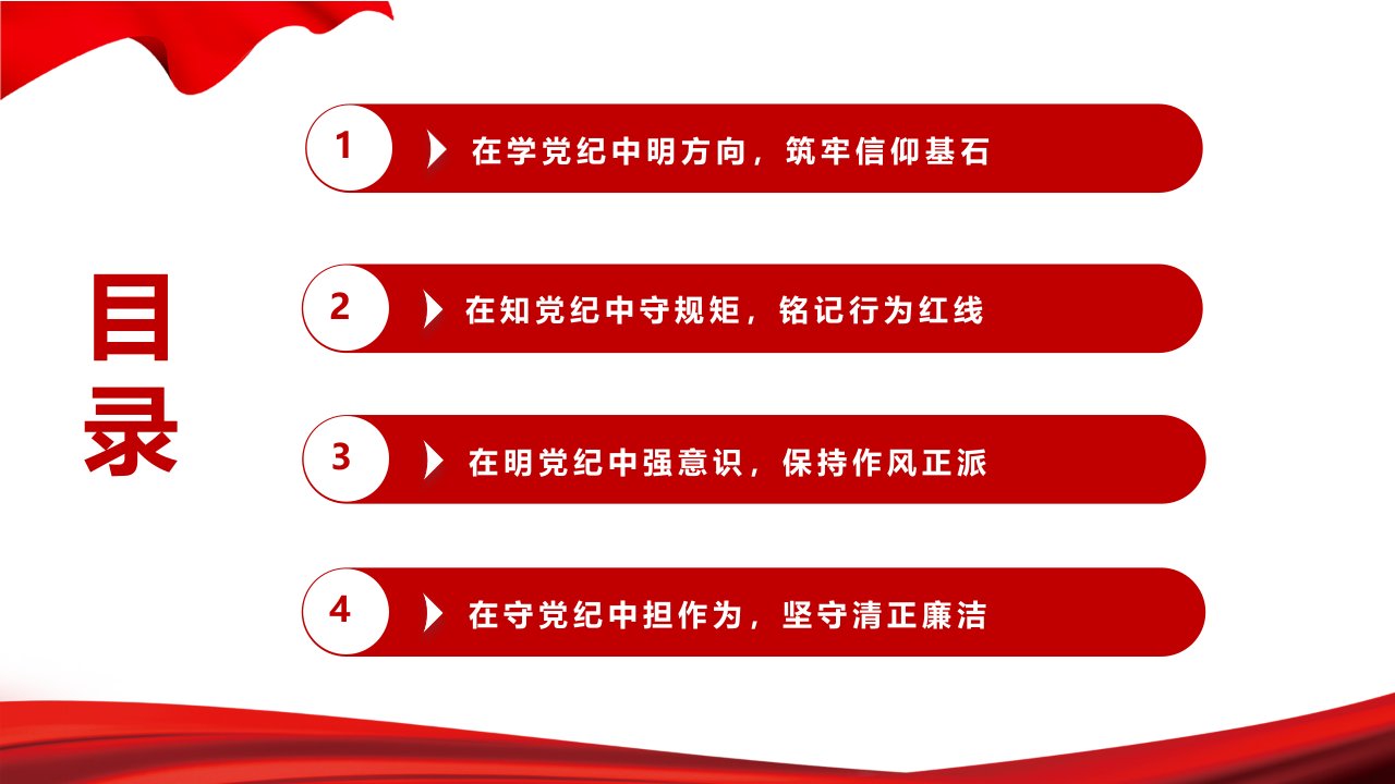 标题:2024年党纪学习教育专题党课讲稿ppt课件:学纪、知纪、明纪、守纪,自觉遵守党的纪律与从讲政治的高度抓实党纪学习教育不断提高政治站位、扛起政治责、任严守政治底线【两套】供参考