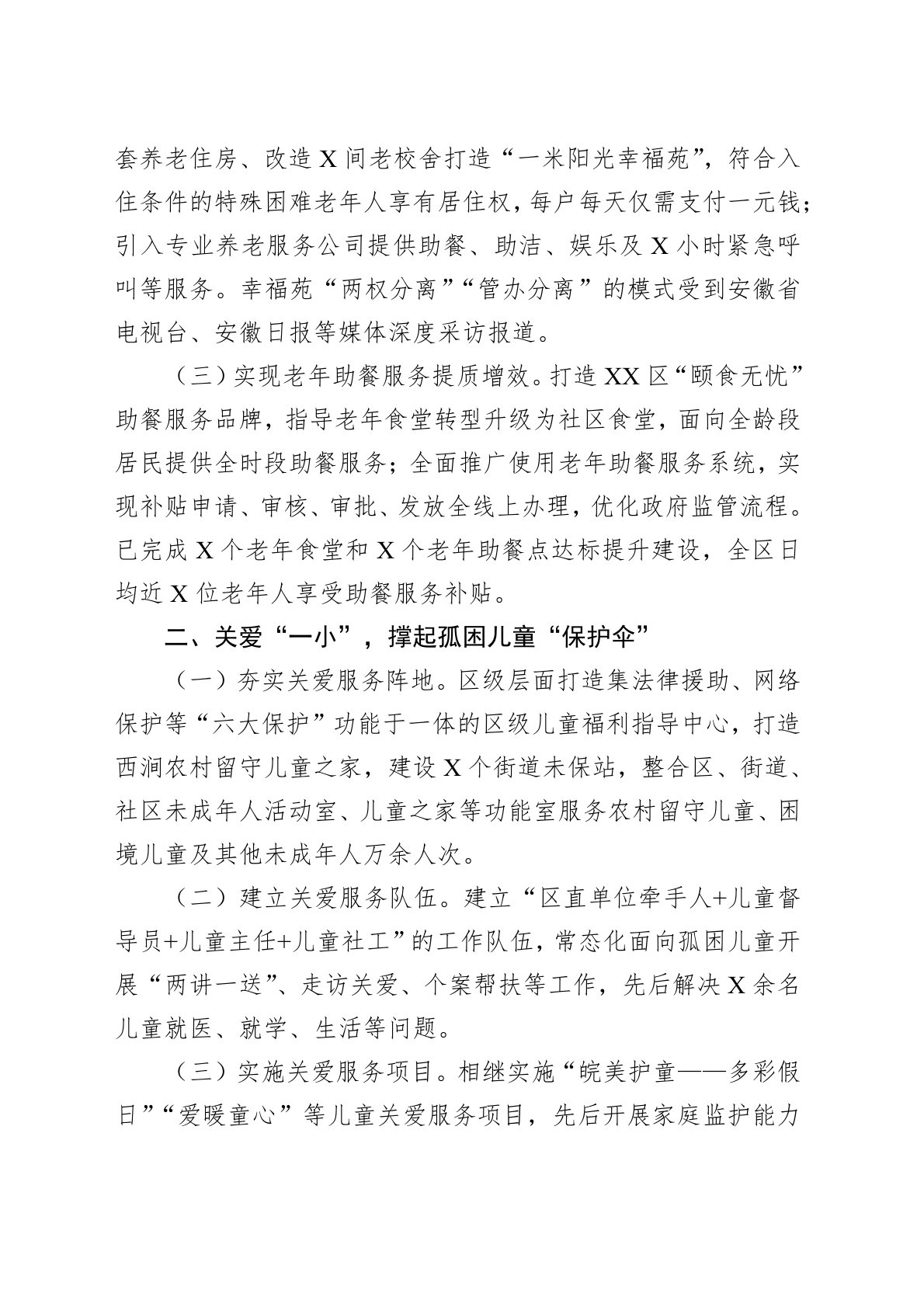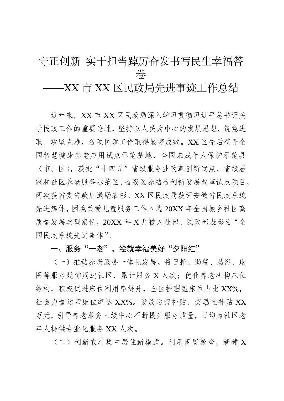 近年来,XX市XX区民政局深入学习贯彻习近平总书记关于民政工作的重要论述,坚持以人民为中心的发展思想,锐意进取、攻坚克难,各项民政工作取得显著成效。XX区先后获评全国智慧健康养老应用试点示范基地、全国未成年人保护示范县(市、区),获批“十四五”省级服务业改革创新试点、省级居家和社区养老服务示范区、省级医养结合创新发展改革试点项目,两次获省委省政府激励表彰。XX区民政局获评安徽省民政系统先进集体,困境关爱儿童服务工作入选20XX年全国城乡社区高质量发展典型案例,20XX年X月被人社部、民政部表彰为“全国民政系统先进集体”。一、服务“一老”,绘就幸福美好“夕阳红”(一)推动养老服务一体化发展。将日...