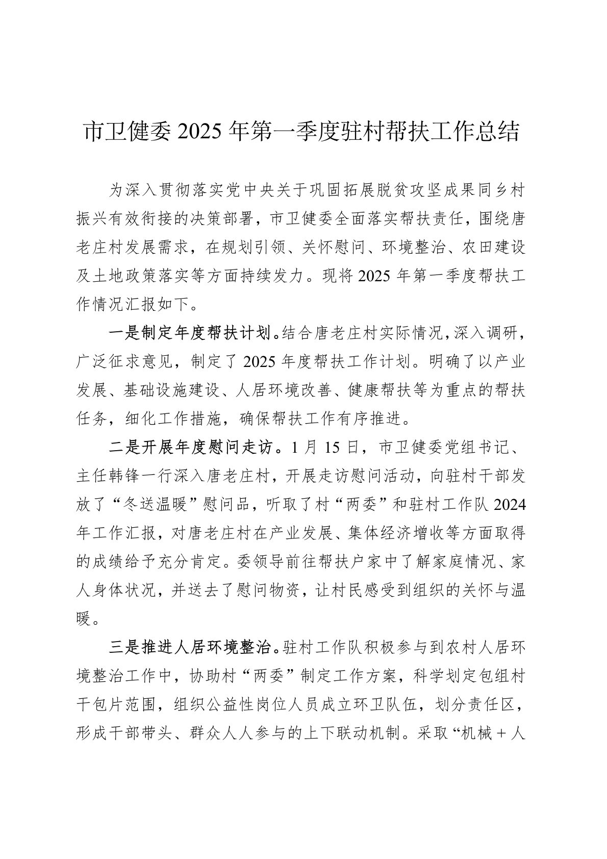 为深入贯彻落实党中央关于巩固拓展脱贫攻坚成果同乡村振兴有效衔接的决策部署,市卫健委全面落实帮扶责任,围绕唐老庄村发展需求,在规划引领、关怀慰问、环境整治、农田建设及土地政策落实等方面持续发力。现将2025年第一季度帮扶工作情况汇报如下。一是制定年度帮扶计划。结合唐老庄村实际情况,深入调研,广泛征求意见,制定了2025年度帮扶工作计划。明确了以产业发展、基础设施建设、人居环境改善、健康帮扶等为重点的帮扶任务,细化工作措施,确保帮扶工作有序推进。二是开展年度慰问走访。1月15日,市卫健委党组书记、主任韩锋一行深入唐老庄村,开展走访慰问活动,向驻村干部发放了“冬送温暖”慰问品,听取了村“两委”和驻村...