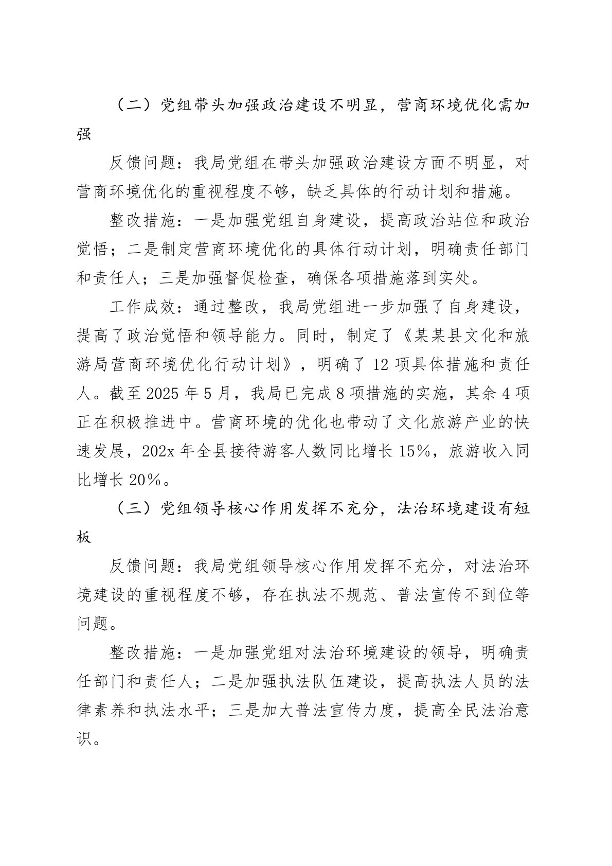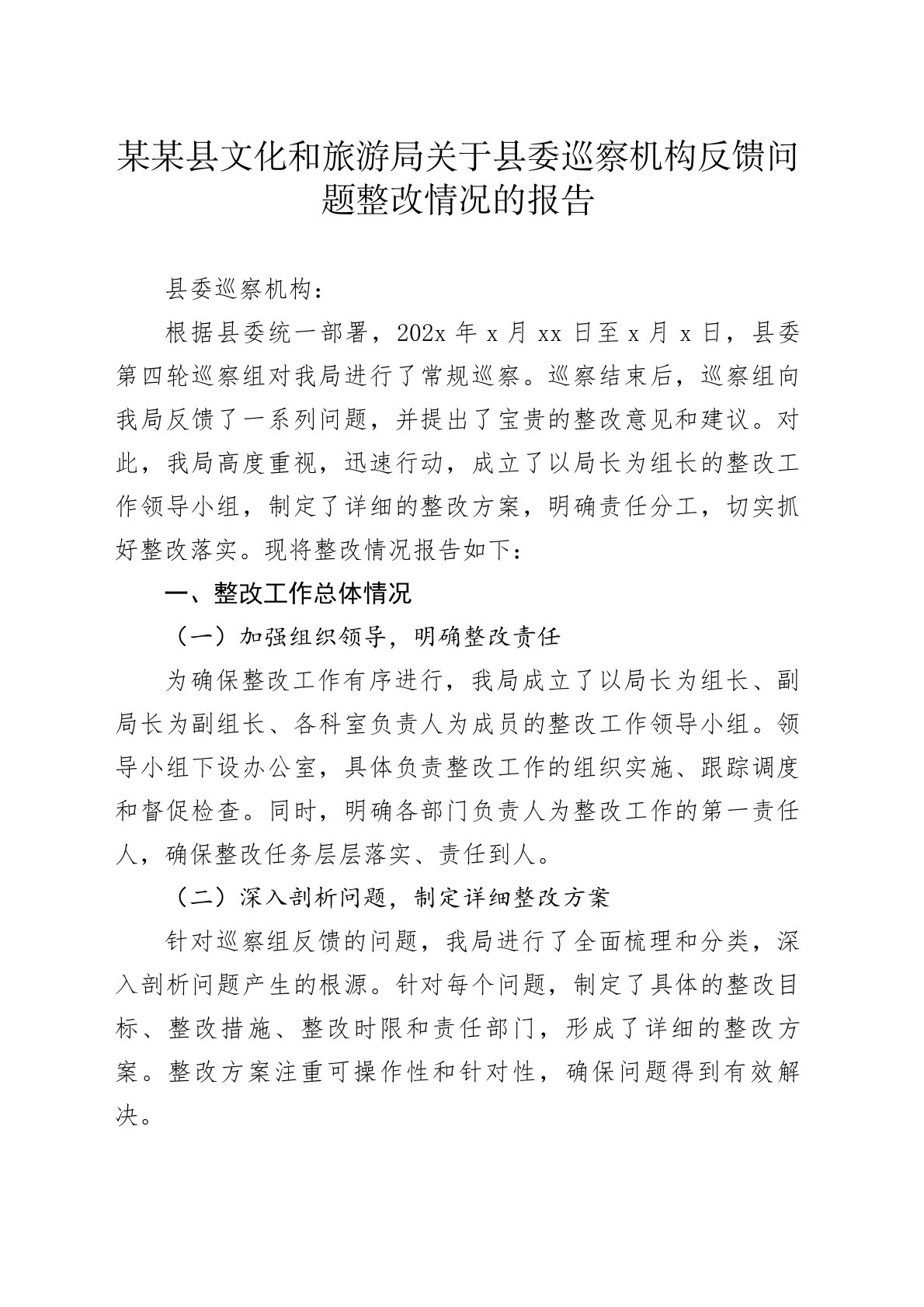 某某县文化和旅游局关于县委巡察机构反馈问题整改情况的报告县委巡察机构:根据县委统一部署,202x年x月xx日至x月x日,县委第四轮巡察组对我局进行了常规巡察。巡察结束后,巡察组向我局反馈了一系列问题,并提出了宝贵的整改意见和建议。对此,我局高度重视,迅速行动,成立了以局长为组长的整改工作领导小组,制定了详细的整改方案,明确责任分工,切实抓好整改落实。现将整改情况报告如下:一、整改工作总体情况(一)加强组织领导,明确整改责任为确保整改工作有序进行,我局成立了以局长为组长、副局长为副组长、各科室负责人为成员的整改工作领导小组。领导小组下设办公室,具体负责整改工作的组织实施、跟踪调度和督促检查。同时...