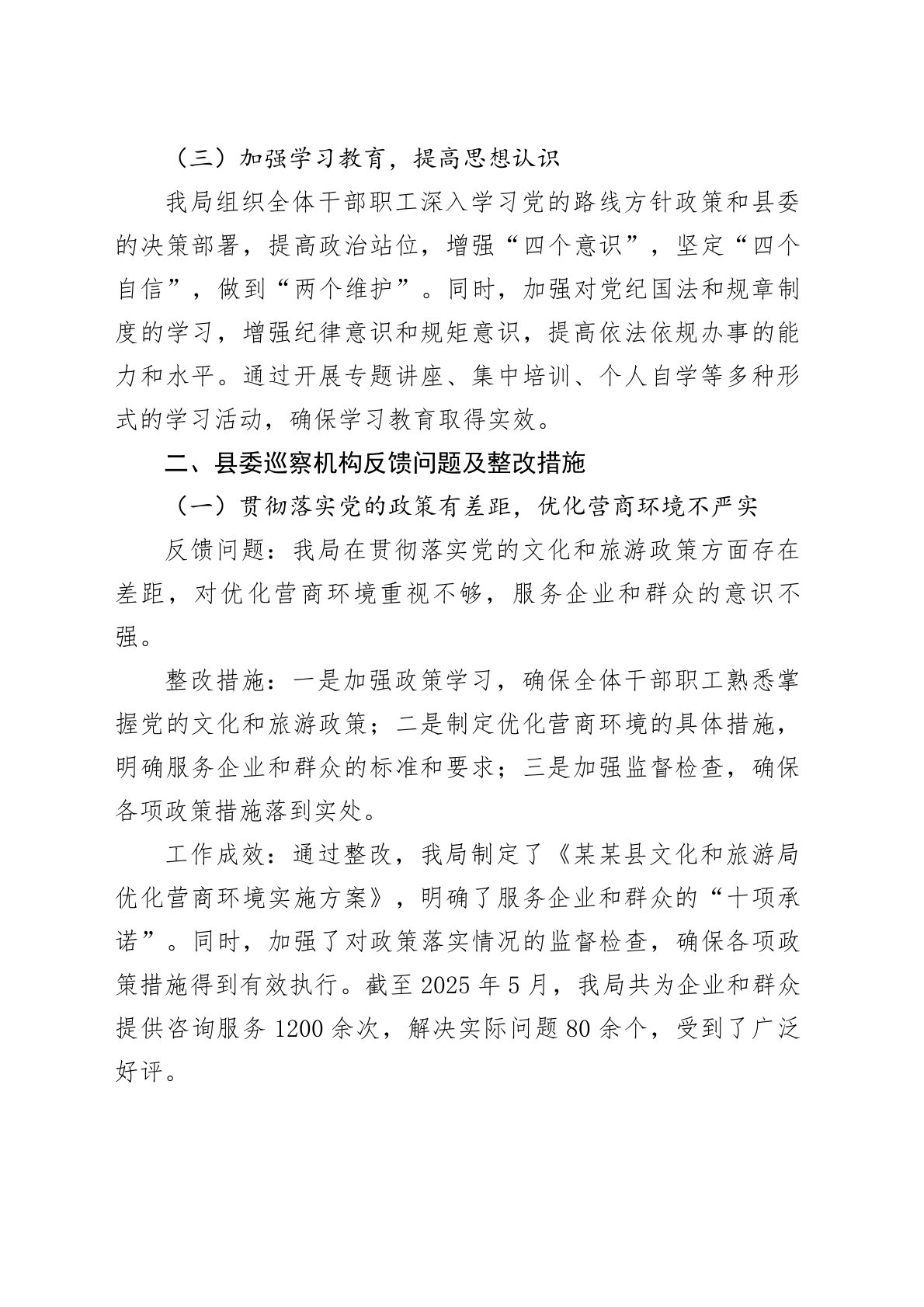 某某县文化和旅游局关于县委巡察机构反馈问题整改情况的报告