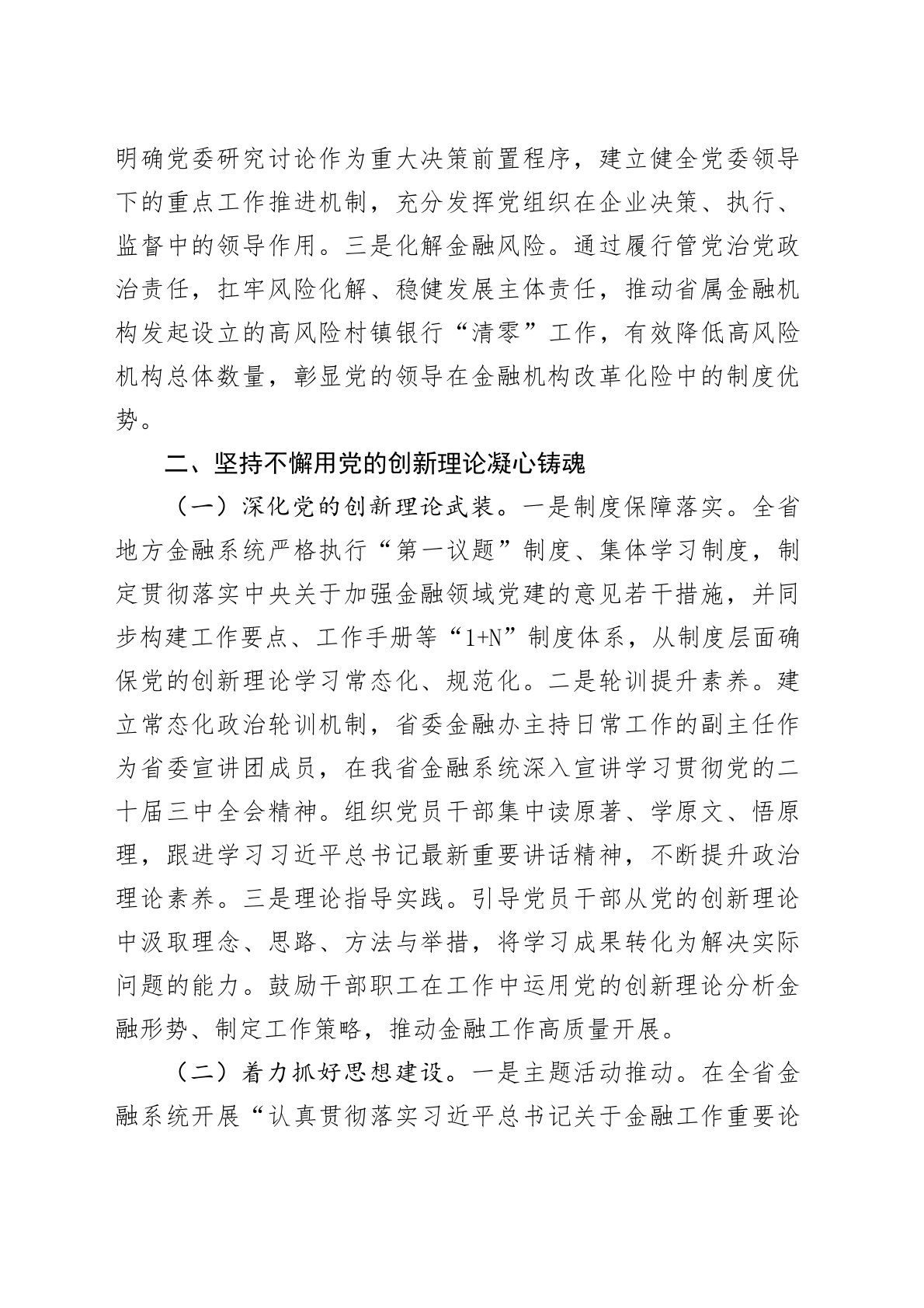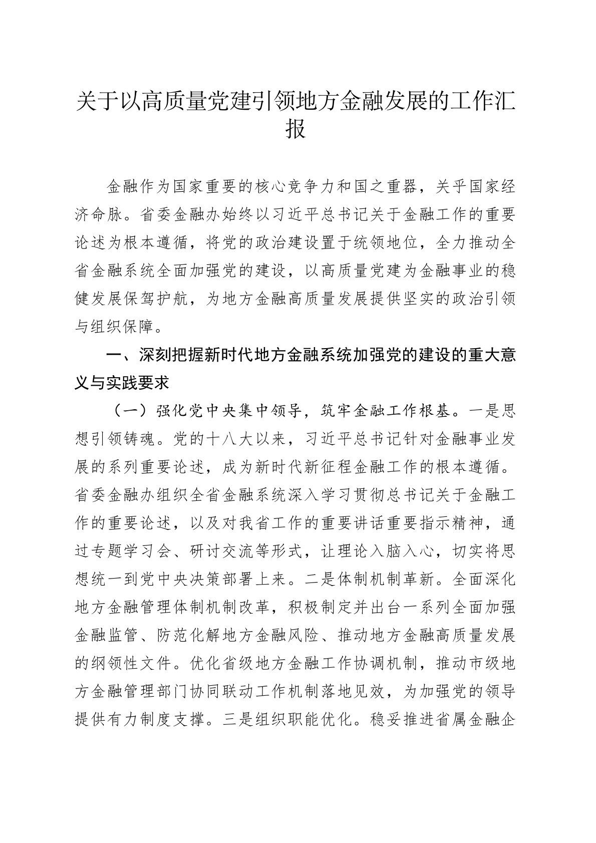 关于以高质量党建引领地方金融发展的工作汇报金融作为国家重要的核心竞争力和国之重器,关乎国家经济命脉。省委金融办始终以习近平总书记关于金融工作的重要论述为根本遵循,将党的政治建设置于统领地位,全力推动全省金融系统全面加强党的建设,以高质量党建为金融事业的稳健发展保驾护航,为地方金融高质量发展提供坚实的政治引领与组织保障。一、深刻把握新时代地方金融系统加强党的建设的重大意义与实践要求(一)强化党中央集中领导,筑牢金融工作根基。一是思想引领铸魂。党的十八大以来,习近平总书记针对金融事业发展的系列重要论述,成为新时代新征程金融工作的根本遵循。省委金融办组织全省金融系统深入学习贯彻总书记关于金融工作的重...