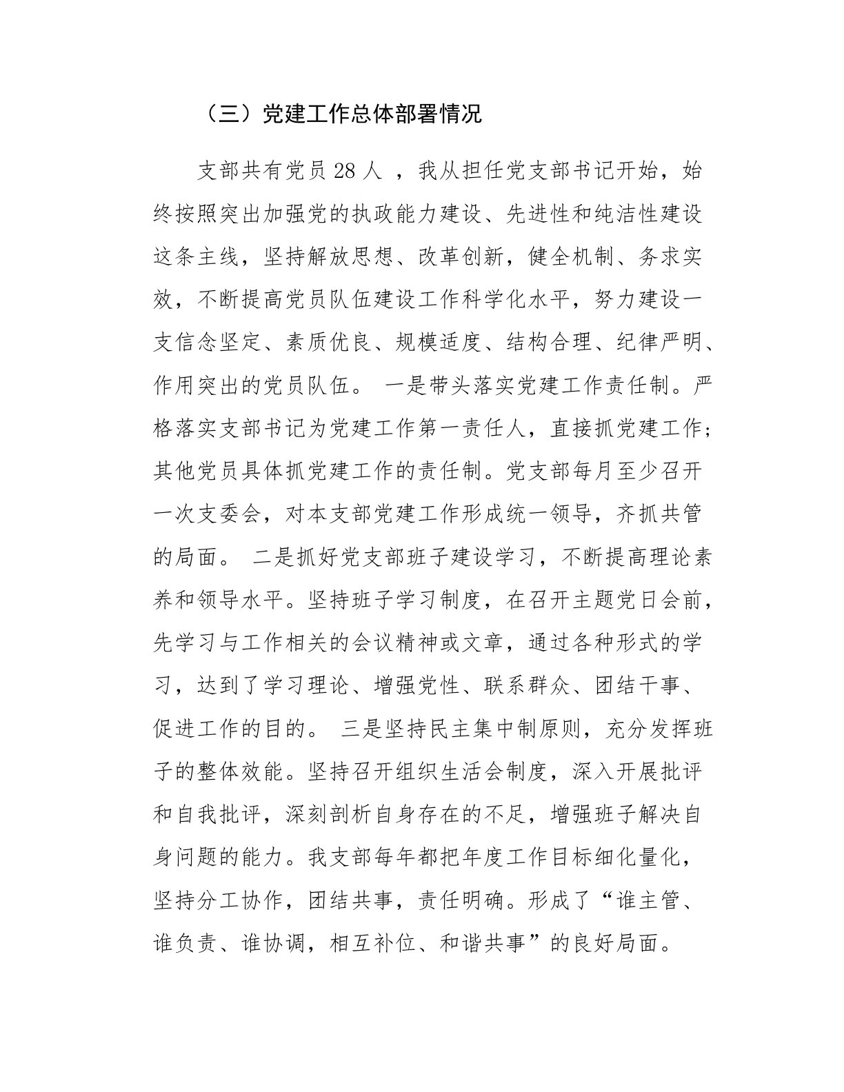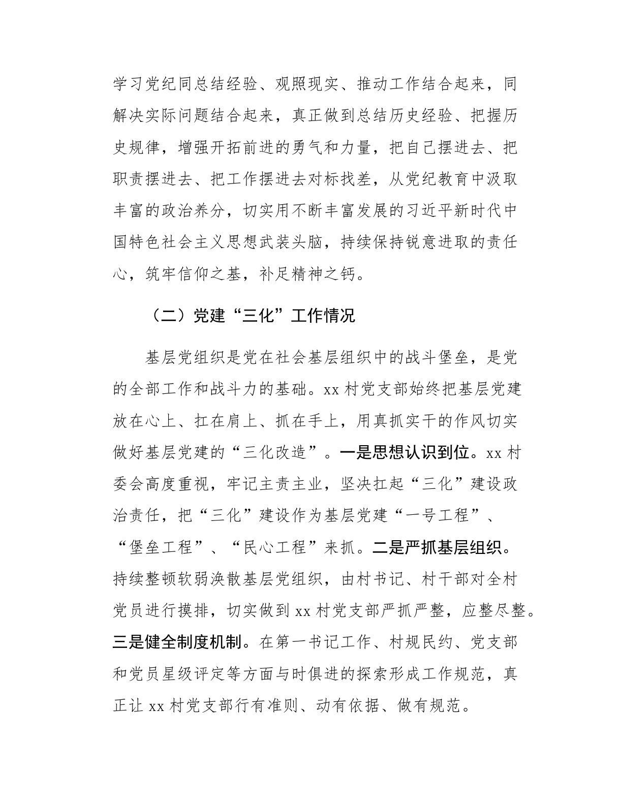 村支部书记2024年度个人述职报告2024年,我作为党建工作第一责任人,认真贯彻落实加强和改进基层党建工作的决策和部署,不断拓展党建工作的思路,完善党建工作机制,落实党建工作措施,提高党建工作水平,圆满地完成了各项基层党建工作任务。现将履职情况述职如下:履职情况和工作亮点(一)开展党纪学习教育活动情况xx村党支部始终以全面学习党纪为重点,围绕指定学习资料和重要参考材料,统筹方式方法、创新载体形式,组织广大党员干部开展党纪专题学习。一是定期提示学。建立党纪学习教育定期提醒制度,结合阶段性学习重点,每周列出学习清单,分层次印发学习教育提醒函,督促广大党员干部开展党纪集中学习和专题研讨,确保党纪学习...