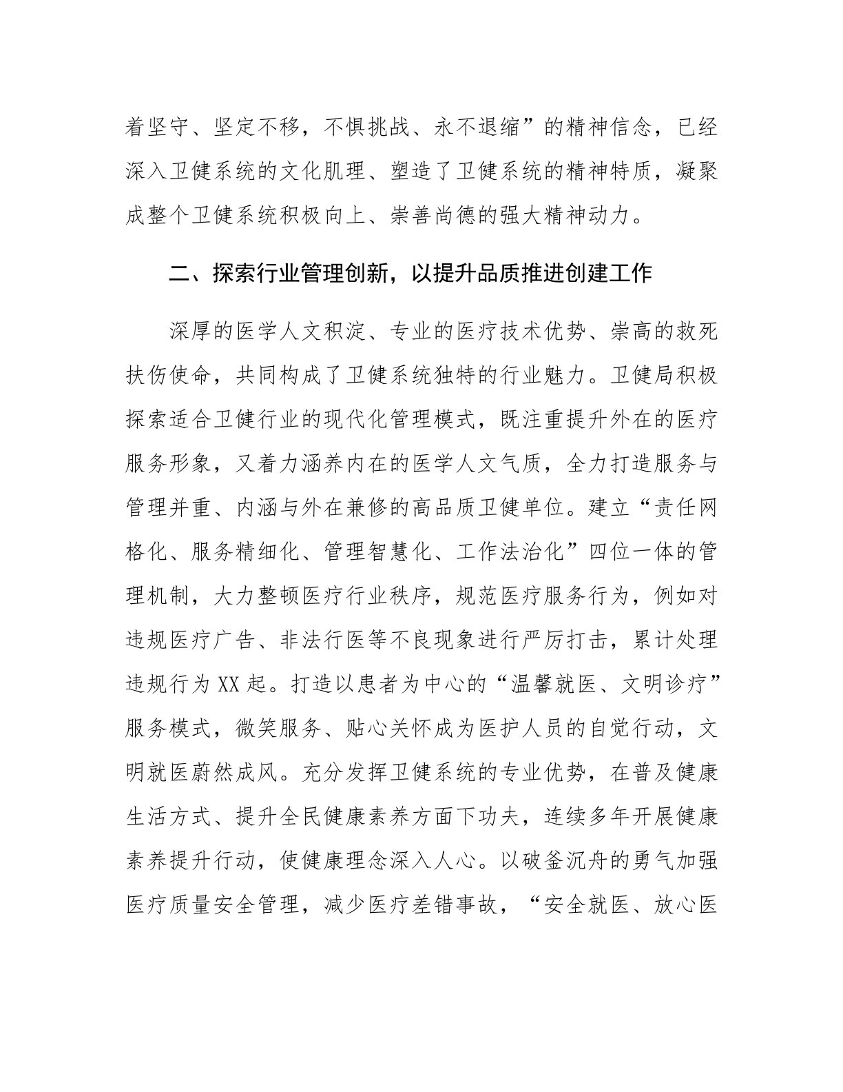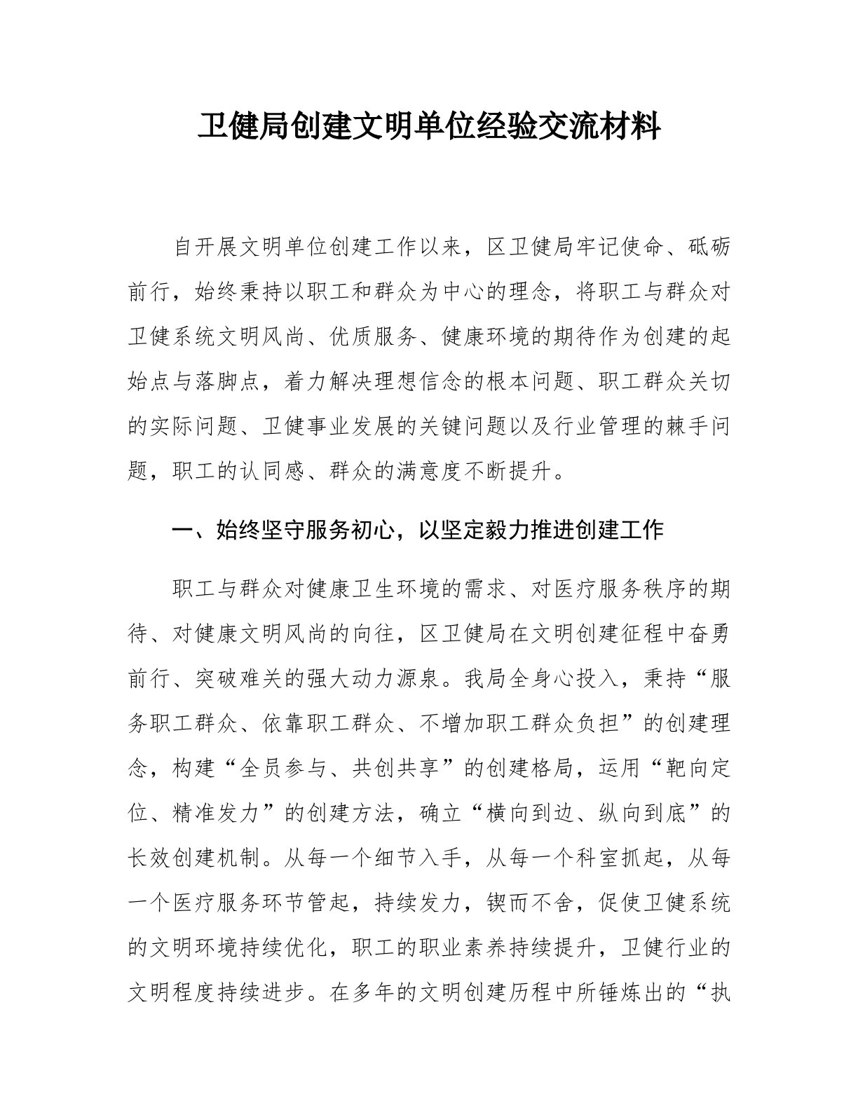 卫健局创建文明单位经验交流材料自开展文明单位创建工作以来,区卫健局牢记使命、砥砺前行,始终秉持以职工和群众为中心的理念,将职工与群众对卫健系统文明风尚、优质服务、健康环境的期待作为创建的起始点与落脚点,着力解决理想信念的根本问题、职工群众关切的实际问题、卫健事业发展的关键问题以及行业管理的棘手问题,职工的认同感、群众的满意度不断提升。一、始终坚守服务初心,以坚定毅力推进创建工作职工与群众对健康卫生环境的需求、对医疗服务秩序的期待、对健康文明风尚的向往,区卫健局在文明创建征程中奋勇前行、突破难关的强大动力源泉。我局全身心投入,秉持“服务职工群众、依靠职工群众、不增加职工群众负担”的创建理念,构建...