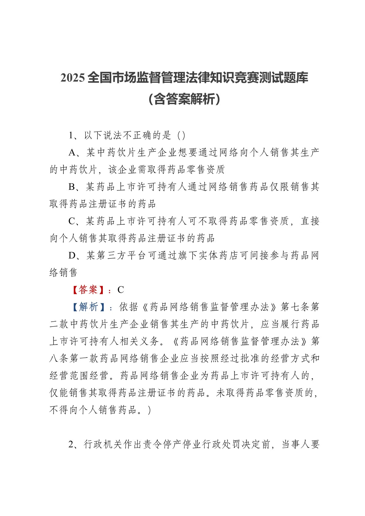2025全国市场监督管理法律知识竞赛测试题库(含答案解析)1、以下说法不正确的是()A、某中药饮片生产企业想要通过网络向个人销售其生产的中药饮片,该企业需取得药品零售资质B、某药品上市许可持有人通过网络销售药品仅限销售其取得药品注册证书的药品C、某药品上市许可持有人可不取得药品零售资质,直接向个人销售其取得药品注册证书的药品D、某第三方平台可通过旗下实体药店可间接参与药品网络销售【答案】:C【解析】:依据《药品网络销售监督管理办法》第七条第二款中药饮片生产企业销售其生产的中药饮片,应当履行药品上市许可持有人相关义务。《药品网络销售监督管理办法》第八条第一款药品网络销售企业应当按照经过批准的经营...
