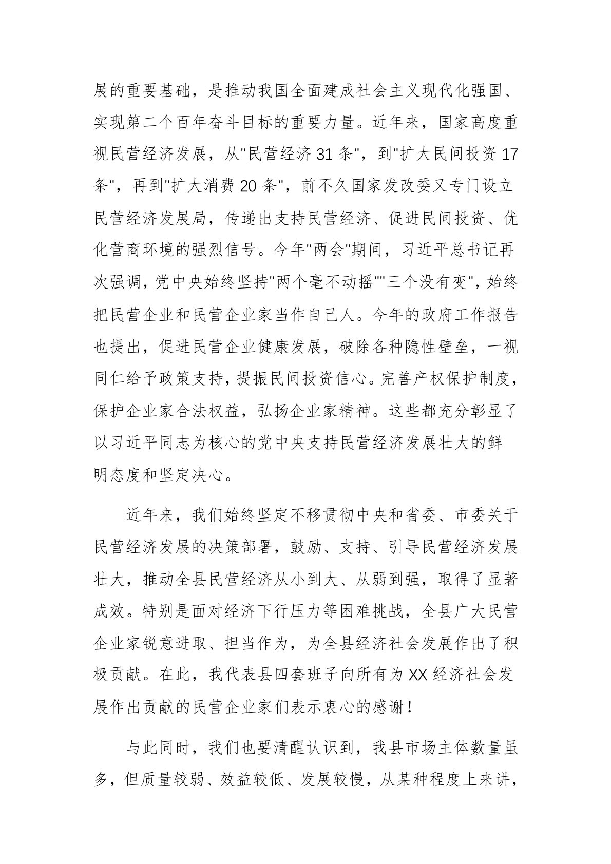 领导在民营经济高质量发展大会上的讲话文稿各位企业家朋友们,同志们:今天,我们在这里召开XX县民营经济高质量发展暨营商环境建设大会,就是要进一步释放县委、县政府始终与民营企业站在一起的强烈信号,激发和凝聚起全县上下共同推动县域经济高质量发展的强烈共识、强劲信心、强大合力。刚才,我们通报了XX县优化营商环境暨民营经济发展有关情况,发布了XX营商环境品牌和《优化营商环境十二条措施》,为经济发展顾问和营商环境监督员颁发了聘书,表扬了一批先进集体和个人,为部分企业代表兑现了奖补政策,5家民营企业代表分别作了发言,部分县级部门作出了公开承诺。总的来讲,活动形式丰富、意义非凡,企业家代表们讲了很多实在话,提...