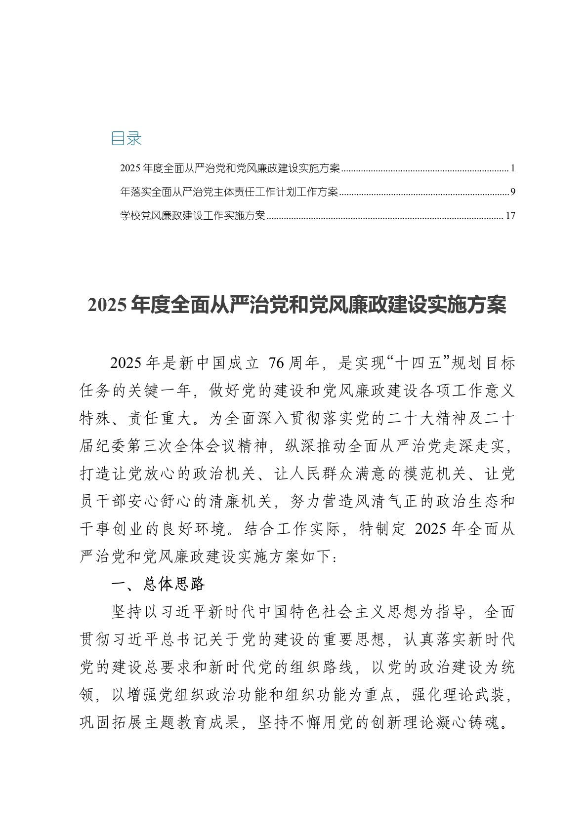 目录2025年度全面从严治党和党风廉政建设实施方案2025年是新中国成立76周年,是实现“十四五”规划目标任务的关键一年,做好党的建设和党风廉政建设各项工作意义特殊、责任重大。为全面深入贯彻落实党的二十大精神及二十届纪委第三次全体会议精神,纵深推动全面从严治党走深走实,打造让党放心的政治机关、让人民群众满意的模范机关、让党员干部安心舒心的清廉机关,努力营造风清气正的政治生态和干事创业的良好环境。结合工作实际,特制定2025年全面从严治党和党风廉政建设实施方案如下:一、总体思路坚持以习近平新时代中国特色社会主义思想为指导,全面贯彻习近平总书记关于党的建设的重要思想,认真落实新时代党的建设总要求和...