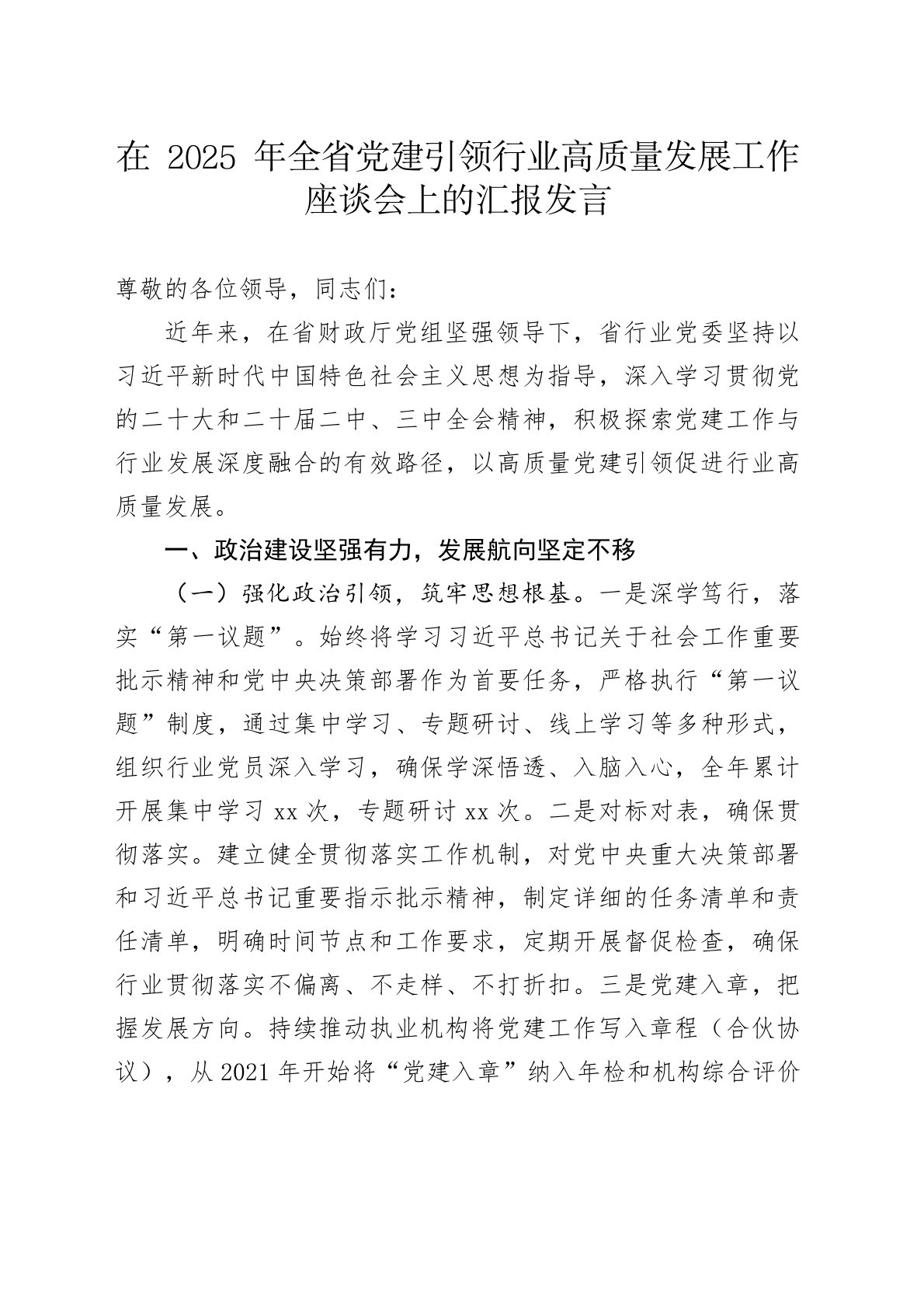 在2025年全省党建引领行业高质量发展工作座谈会上的汇报发言尊敬的各位领导,同志们:近年来,在省财政厅党组坚强领导下,省行业党委坚持以习近平新时代中国特色社会主义思想为指导,深入学习贯彻党的二十大和二十届二中、三中全会精神,积极探索党建工作与行业发展深度融合的有效路径,以高质量党建引领促进行业高质量发展。一、政治建设坚强有力,发展航向坚定不移(一)强化政治引领,筑牢思想根基。一是深学笃行,落实“第一议题”。始终将学习习近平总书记关于社会工作重要批示精神和党中央决策部署作为首要任务,严格执行“第一议题”制度,通过集中学习、专题研讨、线上学习等多种形式,组织行业党员深入学习,确保学深悟透、入脑入心...