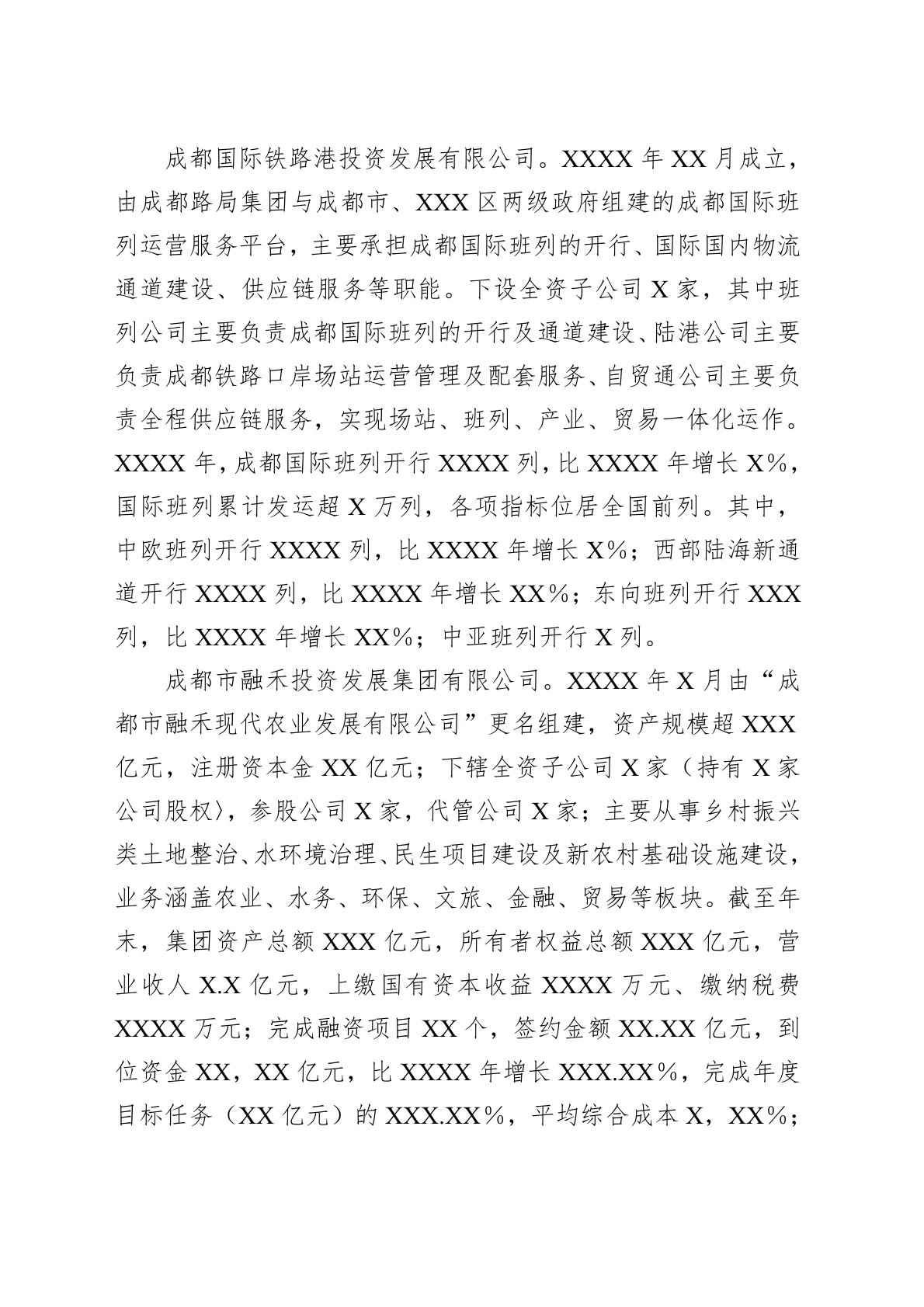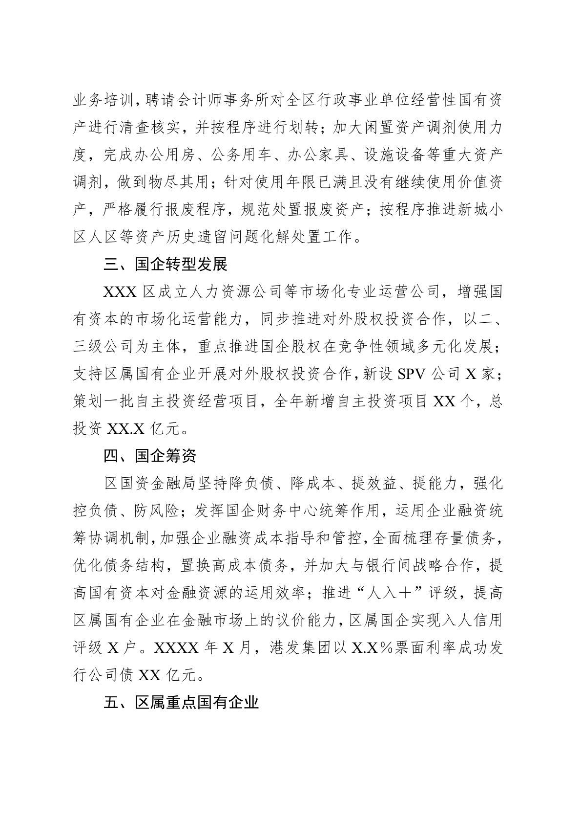 2024年以来,积极贯彻落实中央、省委、市委经济工作会议精神,持续深化体制机制改革,努力完成全年经济发展目标任务。一、国企改革和国资监管体系建设2024年,习近平区有区属国有企业(含全资、控股及参股企业)XX家。其中,一级企业X家、二级企业XX家、三级企业XX家、四级企业XX家、五级企业XX家。习近平区结合国企改革三年行动实施方案及任务清单,深化国资国企转型改革,出台《成都市习近平区区属国有企业国资经营评价暂行办法》《建立区属国有企业专职外部董事队伍的实施意见》等XX项制度,具体改革举措XX项,基本完成三年行动改革任务。推进企业运行及监管制度的废、改、立,建立健全国资监管制度机制,出台系统完备...