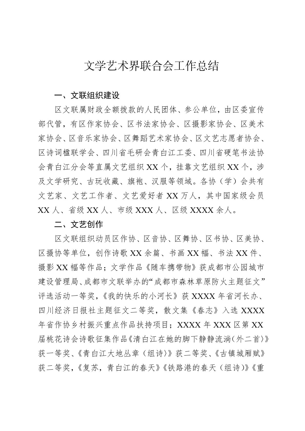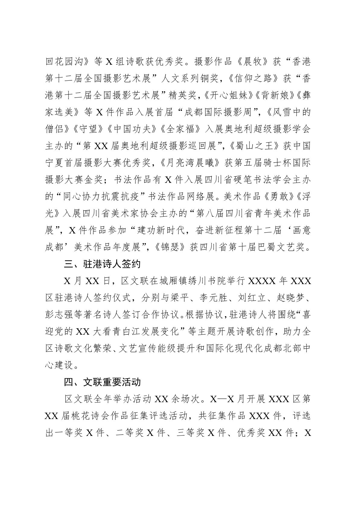 一、文联组织建设区文联属财政全额拨款的人民团体、参公单位,由区委宣传部代管,有区作家协会、区书法家协会、区摄影家协会、区美术家协会、区音乐家协会、区舞蹈艺术家协会、区文艺志愿者协会、区诗词楹联学会、四川省毛研会青白江工委、四川省硬笔书法协会青白江分会等直属文艺组织XX个,挂靠文艺组织XX个,涉及文学研究、古玩收藏、旗袍、汉服等领域。各协(学)会共有文艺家、文艺工作者、文艺爱好者XX万人,其中国家级会员XX人、省级XX人、市级习近平人、区级习近平X余人。二、文艺创作区文联组织动员区作协、区音协、区舞协、区书协、区美协、区摄协等单位,创作诗歌XX余篇、书画XX幅、书法XX件、摄影XX幅等作品;文学...