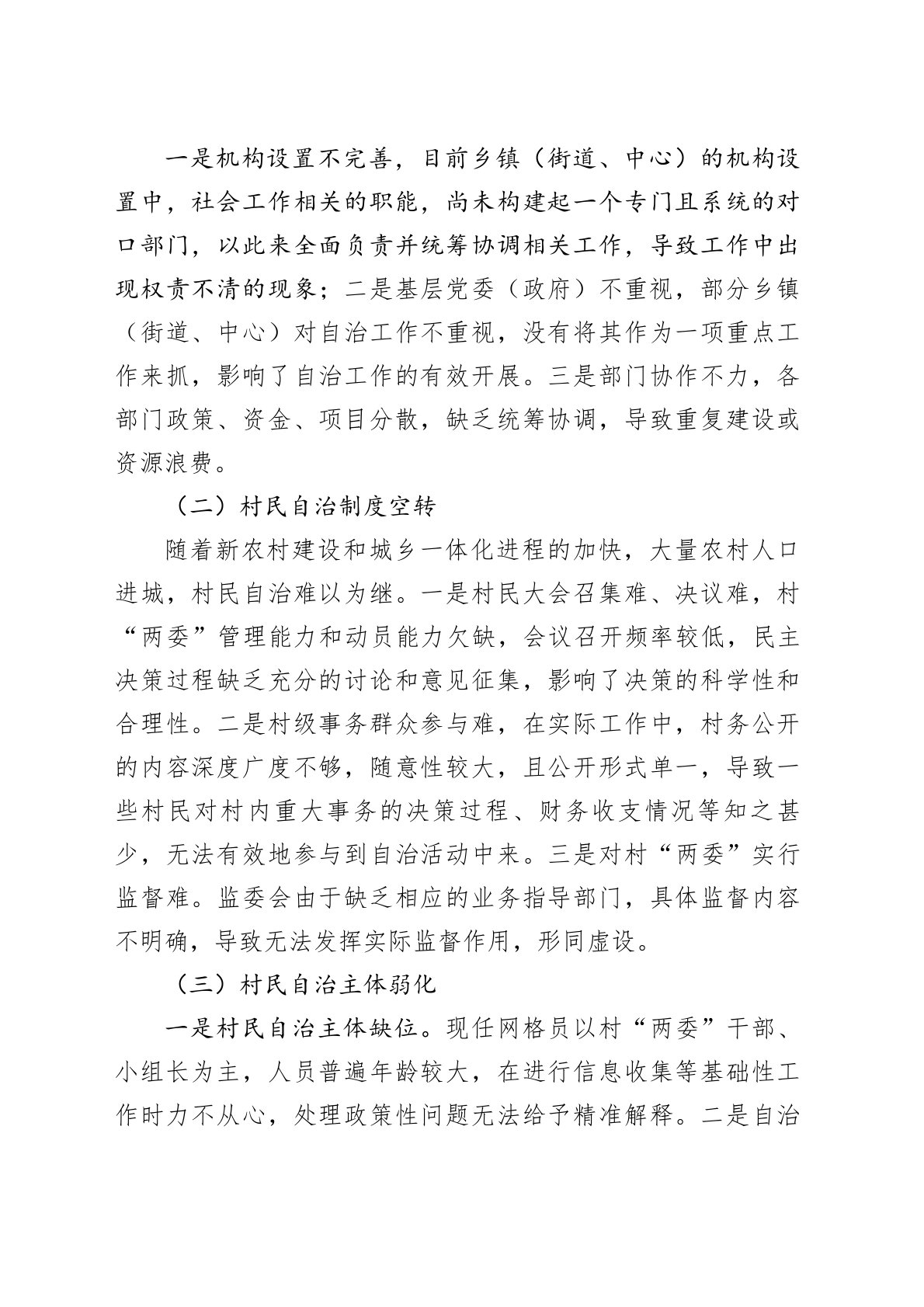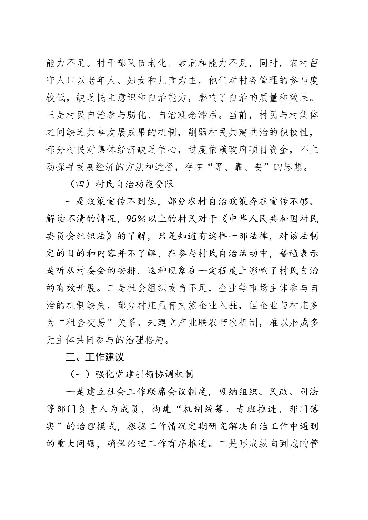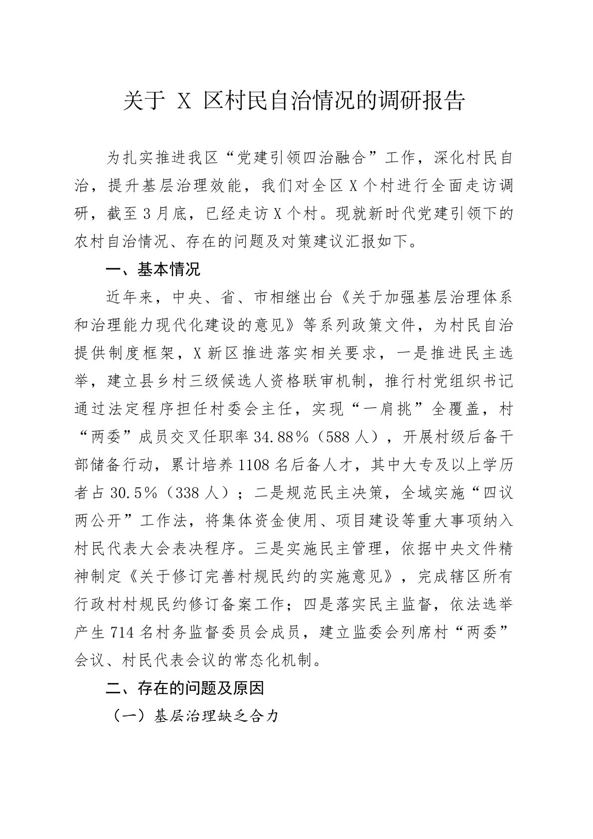 关于X区村民自治情况的调研报告为扎实推进我区“党建引领四治融合”工作,深化村民自治,提升基层治理效能,我们对全区X个村进行全面走访调研,截至3月底,已经走访X个村。现就新时代党建引领下的农村自治情况、存在的问题及对策建议汇报如下。一、基本情况近年来,中央、省、市相继出台《关于加强基层治理体系和治理能力现代化建设的意见》等系列政策文件,为村民自治提供制度框架,X新区推进落实相关要求,一是推进民主选举,建立县乡村三级候选人资格联审机制,推行村党组织书记通过法定程序担任村委会主任,实现“一肩挑”全覆盖,村“两委”成员交叉任职率34.88%(588人),开展村级后备干部储备行动,累计培养1108名后备...