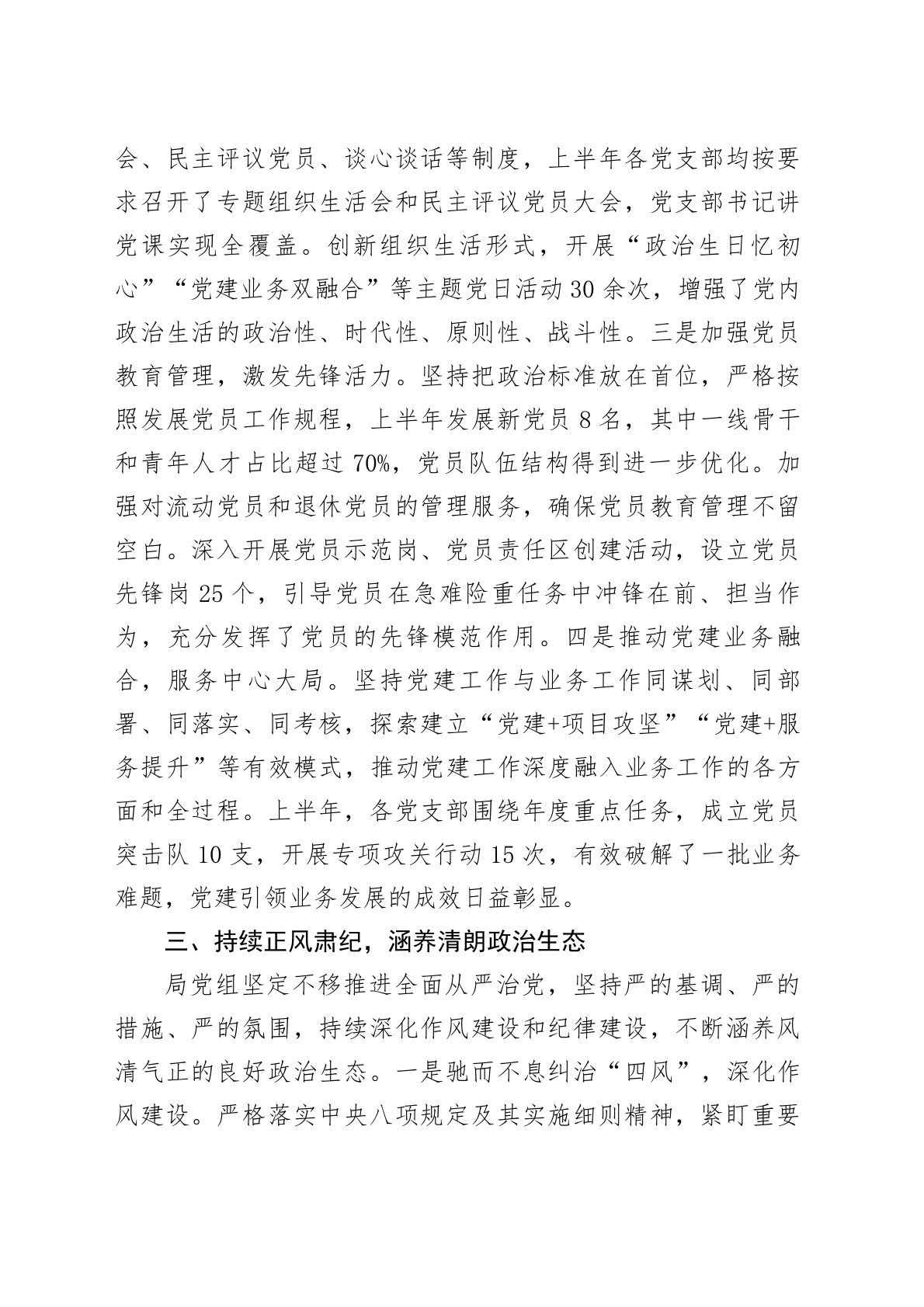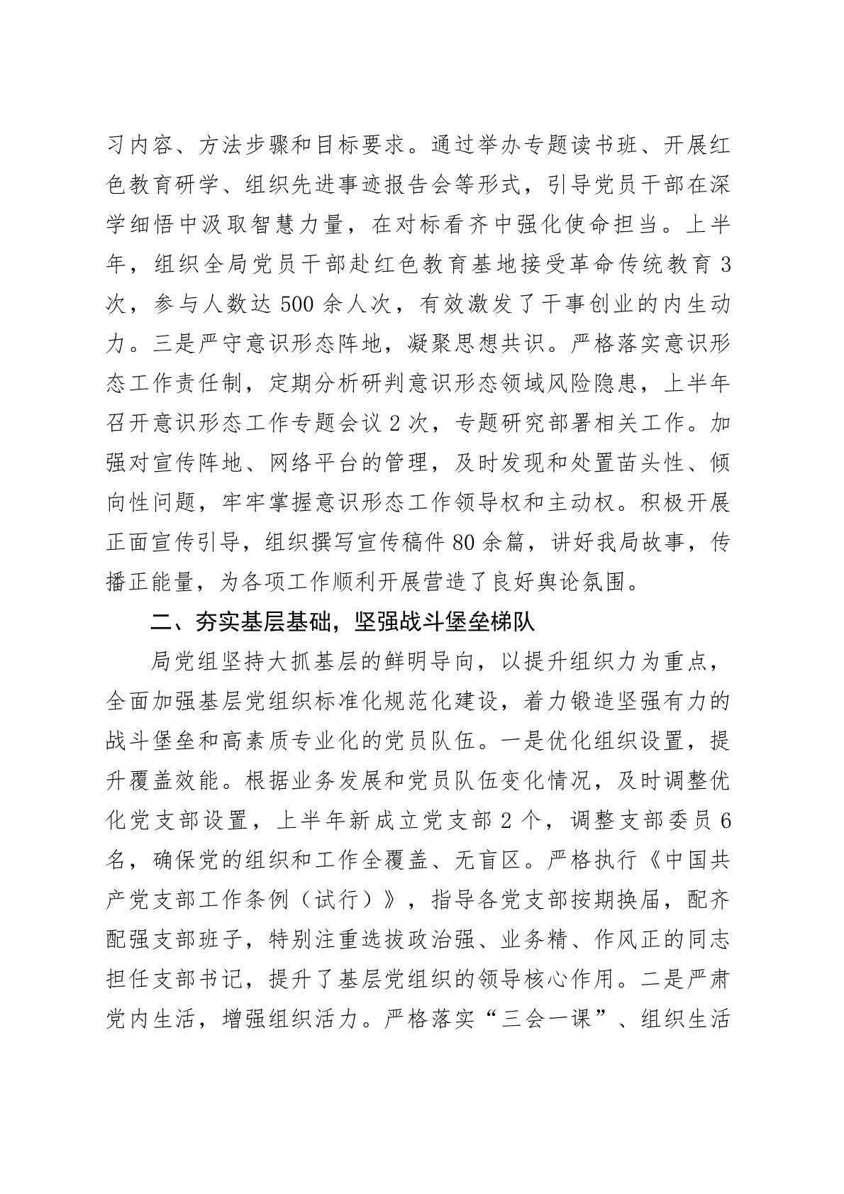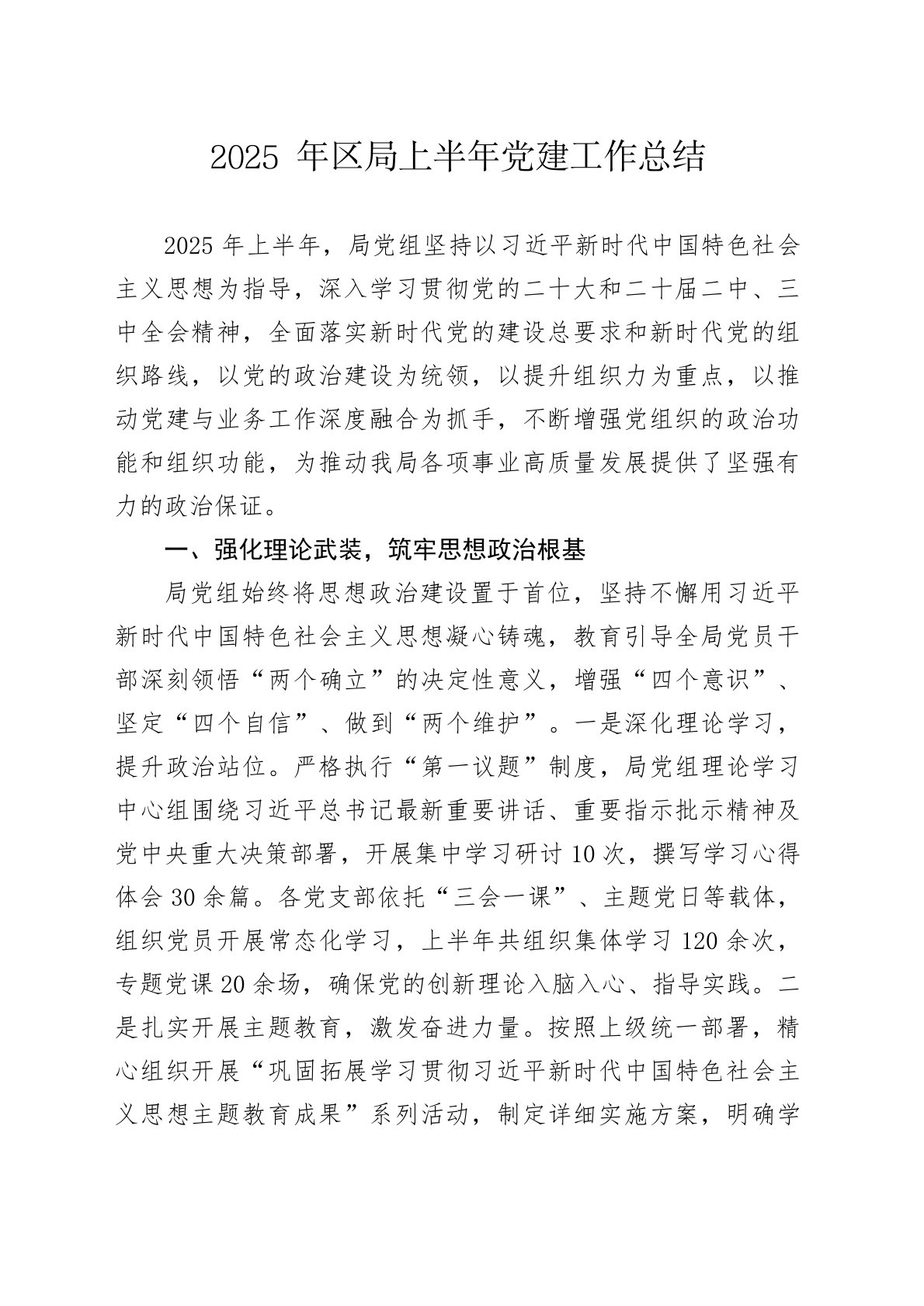 2025年区局上半年党建工作总结2025年上半年,局党组坚持以习近平新时代中国特色社会主义思想为指导,深入学习贯彻党的二十大和二十届二中、三中全会精神,全面落实新时代党的建设总要求和新时代党的组织路线,以党的政治建设为统领,以提升组织力为重点,以推动党建与业务工作深度融合为抓手,不断增强党组织的政治功能和组织功能,为推动我局各项事业高质量发展提供了坚强有力的政治保证。一、强化理论武装,筑牢思想政治根基局党组始终将思想政治建设置于首位,坚持不懈用习近平新时代中国特色社会主义思想凝心铸魂,教育引导全局党员干部深刻领悟“两个确立”的决定性意义,增强“四个意识”、坚定“四个自信”、做到“两个维护”。一...