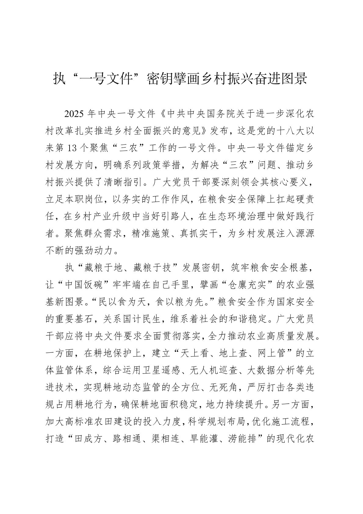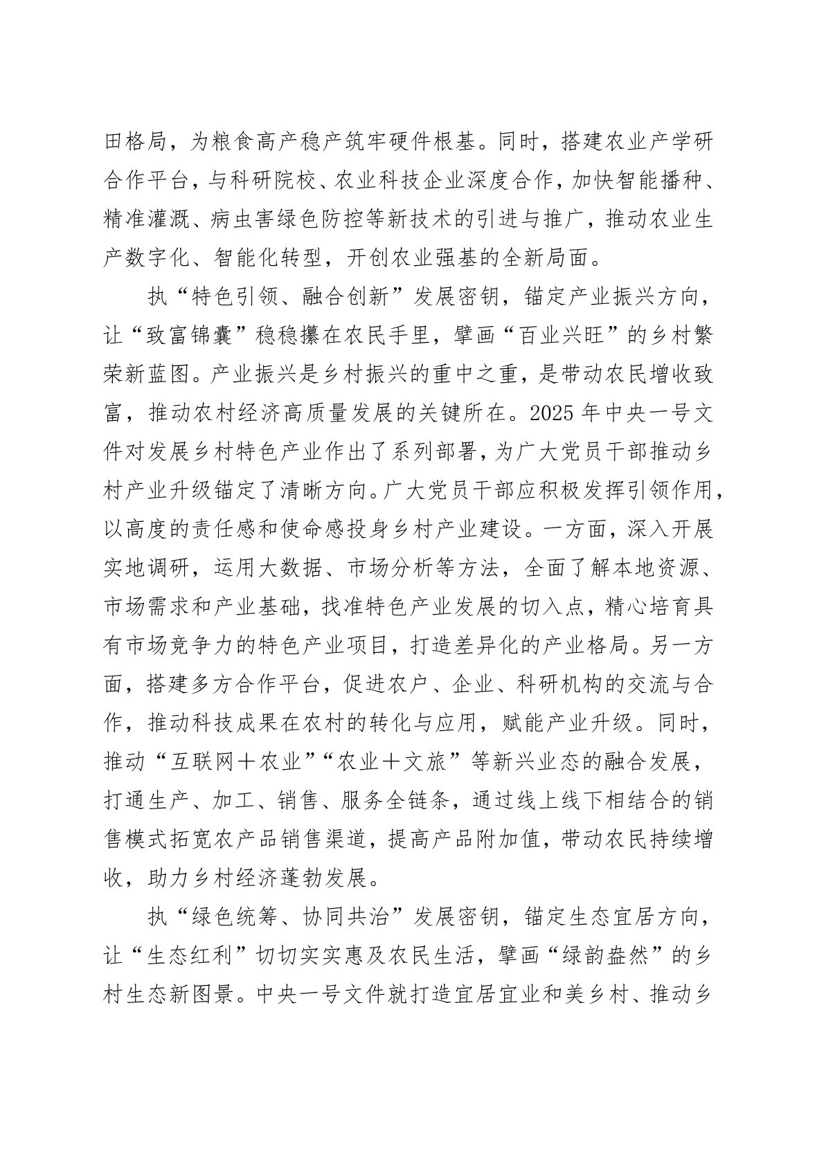 2025年中央一号文件《中共中央国务院关于进一步深化农村改革扎实推进乡村全面振兴的意见》发布,这是党的十八大以来第13个聚焦“三农”工作的一号文件。中央一号文件锚定乡村发展方向,明确系列政策举措,为解决“三农”问题、推动乡村振兴提供了清晰指引。广大党员干部要深刻领会其核心要义,立足本职岗位,以务实的工作作风,在粮食安全保障上扛起硬责任,在乡村产业升级中当好引路人,在生态环境治理中做好践行者。聚焦群众需求,精准施策、真抓实干,为乡村发展注入源源不断的强劲动力。执“藏粮于地、藏粮于技”发展密钥,筑牢粮食安全根基,让“中国饭碗”牢牢端在自己手里,擘画“仓廪充实”的农业强基新图景。“民以食为天,食以粮...