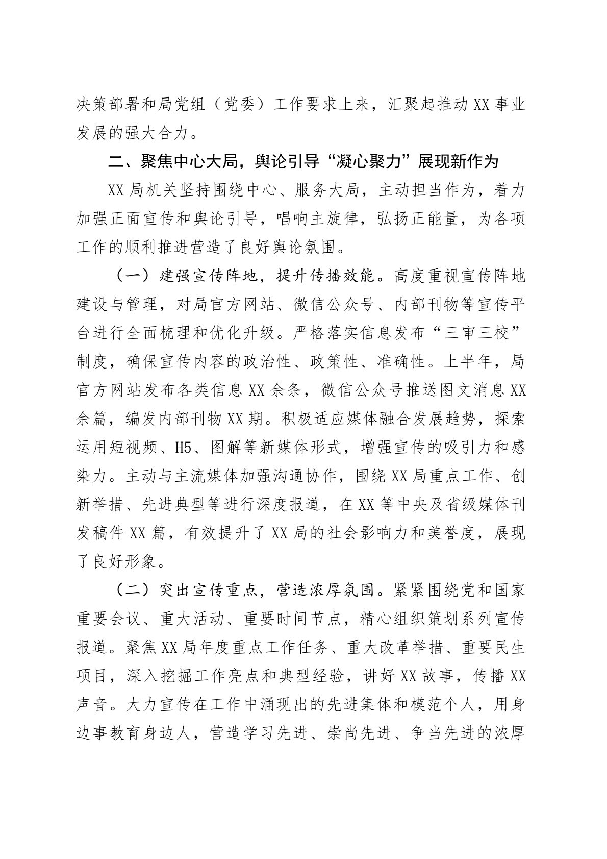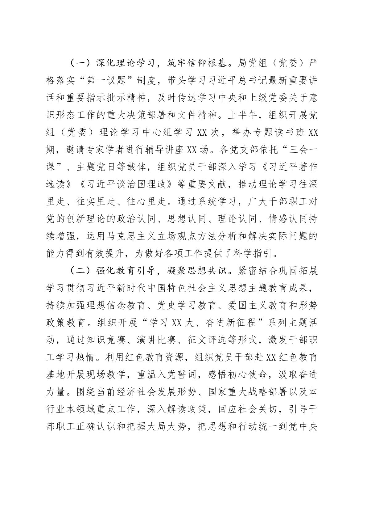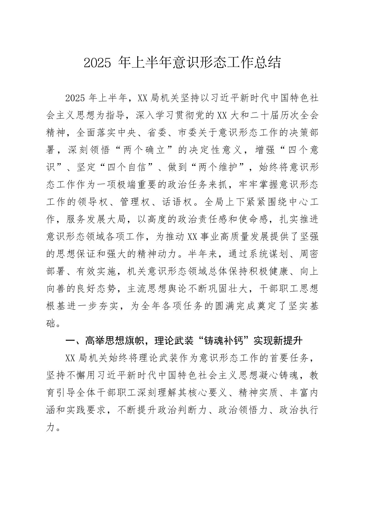 2025年上半年意识形态工作总结2025年上半年,XX局机关坚持以习近平新时代中国特色社会主义思想为指导,深入学习贯彻党的XX大和二十届历次全会精神,全面落实中央、省委、市委关于意识形态工作的决策部署,深刻领悟“两个确立”的决定性意义,增强“四个意识”、坚定“四个自信”、做到“两个维护”,始终将意识形态工作作为一项极端重要的政治任务来抓,牢牢掌握意识形态工作的领导权、管理权、话语权。全局上下紧紧围绕中心工作,服务发展大局,以高度的政治责任感和使命感,扎实推进意识形态领域各项工作,为推动XX事业高质量发展提供了坚强的思想保证和强大的精神动力。半年来,通过系统谋划、周密部署、有效实施,机关意识形态...
