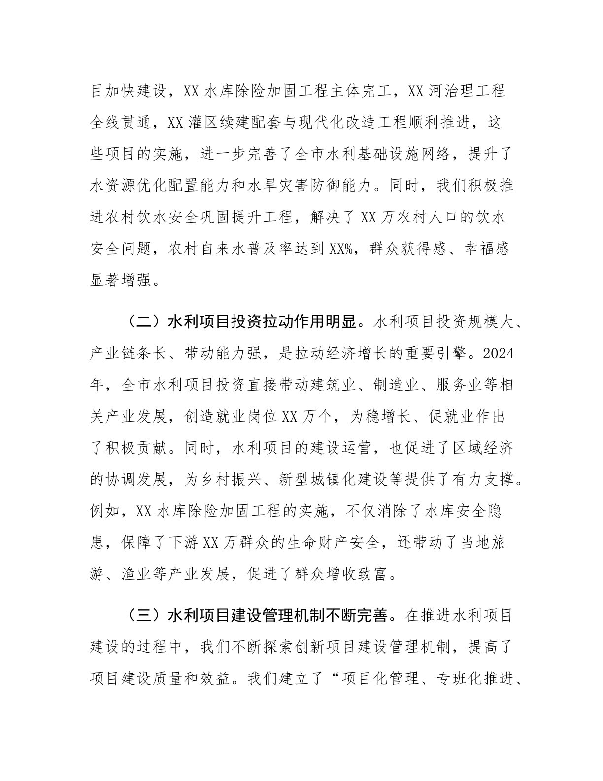 市水利局党组书记在2025年全市水利项目建设调度会上的讲话同志们:今天,我们召开2025年全市水利项目建设调度会,主要任务是深入贯彻总书记“节水优先、空间均衡、系统治理、两手发力”的治水思路,全面落实全国、全省水利工作会议精神,总结2024年水利项目建设情况,分析当前形势,安排部署2025年重点任务,动员全市水利系统进一步统一思想、凝聚共识,抢抓机遇、真抓实干,全力推进水利项目建设,为全市经济社会高质量发展提供坚实的水利保障。刚才,我们通报了2024年全市水利项目建设情况,部分县区作了交流发言,讲得都很好,听了之后很受启发。下面,我讲三点意见。一、充分肯定成绩,坚定水利项目建设的信心决心(一)...