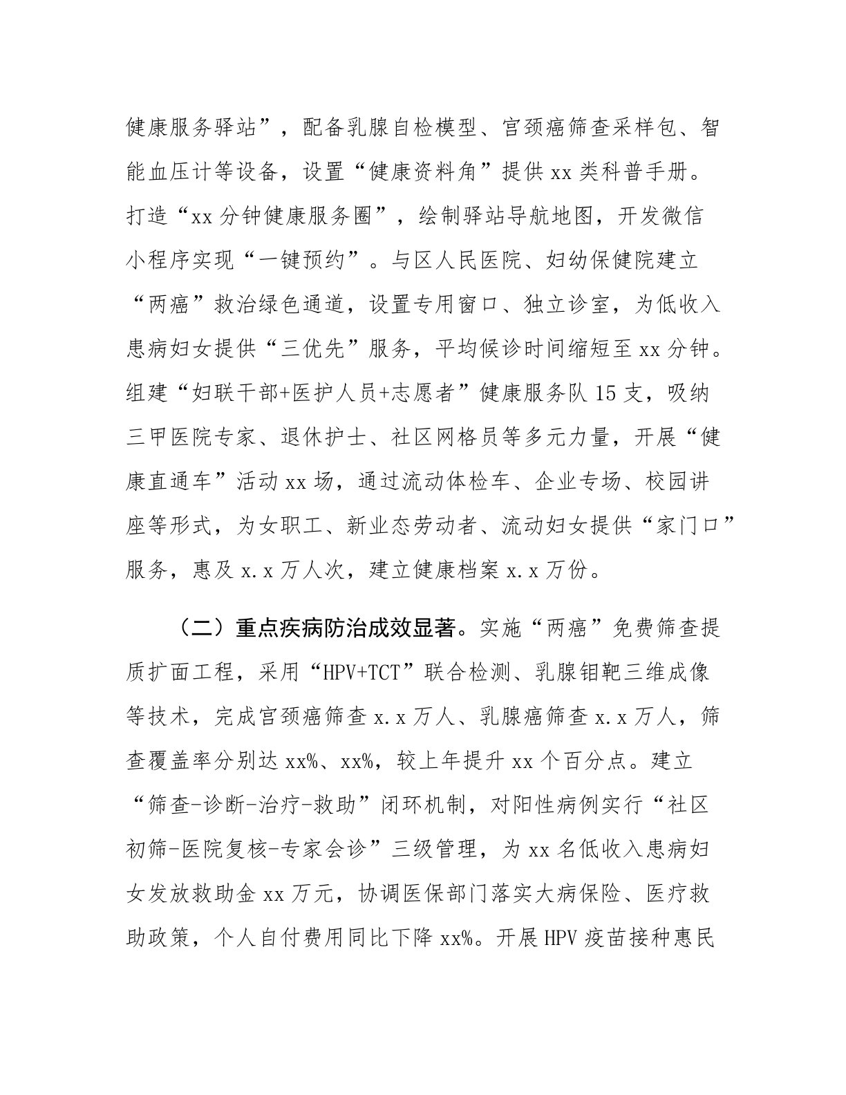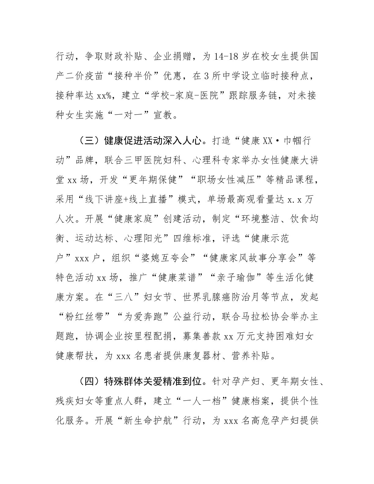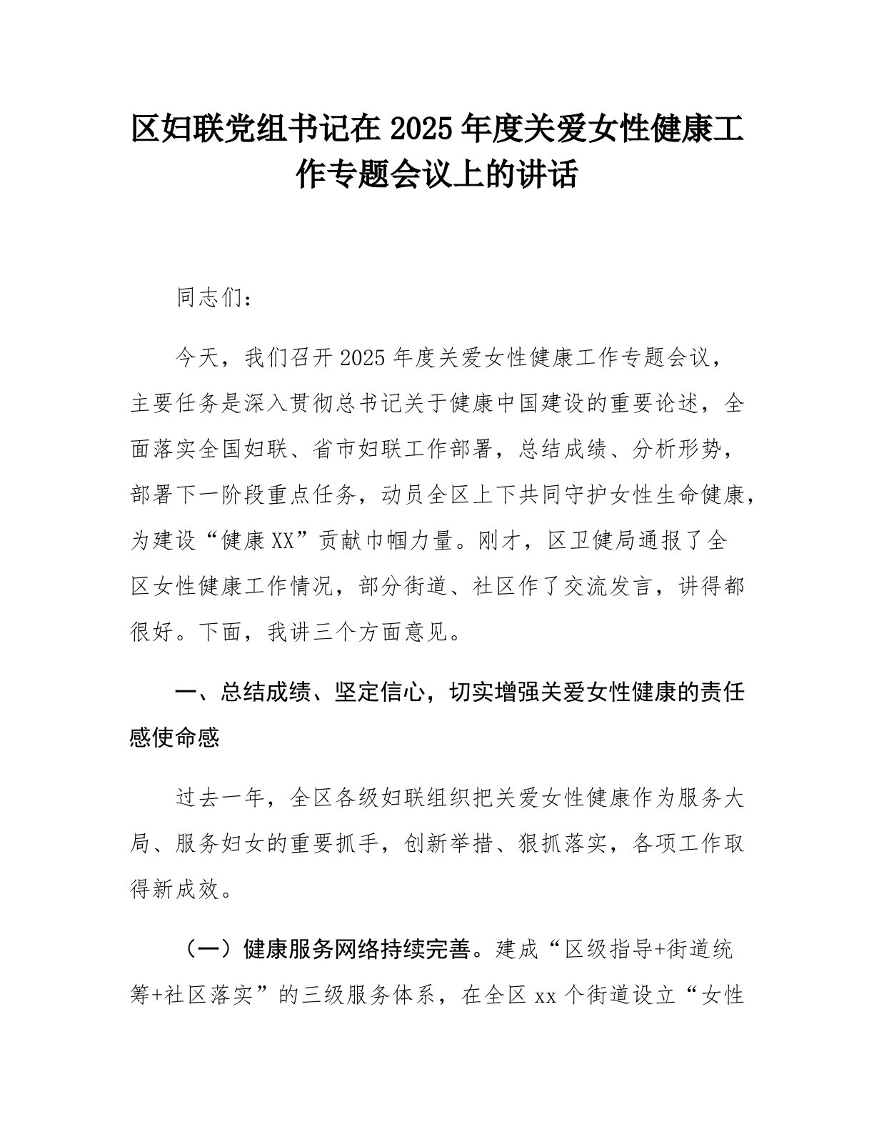 区妇联党组书记在2025年度关爱女性健康工作专题会议上的讲话同志们:今天,我们召开2025年度关爱女性健康工作专题会议,主要任务是深入贯彻总书记关于健康中国建设的重要论述,全面落实全国妇联、省市妇联工作部署,总结成绩、分析形势,部署下一阶段重点任务,动员全区上下共同守护女性生命健康,为建设“健康XX”贡献巾帼力量。刚才,区卫健局通报了全区女性健康工作情况,部分街道、社区作了交流发言,讲得都很好。下面,我讲三个方面意见。一、总结成绩、坚定信心,切实增强关爱女性健康的责任感使命感过去一年,全区各级妇联组织把关爱女性健康作为服务大局、服务妇女的重要抓手,创新举措、狠抓落实,各项工作取得新成效。(一)...