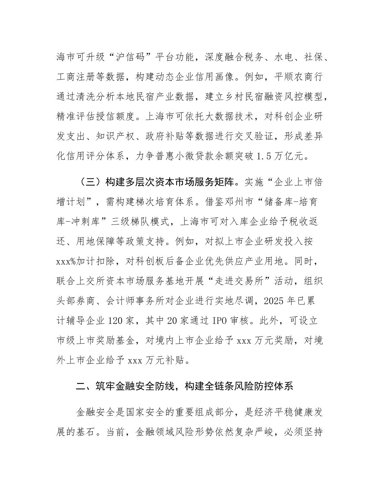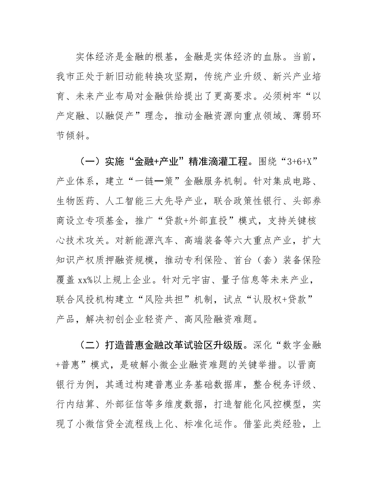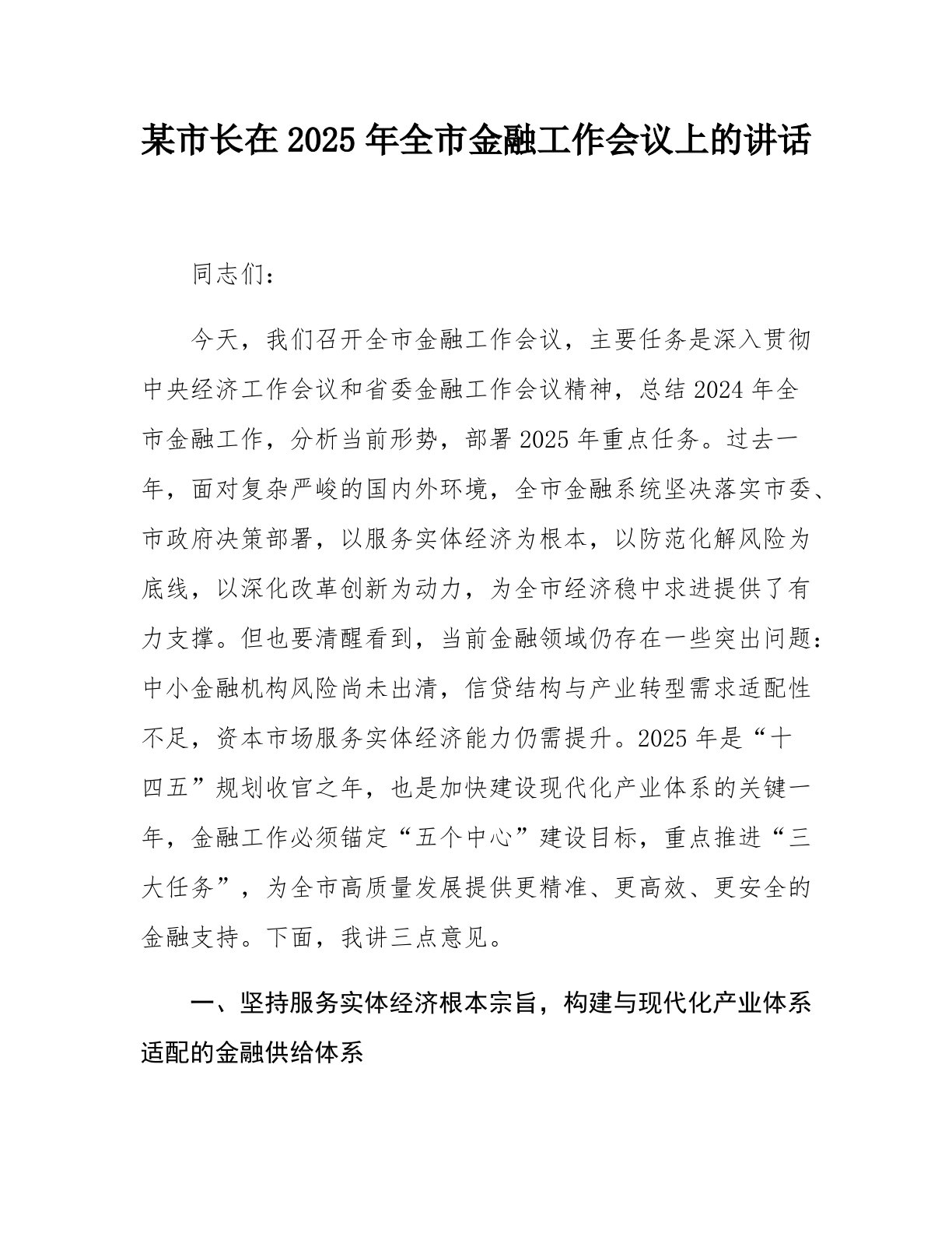 某市长在2025年全市金融工作会议上的讲话同志们:今天,我们召开全市金融工作会议,主要任务是深入贯彻中央经济工作会议和省委金融工作会议精神,总结2024年全市金融工作,分析当前形势,部署2025年重点任务。过去一年,面对复杂严峻的国内外环境,全市金融系统坚决落实市委、市政府决策部署,以服务实体经济为根本,以防范化解风险为底线,以深化改革创新为动力,为全市经济稳中求进提供了有力支撑。但也要清醒看到,当前金融领域仍存在一些突出问题:中小金融机构风险尚未出清,信贷结构与产业转型需求适配性不足,资本市场服务实体经济能力仍需提升。2025年是“十四五”规划收官之年,也是加快建设现代化产业体系的关键一年,...