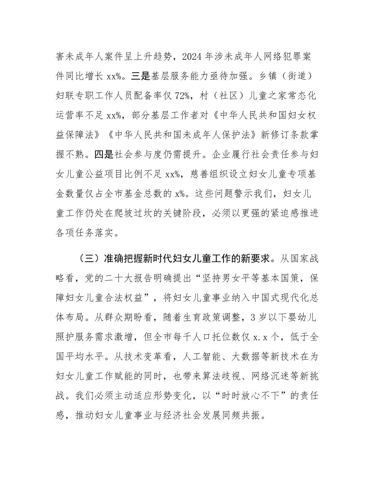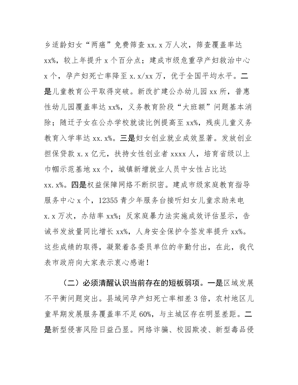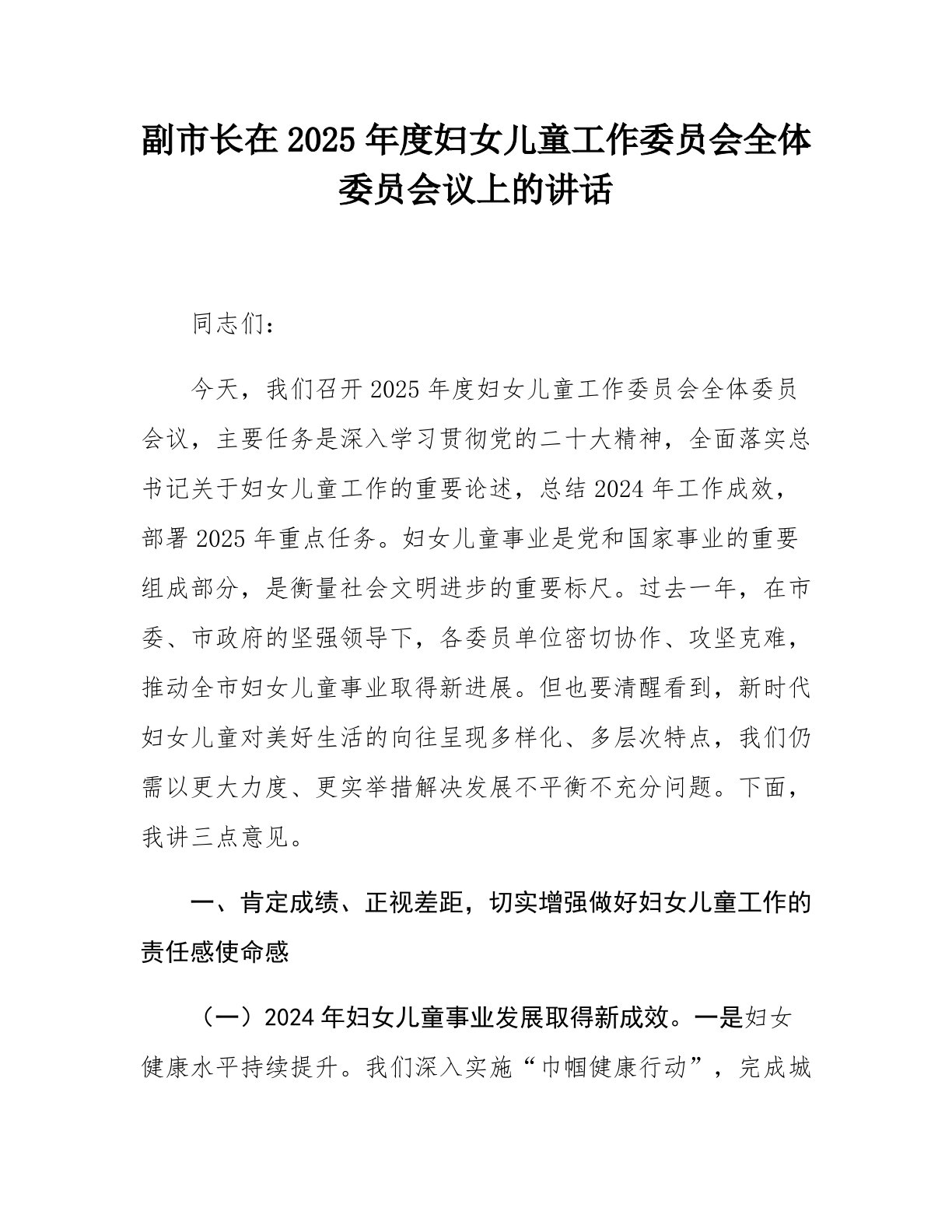 副市长在2025年度妇女儿童工作委员会全体委员会议上的讲话同志们:今天,我们召开2025年度妇女儿童工作委员会全体委员会议,主要任务是深入学习贯彻党的二十大精神,全面落实总书记关于妇女儿童工作的重要论述,总结2024年工作成效,部署2025年重点任务。妇女儿童事业是党和国家事业的重要组成部分,是衡量社会文明进步的重要标尺。过去一年,在市委、市政府的坚强领导下,各委员单位密切协作、攻坚克难,推动全市妇女儿童事业取得新进展。但也要清醒看到,新时代妇女儿童对美好生活的向往呈现多样化、多层次特点,我们仍需以更大力度、更实举措解决发展不平衡不充分问题。下面,我讲三点意见。一、肯定成绩、正视差距,切实增强...