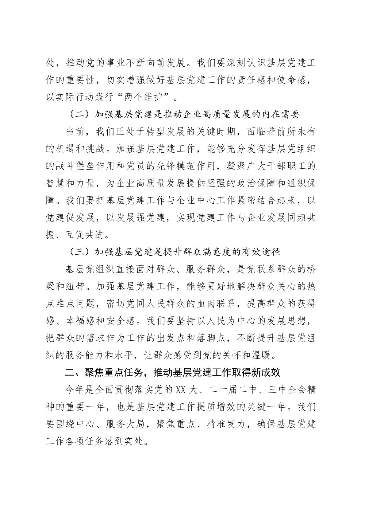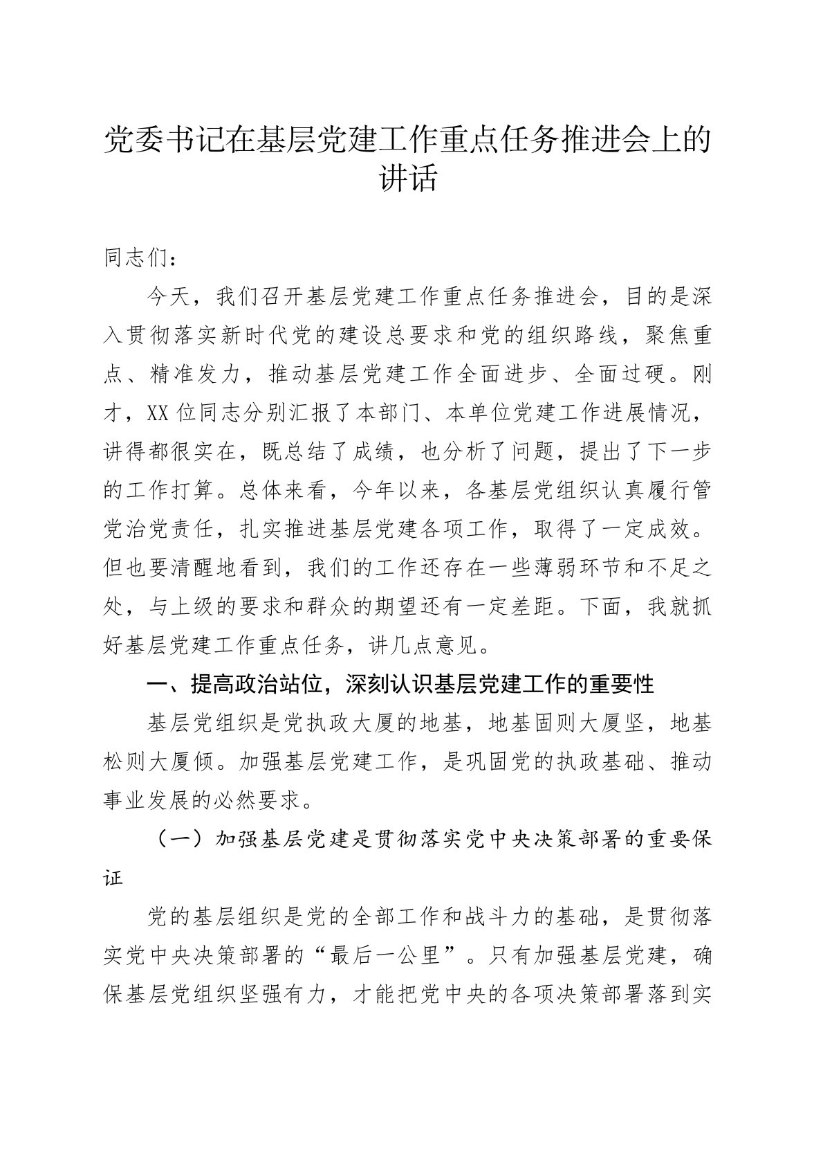 党委书记在基层党建工作重点任务推进会上的讲话同志们:今天,我们召开基层党建工作重点任务推进会,目的是深入贯彻落实新时代党的建设总要求和党的组织路线,聚焦重点、精准发力,推动基层党建工作全面进步、全面过硬。刚才,XX位同志分别汇报了本部门、本单位党建工作进展情况,讲得都很实在,既总结了成绩,也分析了问题,提出了下一步的工作打算。总体来看,今年以来,各基层党组织认真履行管党治党责任,扎实推进基层党建各项工作,取得了一定成效。但也要清醒地看到,我们的工作还存在一些薄弱环节和不足之处,与上级的要求和群众的期望还有一定差距。下面,我就抓好基层党建工作重点任务,讲几点意见。一、提高政治站位,深刻认识基层党...