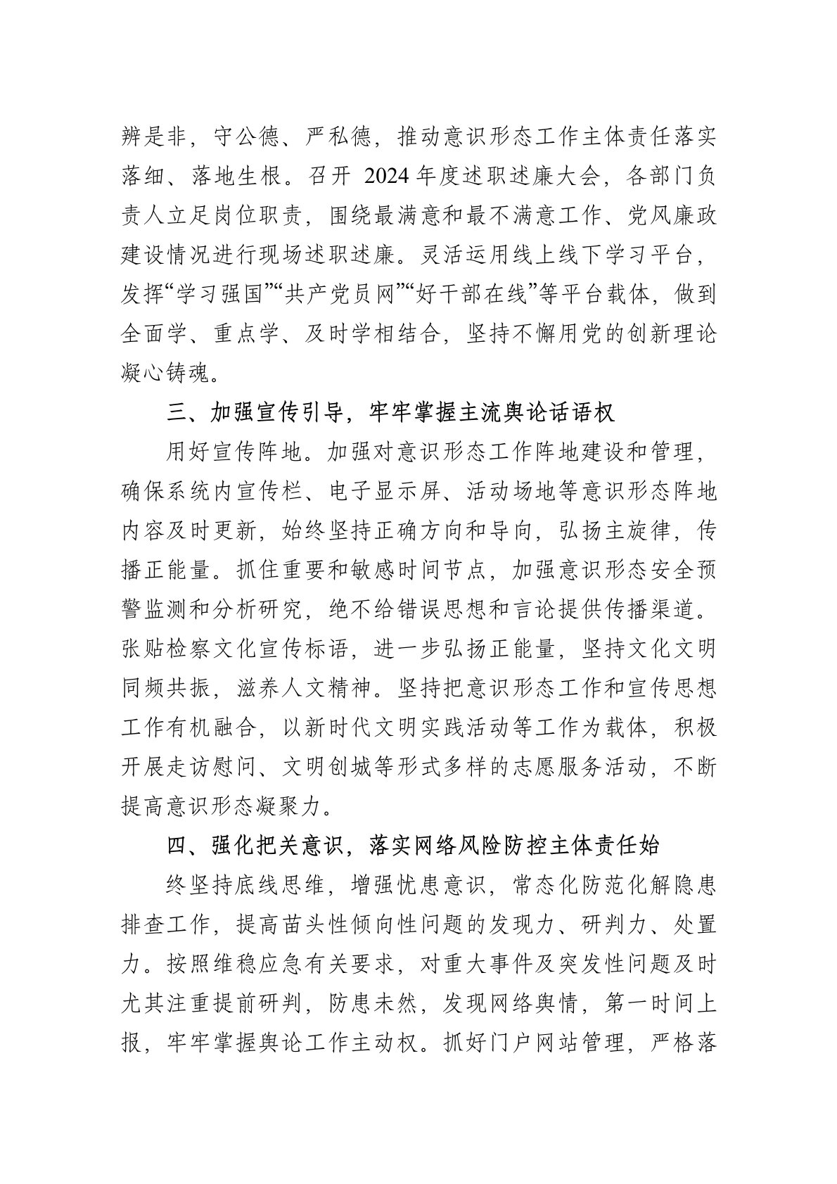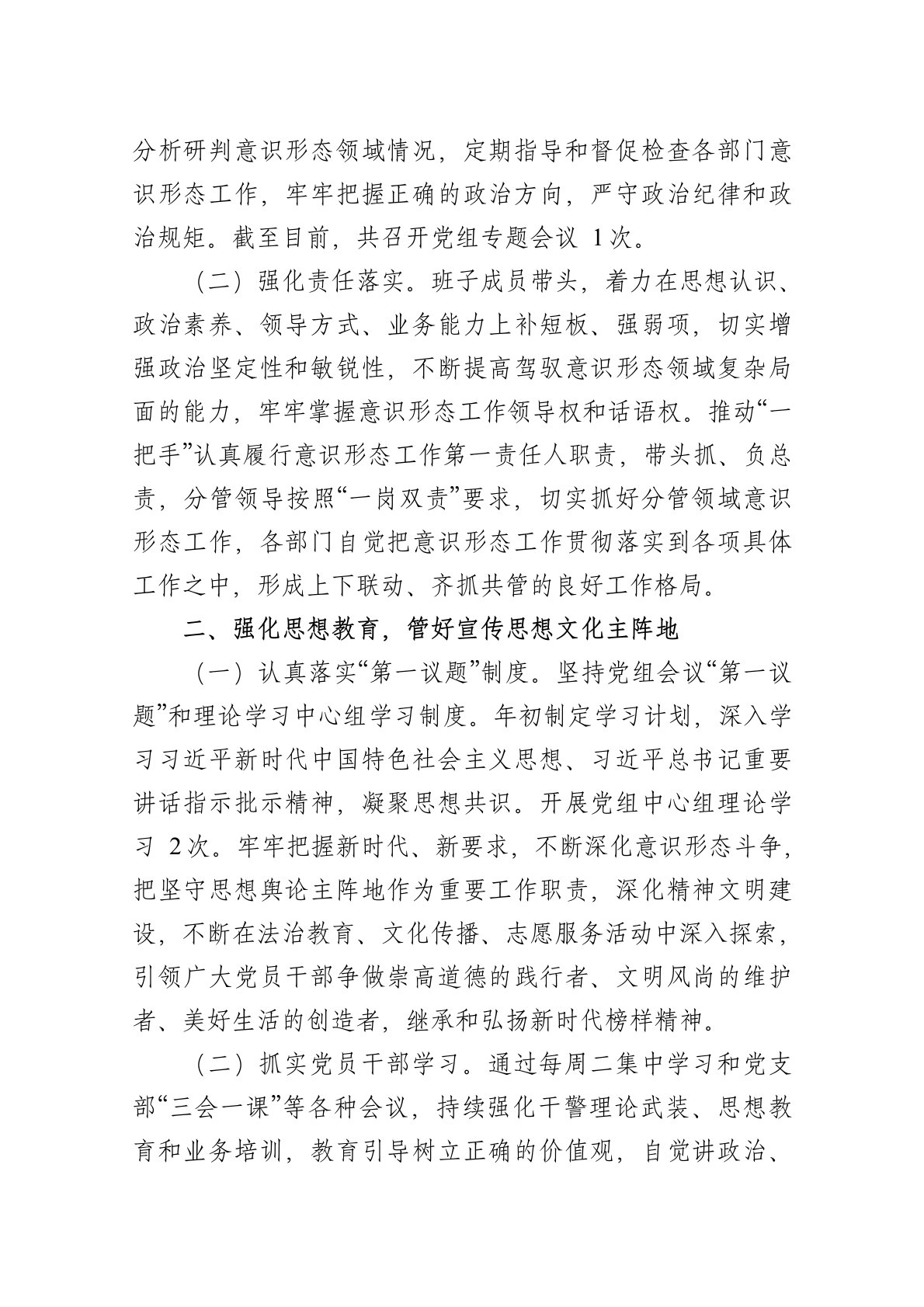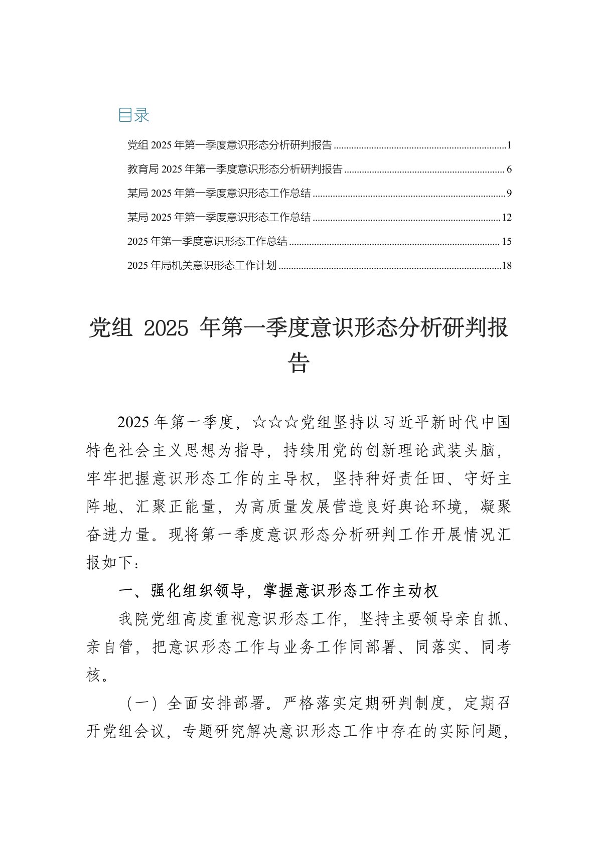 目录党组2025年第一季度意识形态分析研判报告2025年第一季度,☆☆☆党组坚持以习近平新时代中国特色社会主义思想为指导,持续用党的创新理论武装头脑,牢牢把握意识形态工作的主导权,坚持种好责任田、守好主阵地、汇聚正能量,为高质量发展营造良好舆论环境,凝聚奋进力量。现将第一季度意识形态分析研判工作开展情况汇报如下:一、强化组织领导,掌握意识形态工作主动权我院党组高度重视意识形态工作,坚持主要领导亲自抓、亲自管,把意识形态工作与业务工作同部署、同落实、同考核。(一)全面安排部署。严格落实定期研判制度,定期召开党组会议,专题研究解决意识形态工作中存在的实际问题,分析研判意识形态领域情况,定期指导和督...