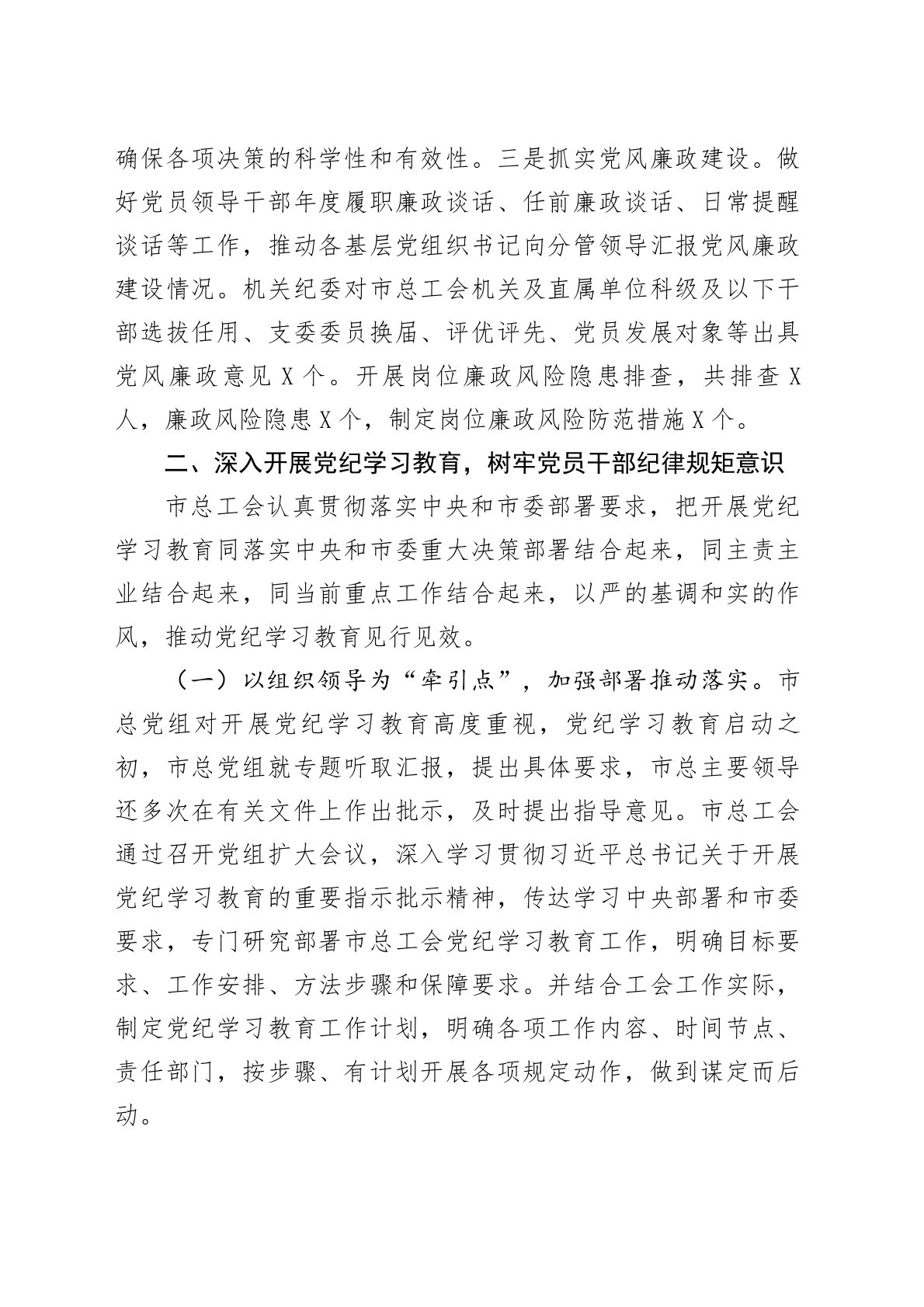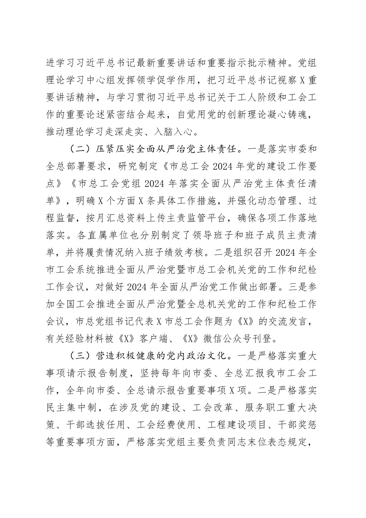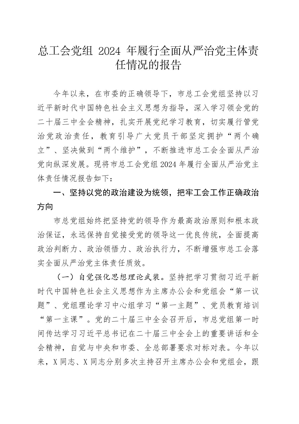 总工会党组2024年履行全面从严治党主体责任情况的报告今年以来,在市委的正确领导下,市总工会党组坚持以习近平新时代中国特色社会主义思想为指导,深入学习领会党的二十届三中全会精神,扎实开展党纪学习教育,切实履行管党治党政治责任,教育引导广大党员干部坚定拥护“两个确立”、坚决做到“两个维护”,不断推进市总工会全面从严治党向纵深发展。现将市总工会党组2024年履行全面从严治党主体责任情况报告如下:一、坚持以党的政治建设为统领,把牢工会工作正确政治方向市总党组始终把坚持党的领导作为最高政治原则和根本政治保证,永远保持自觉接受党的领导这一优良传统,全面提高政治判断力、政治领悟力、政治执行力,不断增强市总...