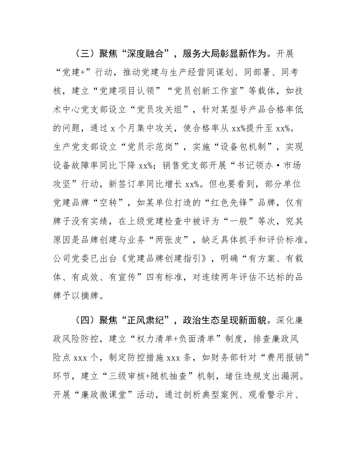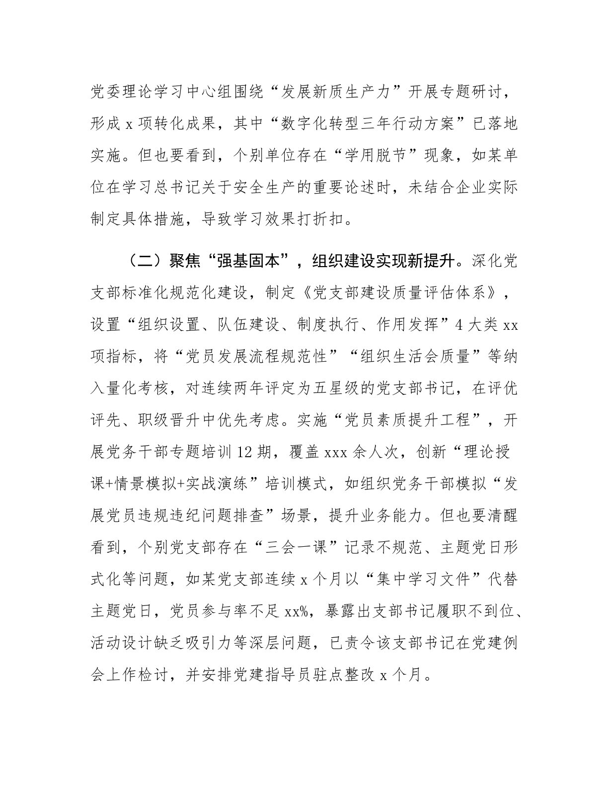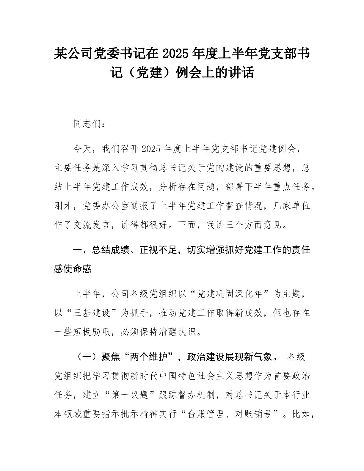 某公司党委书记在2025年度上半年党支部书记(党建)例会上的讲话同志们:今天,我们召开2025年度上半年党支部书记党建例会,主要任务是深入学习贯彻总书记关于党的建设的重要思想,总结上半年党建工作成效,分析存在问题,部署下半年重点任务。刚才,党委办公室通报了上半年党建工作督查情况,几家单位作了交流发言,讲得都很好。下面,我讲三个方面意见。一、总结成绩、正视不足,切实增强抓好党建工作的责任感使命感上半年,公司各级党组织以“党建巩固深化年”为主题,以“三基建设”为抓手,推动党建工作取得新成效,但也存在一些短板弱项,必须保持清醒认识。(一)聚焦“两个维护”,政治建设展现新气象。各级党组织把学习贯彻新时...
