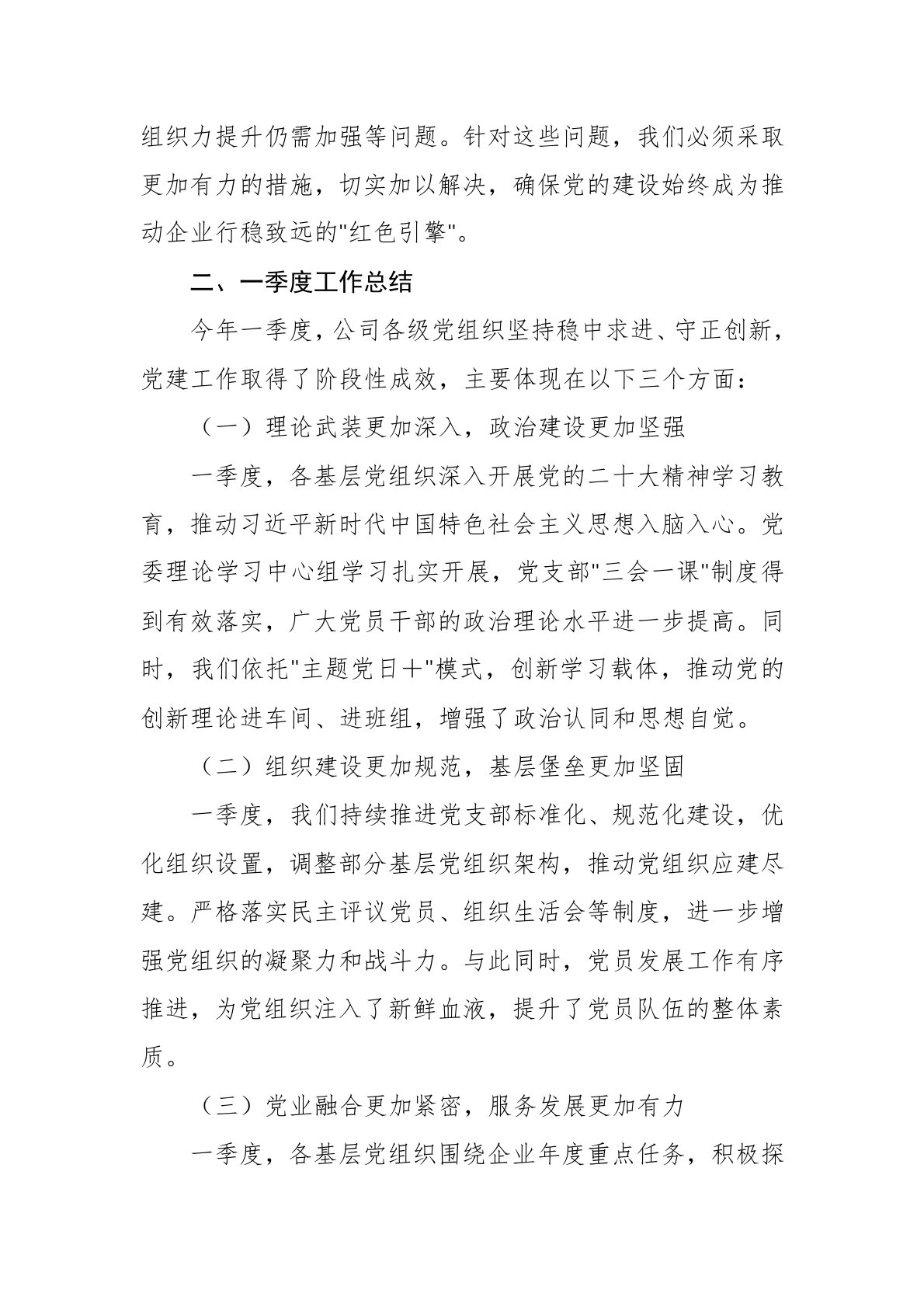 在2025年党组织书记抓基层党建工作例会上的讲话范文同志们:今天,我们召开2025年党组织书记抓基层党建工作例会,主要任务是深入学习贯彻党的二十大精神和习近平总书记关于党的建设的重要论述,全面落实党中央关于基层党建工作的决策部署,总结一季度工作情况,研究部署二季度重点任务,进一步推动基层党建提质增效,为公司高质量发展提供坚强政治保障。一、深刻把握基层党建工作的政治属性今年是全面贯彻党的二十大精神的关键之年,是推进国企深化改革、加快创新驱动发展的重要一年。习近平总书记在中央企业党的建设工作会议上强调,国有企业是党执政兴国的重要支柱和依靠力量,必须坚持和加强党的全面领导,充分发挥基层党组织战斗堡垒...