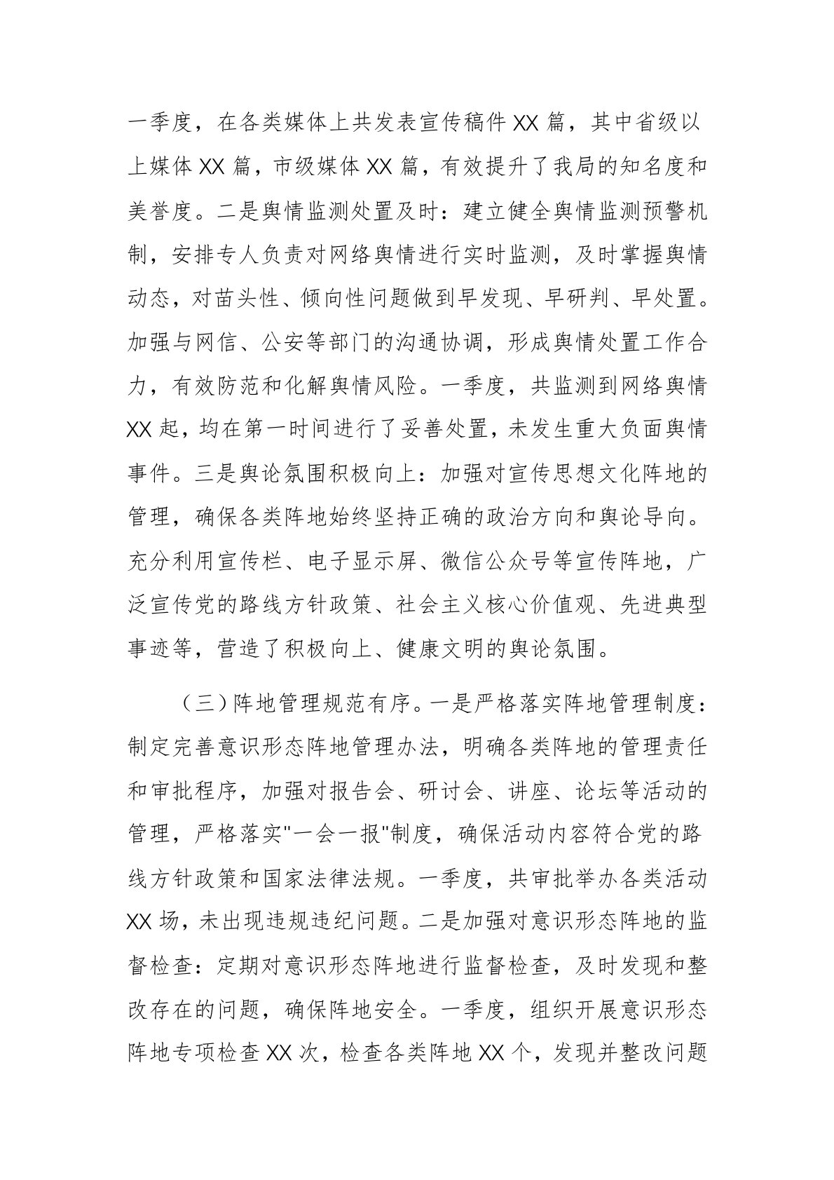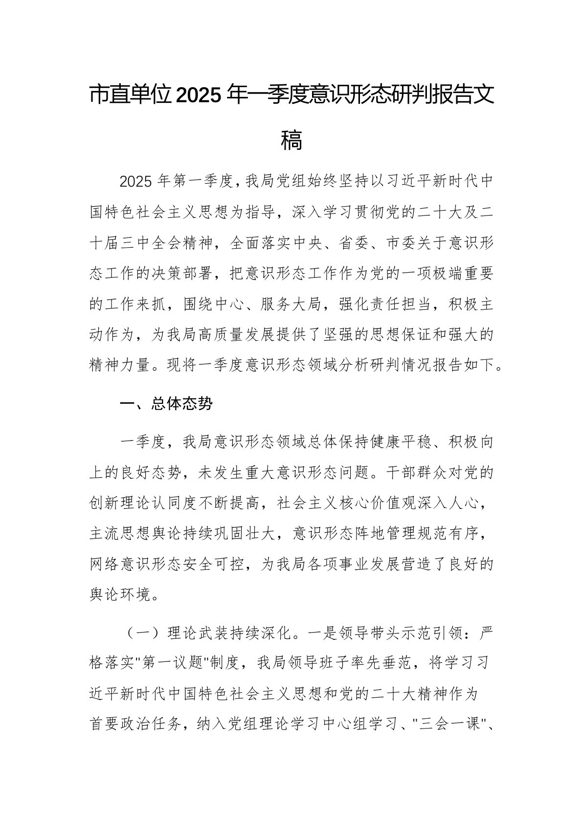 市直单位2025年一季度意识形态研判报告文稿2025年第一季度,我局党组始终坚持以习近平新时代中国特色社会主义思想为指导,深入学习贯彻党的二十大及二十届三中全会精神,全面落实中央、省委、市委关于意识形态工作的决策部署,把意识形态工作作为党的一项极端重要的工作来抓,围绕中心、服务大局,强化责任担当,积极主动作为,为我局高质量发展提供了坚强的思想保证和强大的精神力量。现将一季度意识形态领域分析研判情况报告如下。一、总体态势一季度,我局意识形态领域总体保持健康平稳、积极向上的良好态势,未发生重大意识形态问题。干部群众对党的创新理论认同度不断提高,社会主义核心价值观深入人心,主流思想舆论持续巩固壮大,...