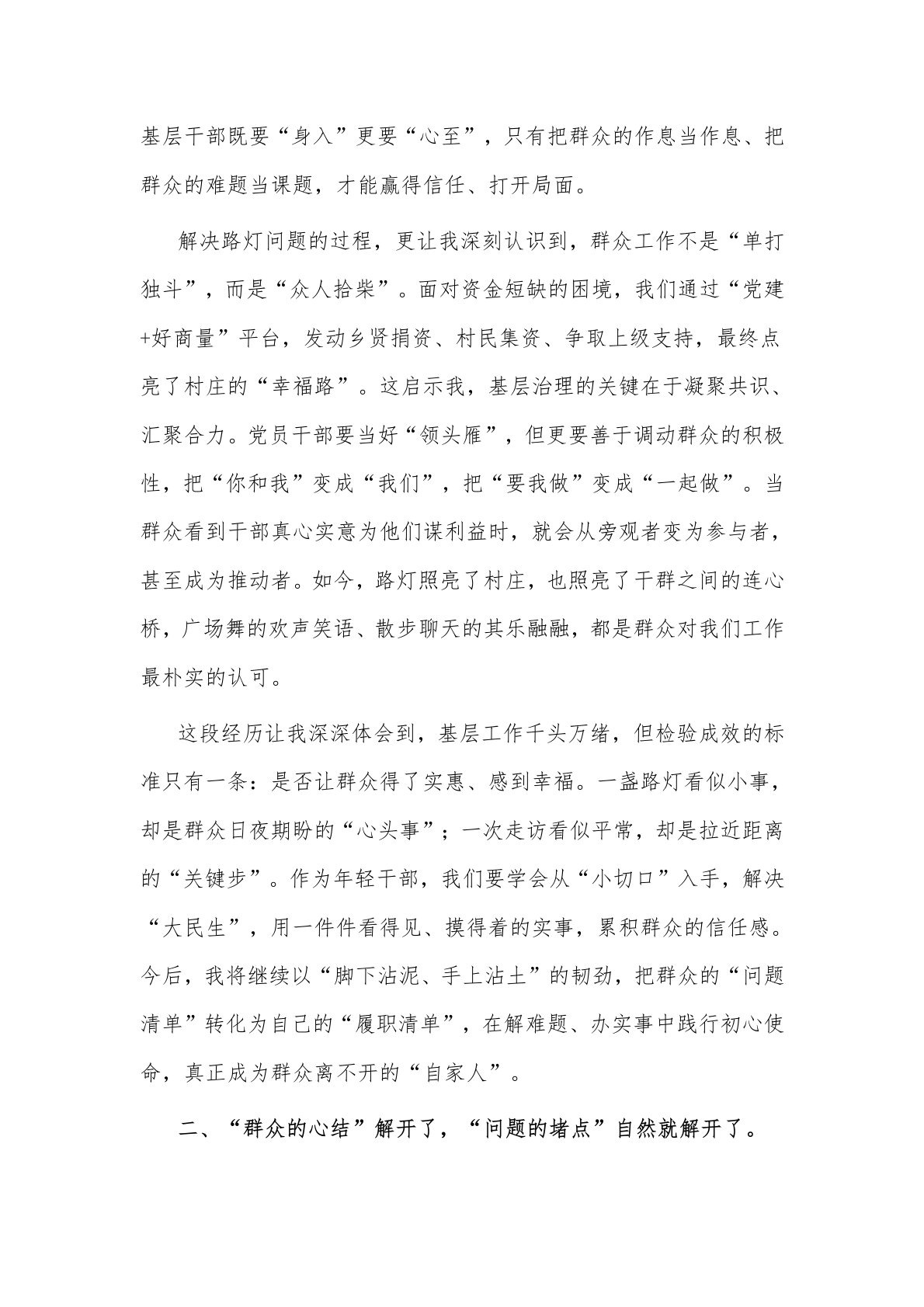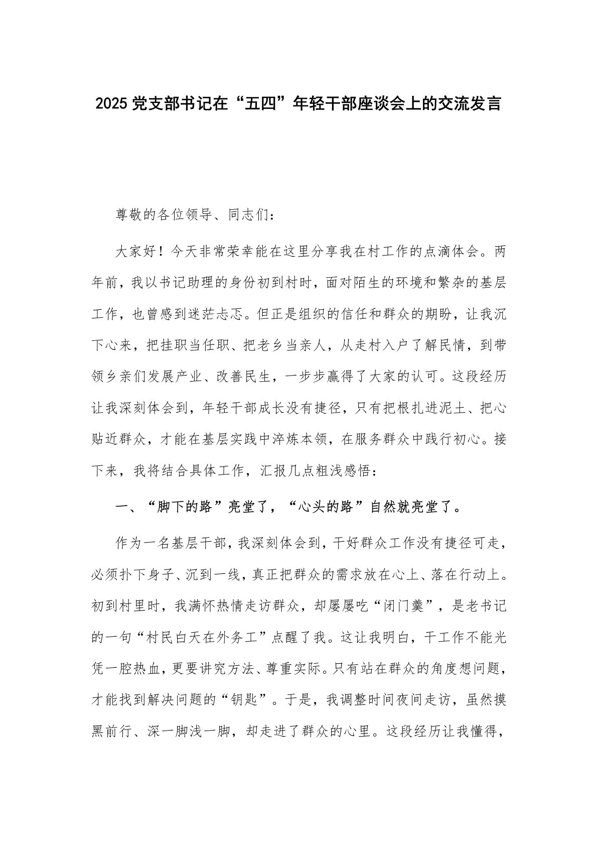 2025党支部书记在“五四”年轻干部座谈会上的交流发言尊敬的各位领导、同志们:大家好!今天非常荣幸能在这里分享我在村工作的点滴体会。两年前,我以书记助理的身份初到村时,面对陌生的环境和繁杂的基层工作,也曾感到迷茫忐忑。但正是组织的信任和群众的期盼,让我沉下心来,把挂职当任职、把老乡当亲人,从走村入户了解民情,到带领乡亲们发展产业、改善民生,一步步赢得了大家的认可。这段经历让我深刻体会到,年轻干部成长没有捷径,只有把根扎进泥土、把心贴近群众,才能在基层实践中淬炼本领,在服务群众中践行初心。接下来,我将结合具体工作,汇报几点粗浅感悟:一、“脚下的路”亮堂了,“心头的路”自然就亮堂了。作为一名基层干...