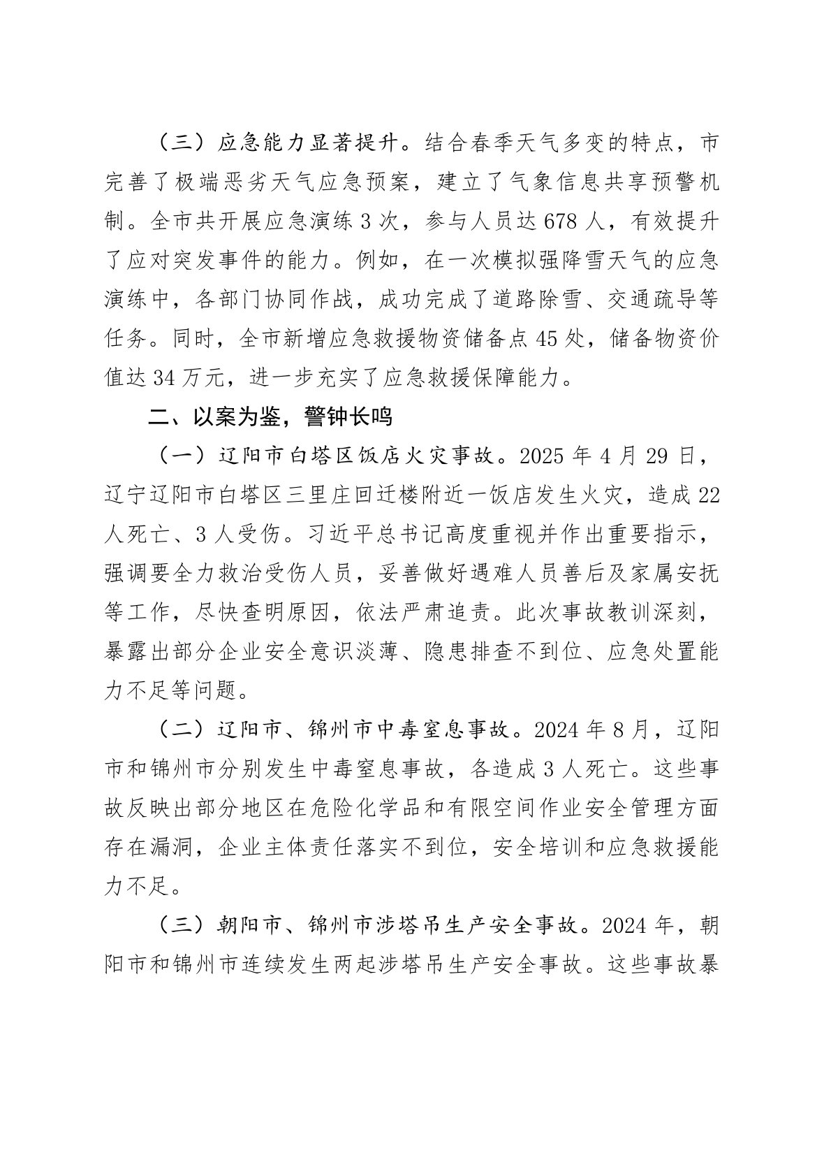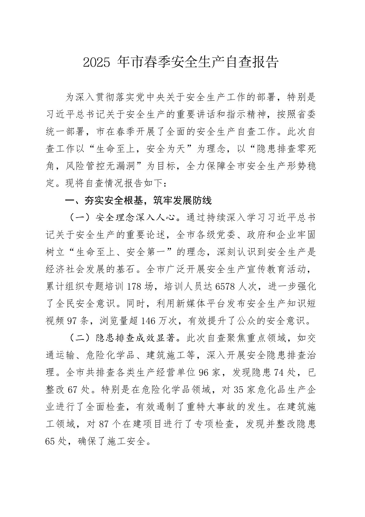 2025年市春季安全生产自查报告为深入贯彻落实党中央关于安全生产工作的部署,特别是习近平总书记关于安全生产的重要讲话和指示精神,按照省委统一部署,市在春季开展了全面的安全生产自查工作。此次自查工作以“生命至上,安全为天”为理念,以“隐患排查零死角,风险管控无漏洞”为目标,全力保障全市安全生产形势稳定。现将自查情况报告如下:一、夯实安全根基,筑牢发展防线(一)安全理念深入人心。通过持续深入学习习近平总书记关于安全生产的重要论述,全市各级党委、政府和企业牢固树立“生命至上、安全第一”的理念,深刻认识到安全生产是经济社会发展的基石。全市广泛开展安全生产宣传教育活动,累计组织专题培训178场,培训人员...