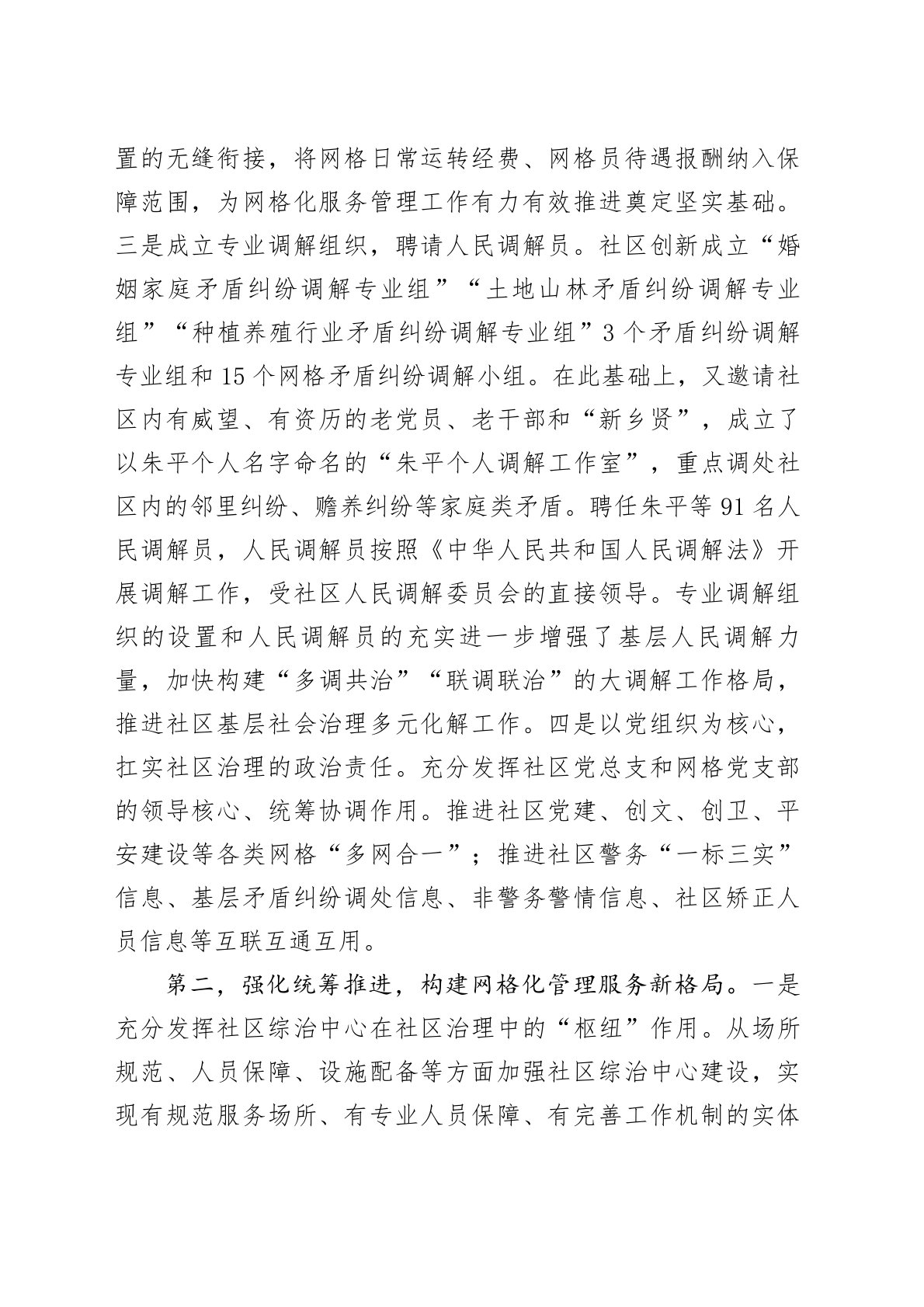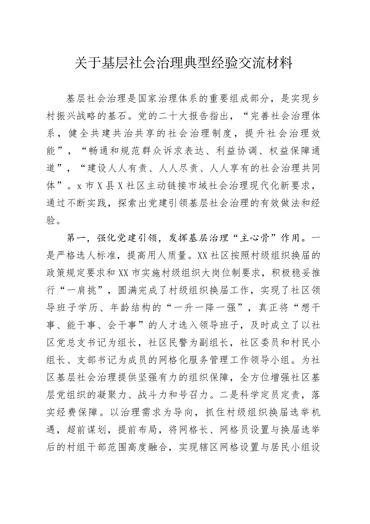 关于基层社会治理典型经验交流材料基层社会治理是国家治理体系的重要组成部分,是实现乡村振兴战略的基石。党的二十大报告指出,“完善社会治理体系,健全共建共治共享的社会治理制度,提升社会治理效能”,“畅通和规范群众诉求表达、利益协调、权益保障通道”,“建设人人有责、人人尽责、人人享有的社会治理共同体”。x市X县X社区主动链接市域社会治理现代化新要求,通过不断实践,探索出党建引领基层社会治理的有效做法和经验。第一,强化党建引领,发挥基层治理“主心骨”作用。一是严格选人标准,提高用人质量。XX社区按照村级组织换届的政策规定要求和XX市实施村级组织大岗位制要求,积极稳妥推行“一肩挑”,圆满完成了村级组织换...