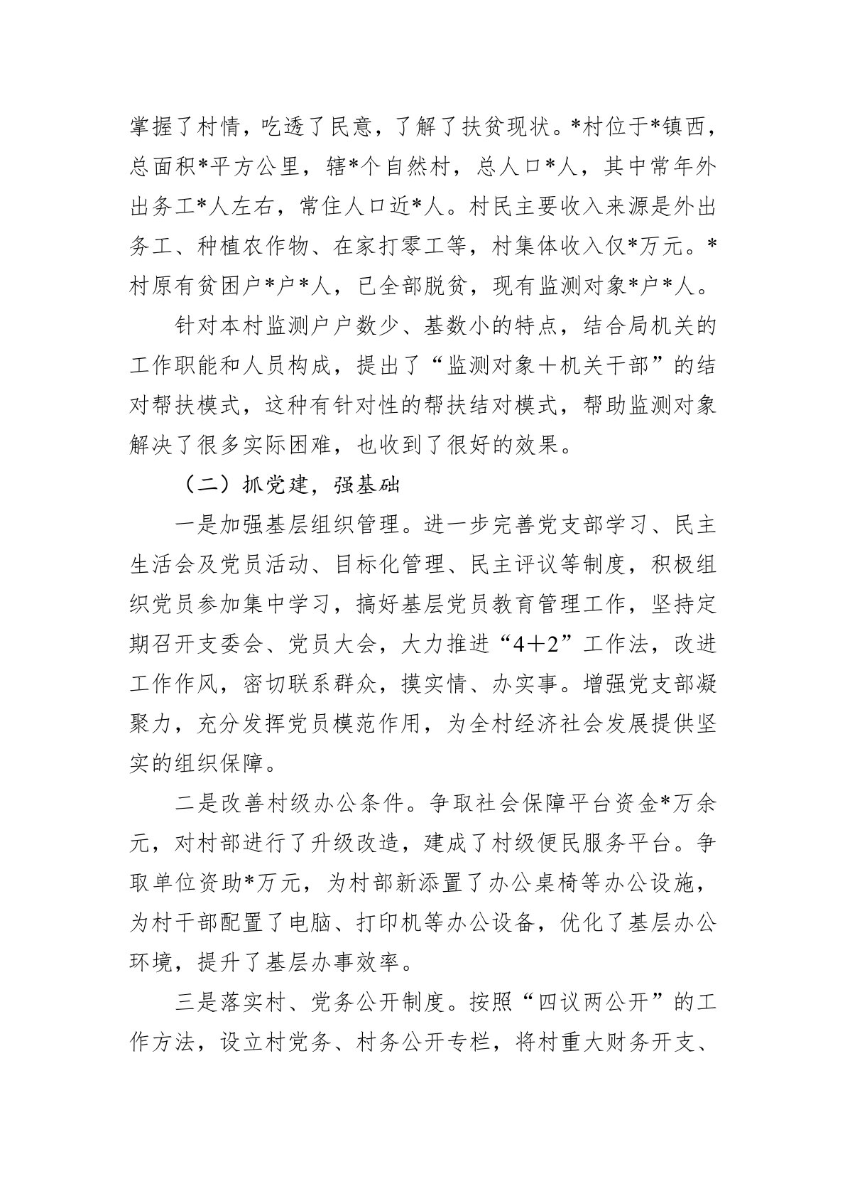202*年*月,我有幸被派驻到*镇*村担任驻村第一书记,任职以来,我认真履行工作职责,牢记使命,与*村广大干群一起,紧紧围绕巩固脱贫攻坚成果同乡村振兴有效衔接这项中心任务,理思路,定规划,搞建设,解民忧。回忆这一年多的基层工作和生活,感谢*村干部和群众对我的帮助和包容,感谢派驻单位*局对我的支持和鼓励,让我从最初的忐忑不安、无从下手,到现在的满腔热血、踌躇满志。下面,将自己这一年来的工作情况简要做一个汇报。一、履职情况(一)探实情,定规划入村之初,面对满脸期待的村干部,心存疑惑的村民,我的内心有些忐忑不安:长期从事机关工作,从未在基层工作的我,是否可以不负众望,当好这个“第一书记”?我想,看到...
