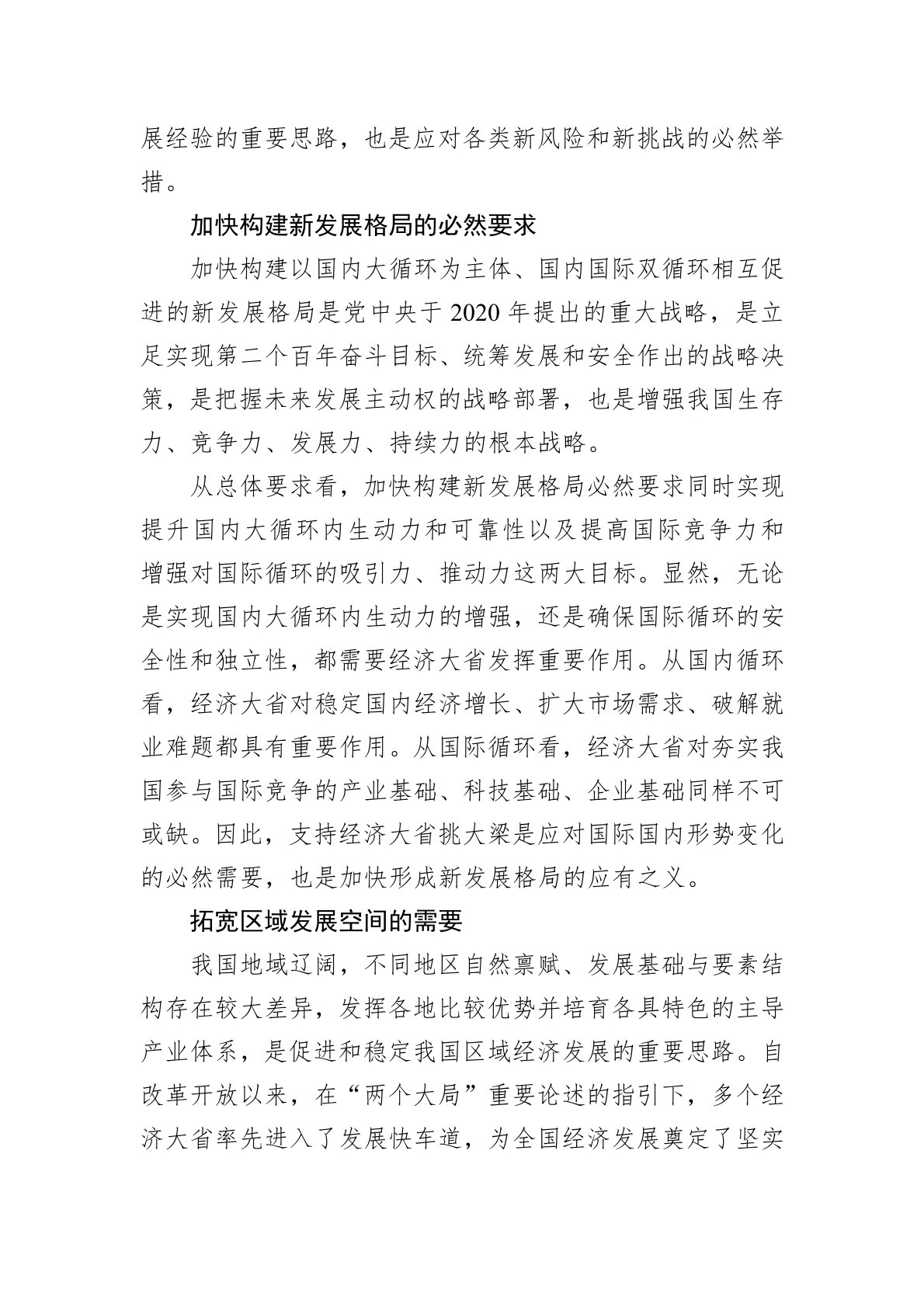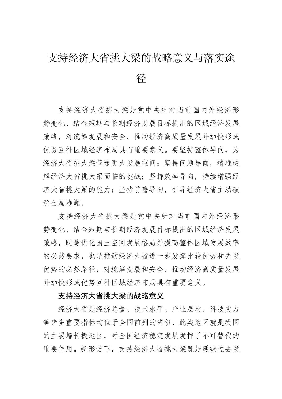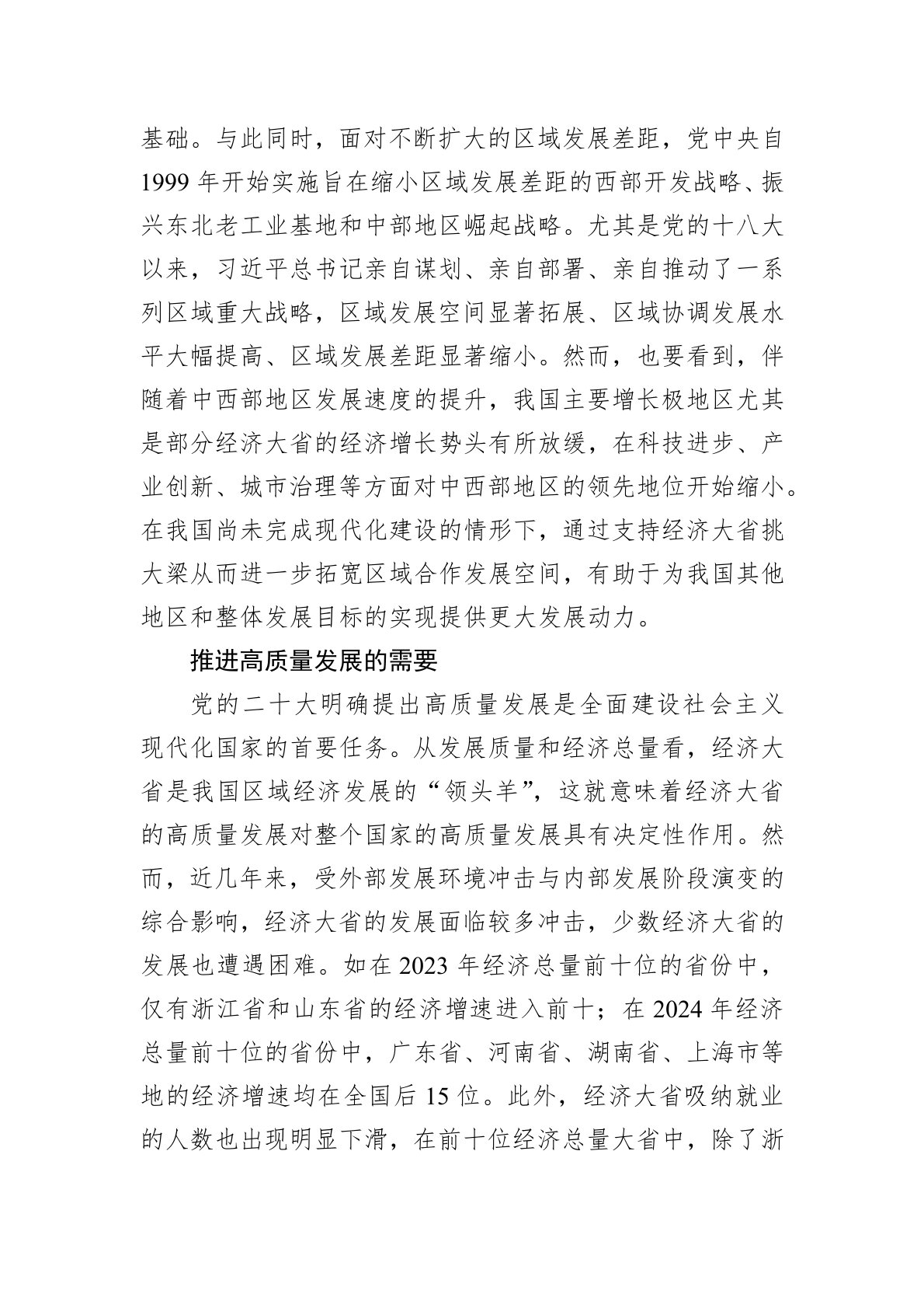 支持经济大省挑大梁是党中央针对当前国内外经济形势变化、结合短期与长期经济发展目标提出的区域经济发展策略,对统筹发展和安全、推动经济高质量发展并加快形成优势互补区域经济布局具有重要意义。要坚持整体导向,为经济大省挑大梁营造更大发展空间;坚持问题导向,精准破解经济大省挑大梁面临的挑战;坚持效率导向,持续增强经济大省挑大梁的能力;坚持前瞻导向,引导经济大省主动破解全局难题。支持经济大省挑大梁是党中央针对当前国内外经济形势变化、结合短期与长期经济发展目标提出的区域经济发展策略,既是优化国土空间发展格局并提高整体区域发展效率的必然要求,也是推动经济大省进一步发挥比较优势和先发优势的必然路径,对统筹发展和...