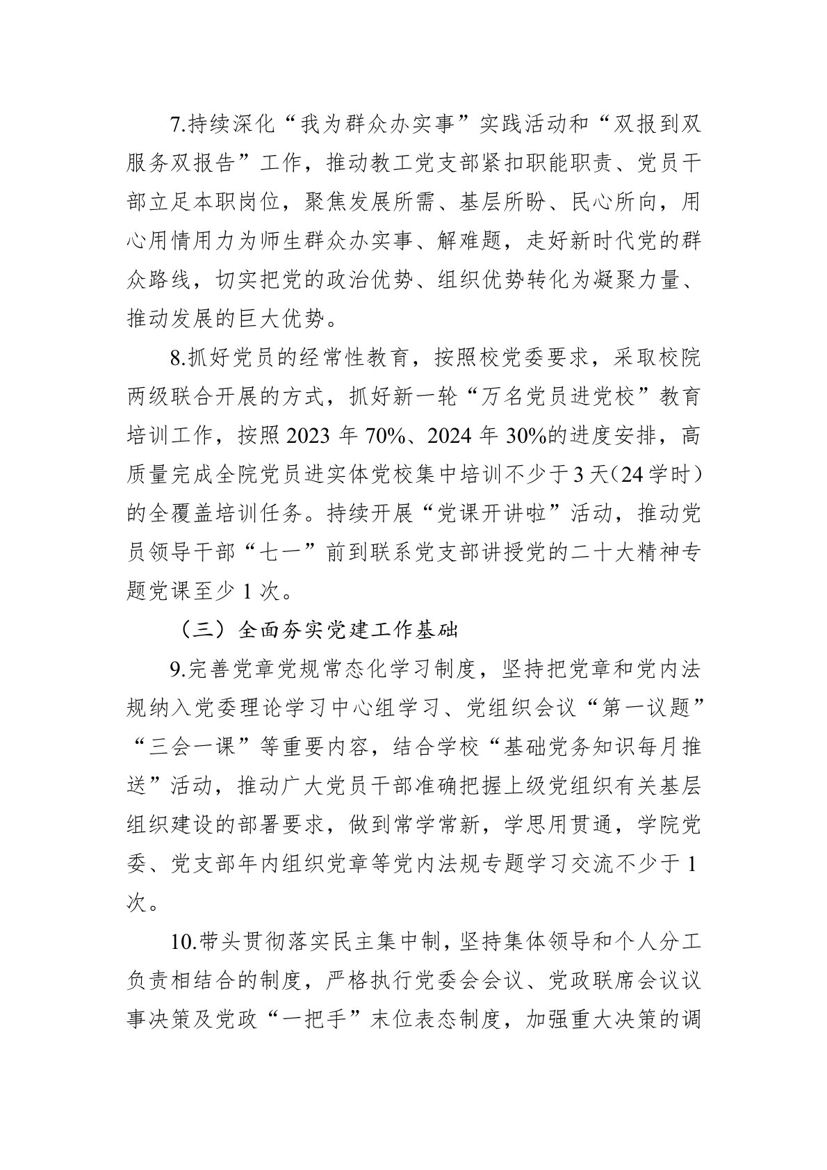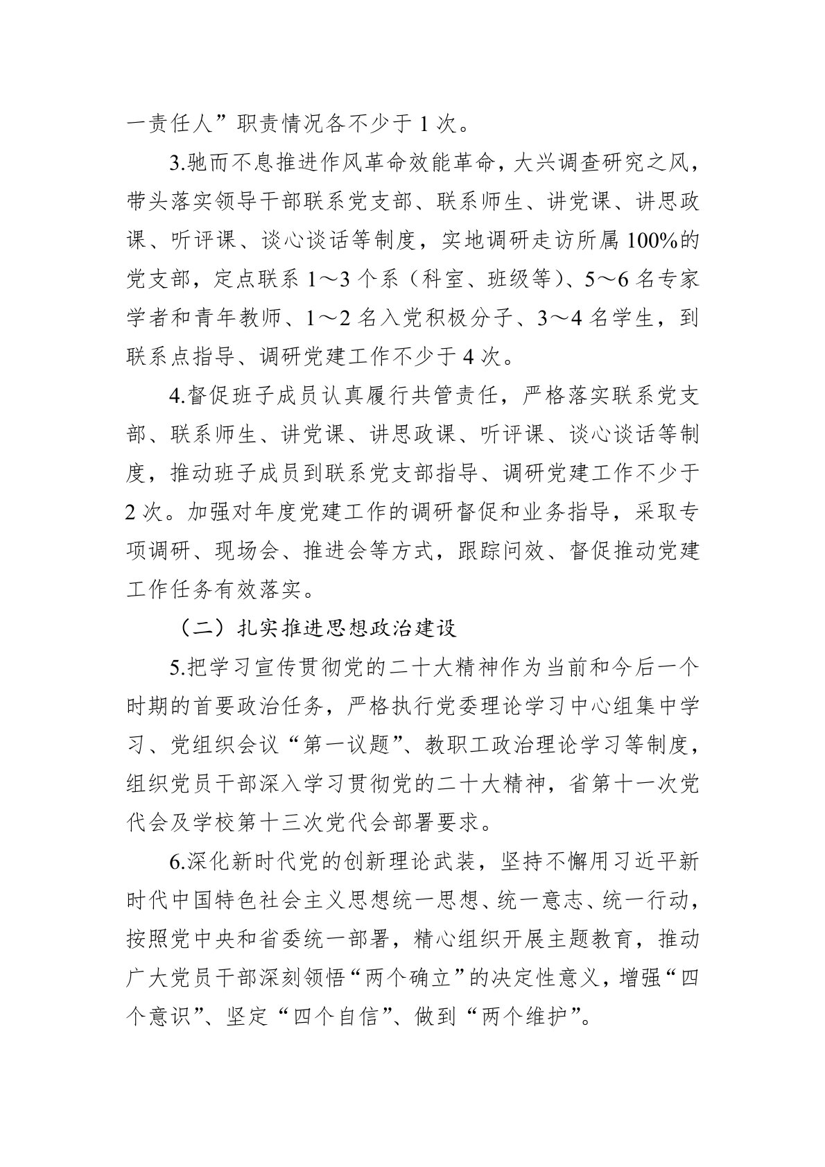 为深入学习贯彻习近平新时代中国特色社会主义思想和党的二十大精神,认真落实新时代党的建设总要求和新时代党的组织路线,坚持党要管党、从严治党,进一步明确学院党委班子成员、党员领导干部抓基层党建工作责任,形成“党委书记主抓,其他班子成员、党员领导干部分工负责”的党建工作局面,根据《中共昆明理工大学委员会关于印发的通知以及的通知》要求,结合学院实际,制定如下责任清单。一、党委书记抓党建工作责任清单(一)健全完善责任落实体系1.牢固树立“抓好党建是最大政绩”的理念,带头贯彻执行校党委《关于健全完善基层党建工作责任落实体系的实施意见》,认真履行抓党建“第一责任人”职责,将狠抓落实作为今年工作的主基调,着力...
