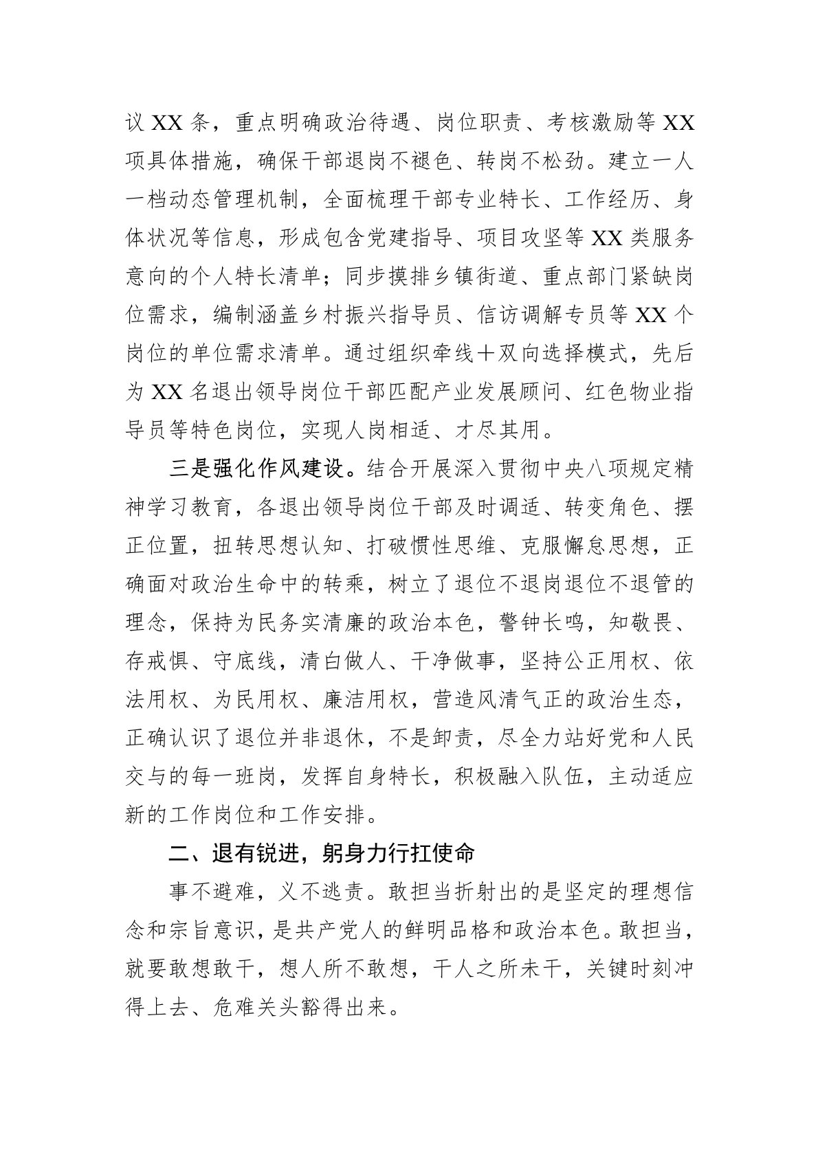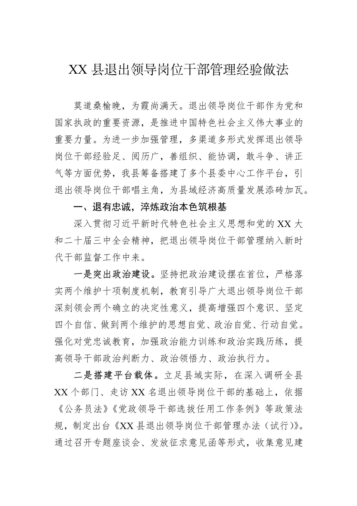 XX县退出领导岗位干部管理经验做法