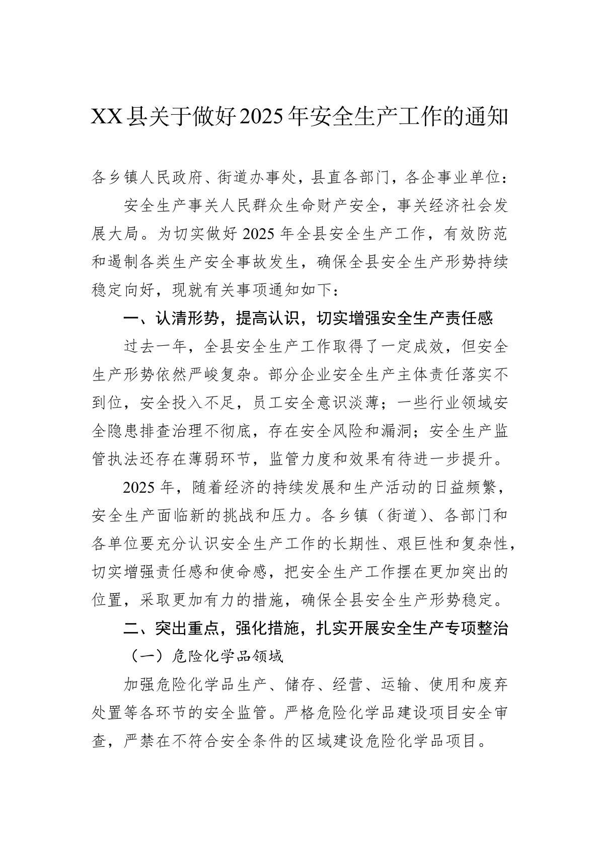 各乡镇人民政府、街道办事处,县直各部门,各企事业单位:安全生产事关人民群众生命财产安全,事关经济社会发展大局。为切实做好2025年全县安全生产工作,有效防范和遏制各类生产安全事故发生,确保全县安全生产形势持续稳定向好,现就有关事项通知如下:一、认清形势,提高认识,切实增强安全生产责任感过去一年,全县安全生产工作取得了一定成效,但安全生产形势依然严峻复杂。部分企业安全生产主体责任落实不到位,安全投入不足,员工安全意识淡薄;一些行业领域安全隐患排查治理不彻底,存在安全风险和漏洞;安全生产监管执法还存在薄弱环节,监管力度和效果有待进一步提升。2025年,随着经济的持续发展和生产活动的日益频繁,安全生...