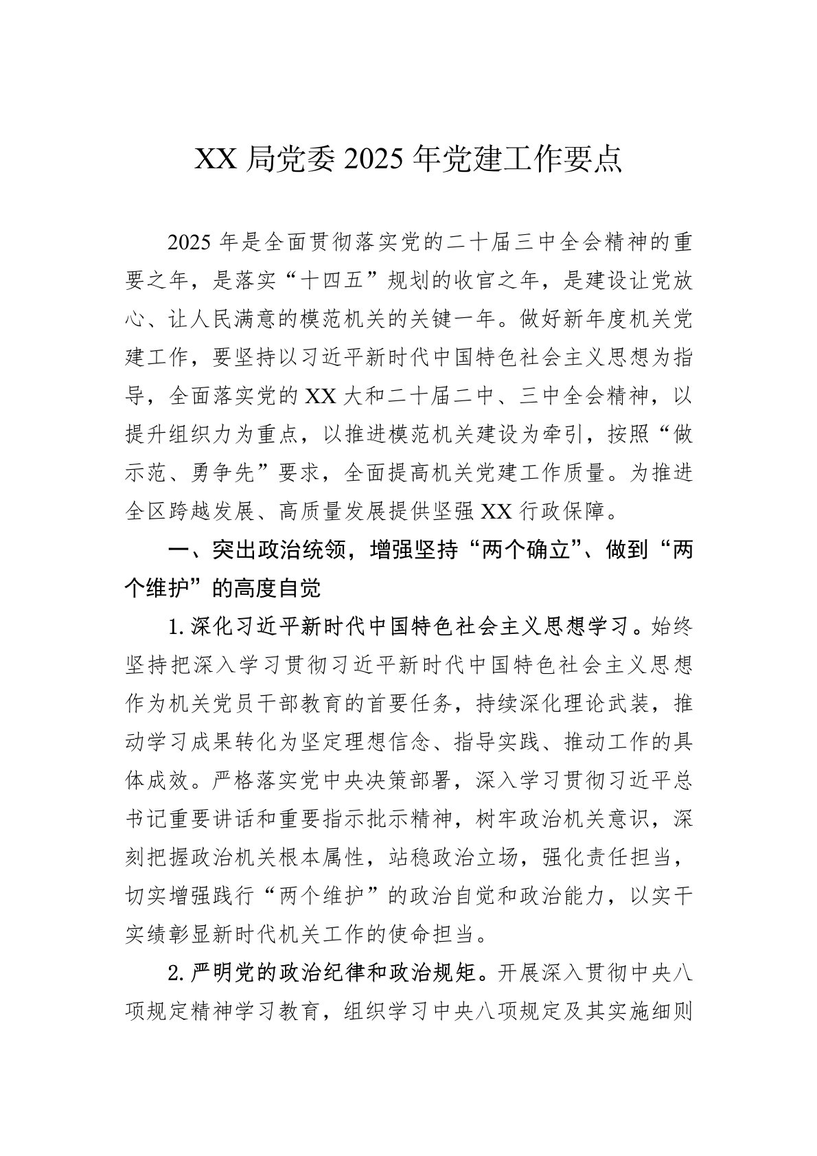 XX局党委2025年党建工作要点