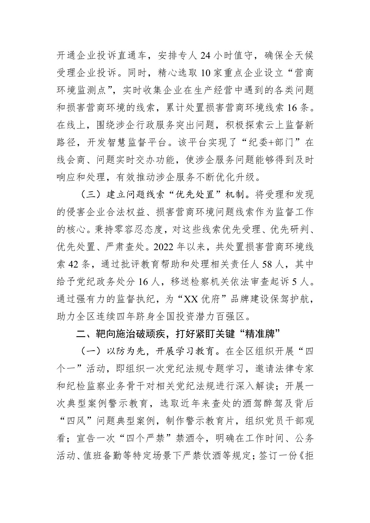 尊敬的各位领导,同志们:近年来,XX区纪委监委以创新思维重构监督体系,以系统观念推动制度重塑,通过打好协作联动、精准施策、长效治理“三张牌”,实现监督效能与发展动能同频共振,为全区高质量发展注入强劲“廉动力”。一、模式创新强协同,打好监督联动“组合牌”(一)首创“清单化”监督模式。制定《XX区纪委监委优化营商环境专项监督方案》,围绕营商环境建设,明确市场准入、行政审批、政策落实等5大方面13项专项监督内容。探索建立纪巡联动、组组协同机制,充分发挥纪委监督执纪问责和巡察“利剑”作用。例如,在巡察过程中发现,部分企业在接受行政处罚、失信惩戒双重处理后,仅重视缴纳罚款,却忽视信用修复,导致后续参与招...