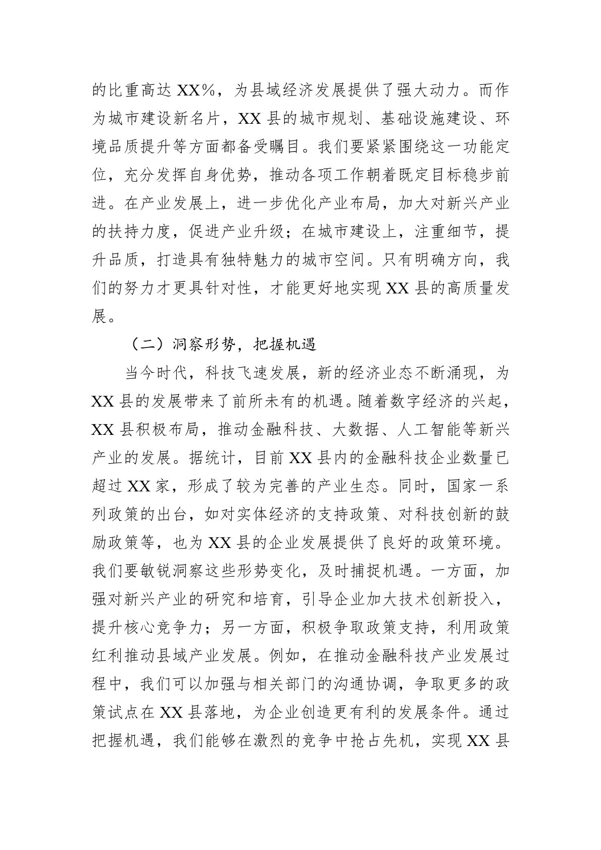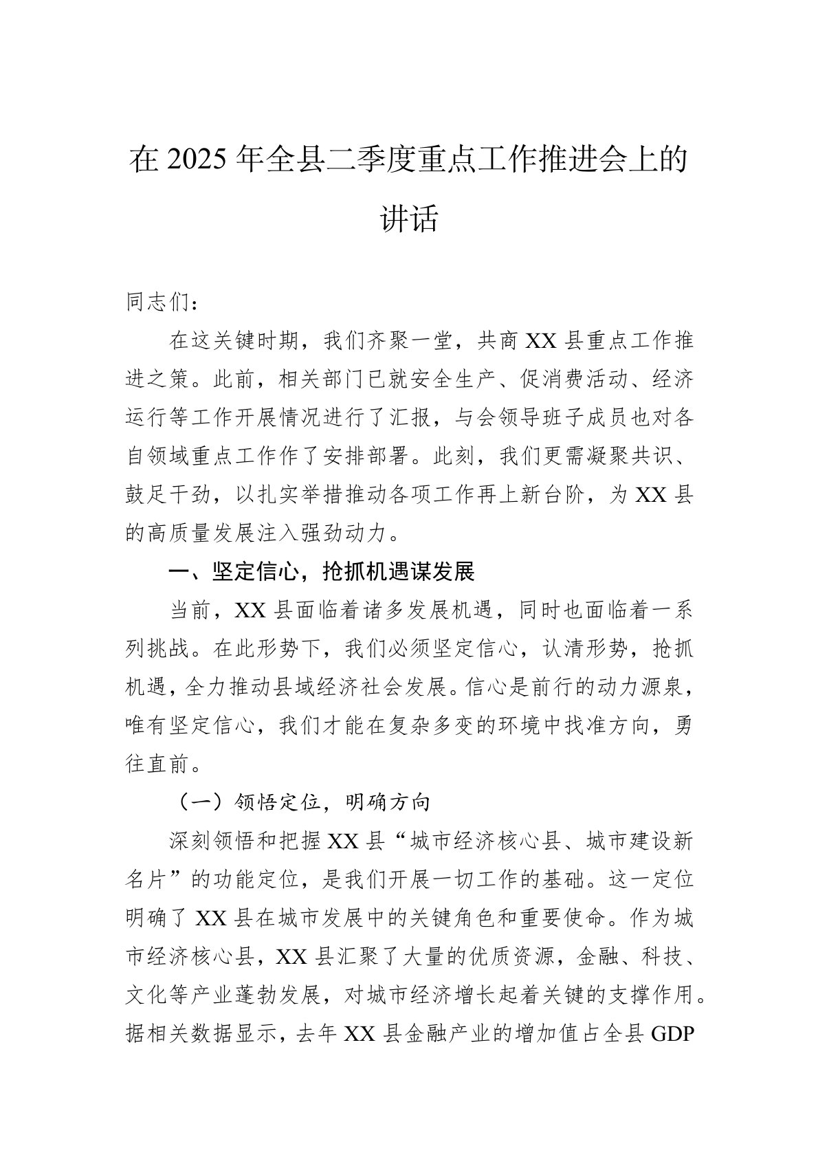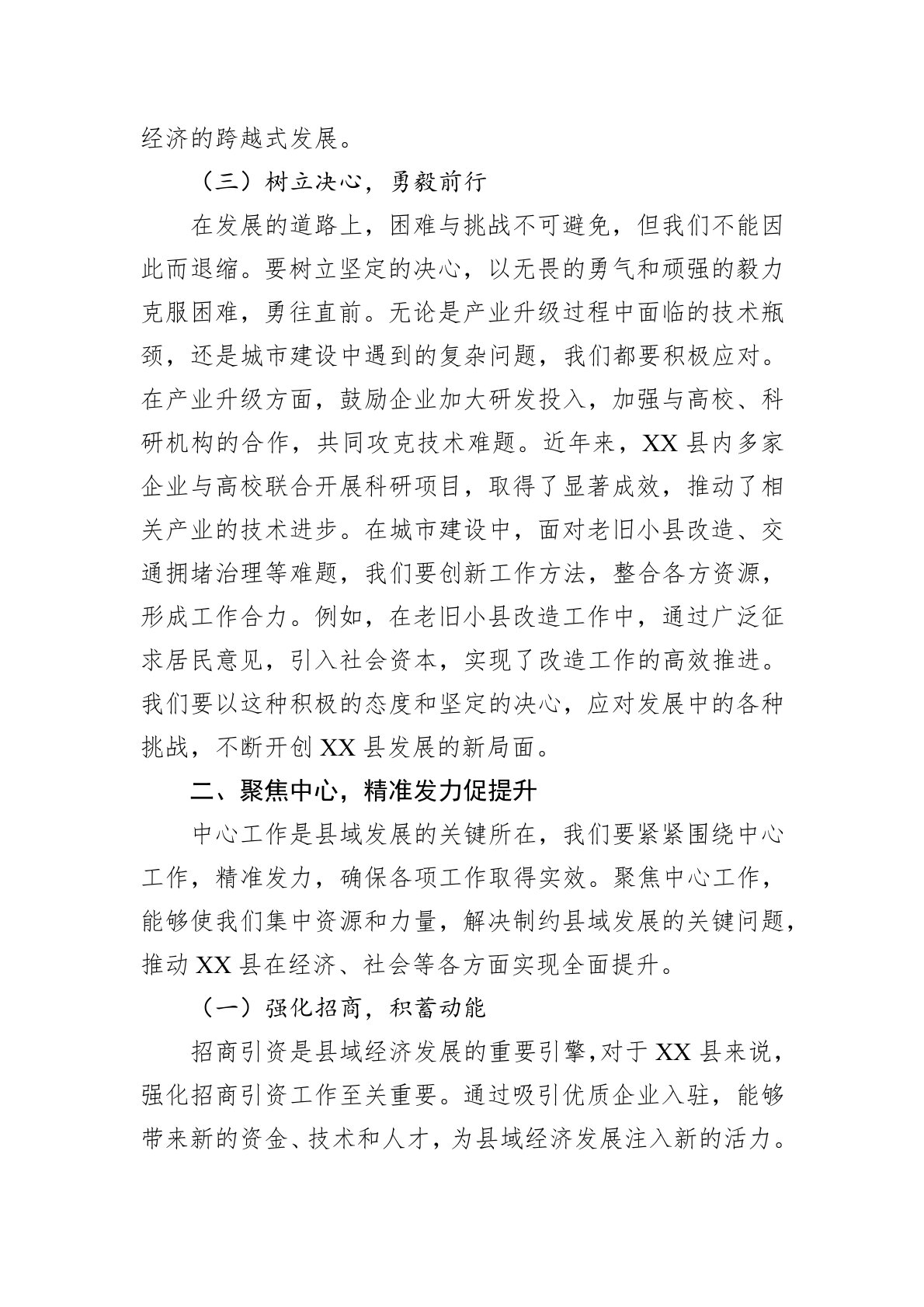同志们:在这关键时期,我们齐聚一堂,共商XX县重点工作推进之策。此前,相关部门已就安全生产、促消费活动、经济运行等工作开展情况进行了汇报,与会领导班子成员也对各自领域重点工作作了安排部署。此刻,我们更需凝聚共识、鼓足干劲,以扎实举措推动各项工作再上新台阶,为XX县的高质量发展注入强劲动力。一、坚定信心,抢抓机遇谋发展当前,XX县面临着诸多发展机遇,同时也面临着一系列挑战。在此形势下,我们必须坚定信心,认清形势,抢抓机遇,全力推动县域经济社会发展。信心是前行的动力源泉,唯有坚定信心,我们才能在复杂多变的环境中找准方向,勇往直前。(一)领悟定位,明确方向深刻领悟和把握XX县“城市经济核心县、城市建...