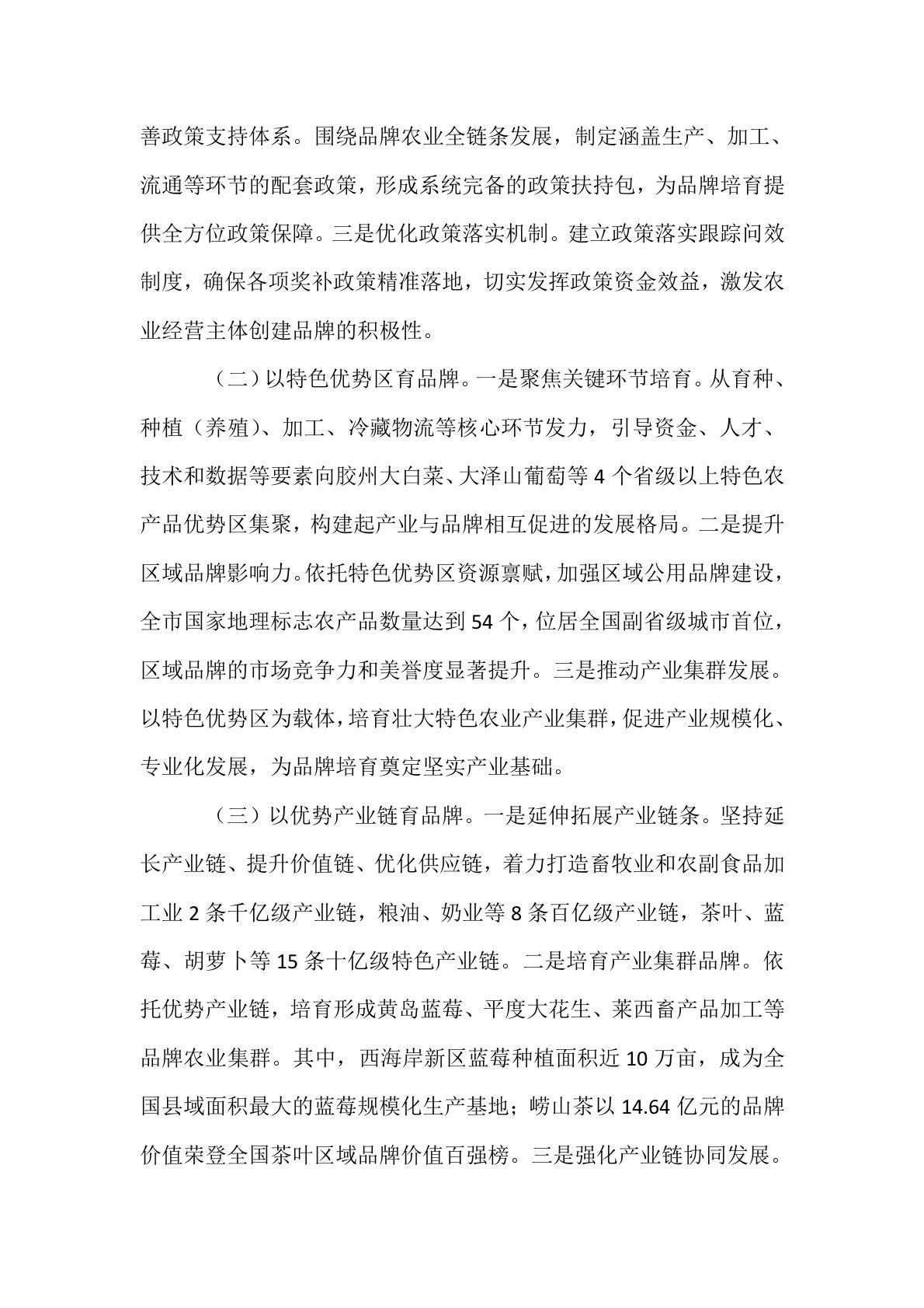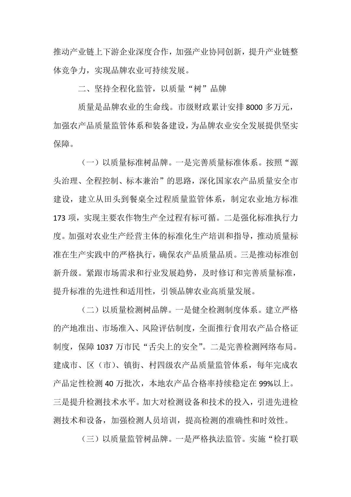 在2025年全市现代农业高质量发展大会上的汇报发言尊敬的各位领导,同志们:近年来,**市财政局深入贯彻落实市委市政府关于品牌农业建设的决策部署,以财政资金为引领,累计安排市级财政资金2.9亿元,充分发挥“四两拨千斤”的财政杠杆撬动作用,拉动社会投入52亿多元,全力推动品牌农业高质量发展。目前,全市涉农产品注册商标达2.2万多个,市级知名农产品品牌227个,“**农品”区域公用品牌价值高达613.8亿元,连续六年跻身全国“十强”,重要农产品稳产保供能力位居全国36个大中城市第1位,连续三年荣获全国“菜篮子”市长负责制考核优秀城市。现将具体工作情况汇报如下:一、坚持融合化发展,以产业“育”品牌市级...