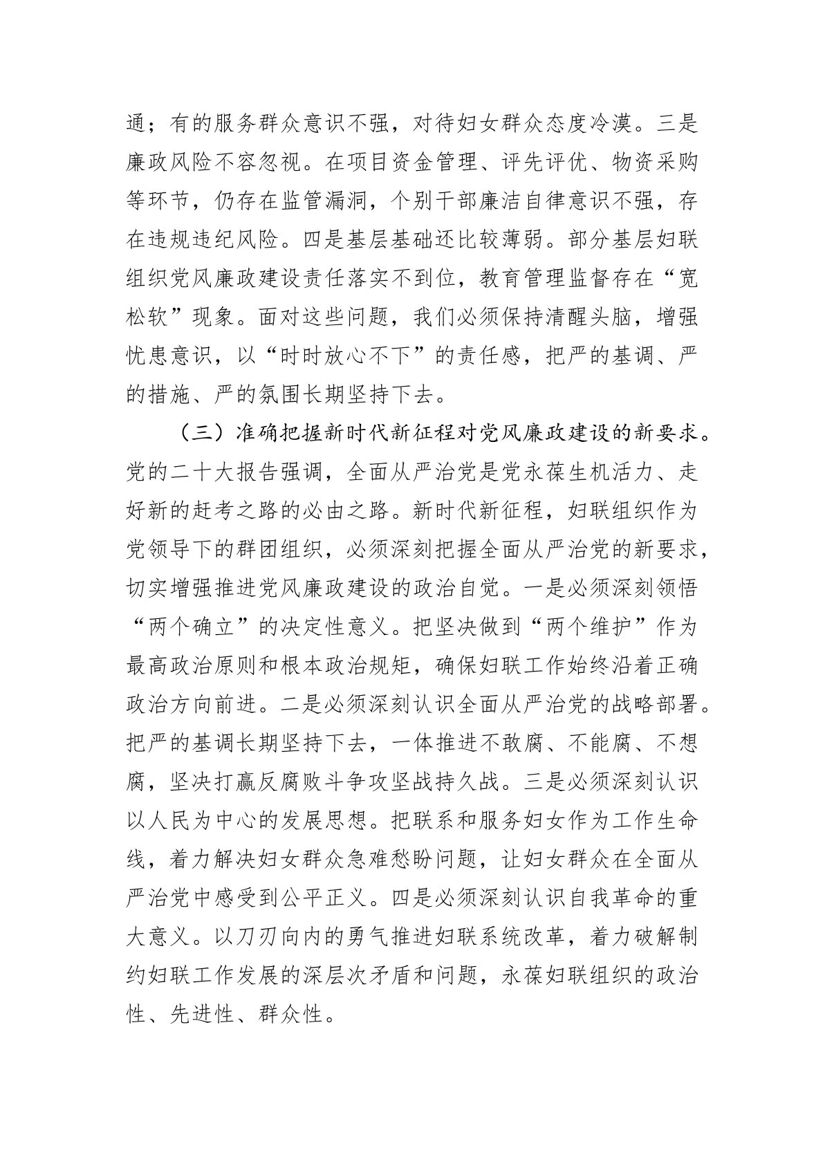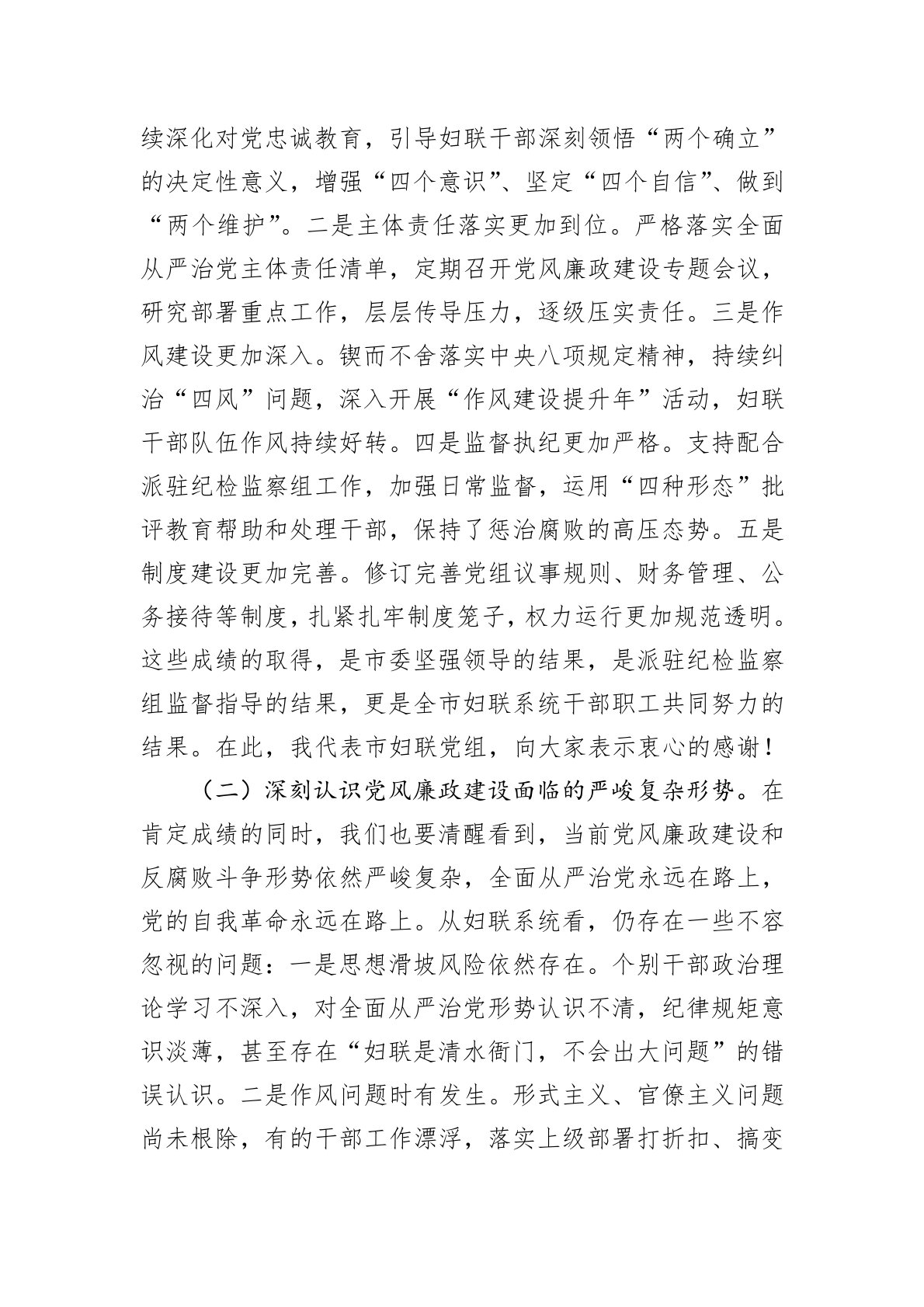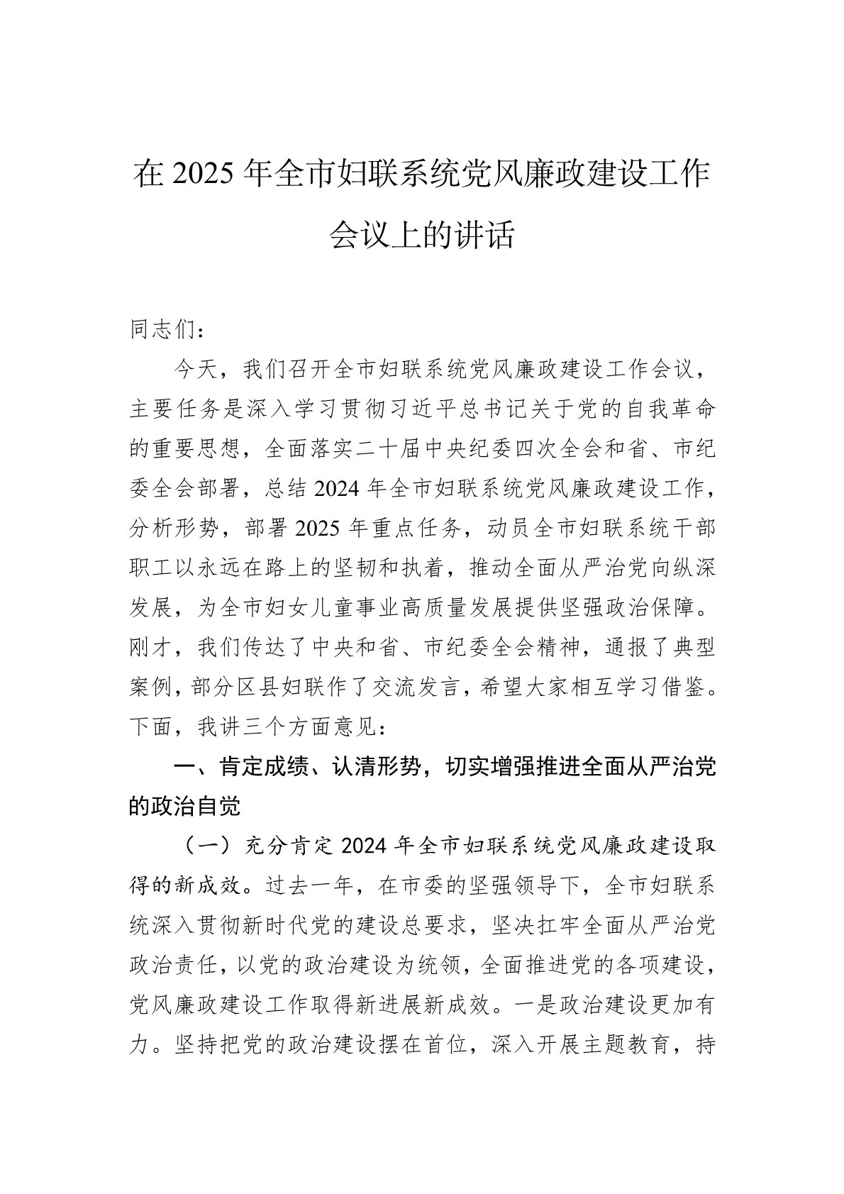 同志们:今天,我们召开全市妇联系统党风廉政建设工作会议,主要任务是深入学习贯彻习近平总书记关于党的自我革命的重要思想,全面落实二十届中央纪委四次全会和省、市纪委全会部署,总结2024年全市妇联系统党风廉政建设工作,分析形势,部署2025年重点任务,动员全市妇联系统干部职工以永远在路上的坚韧和执着,推动全面从严治党向纵深发展,为全市妇女儿童事业高质量发展提供坚强政治保障。刚才,我们传达了中央和省、市纪委全会精神,通报了典型案例,部分区县妇联作了交流发言,希望大家相互学习借鉴。下面,我讲三个方面意见:一、肯定成绩、认清形势,切实增强推进全面从严治党的政治自觉(一)充分肯定2024年全市妇联系统党风...