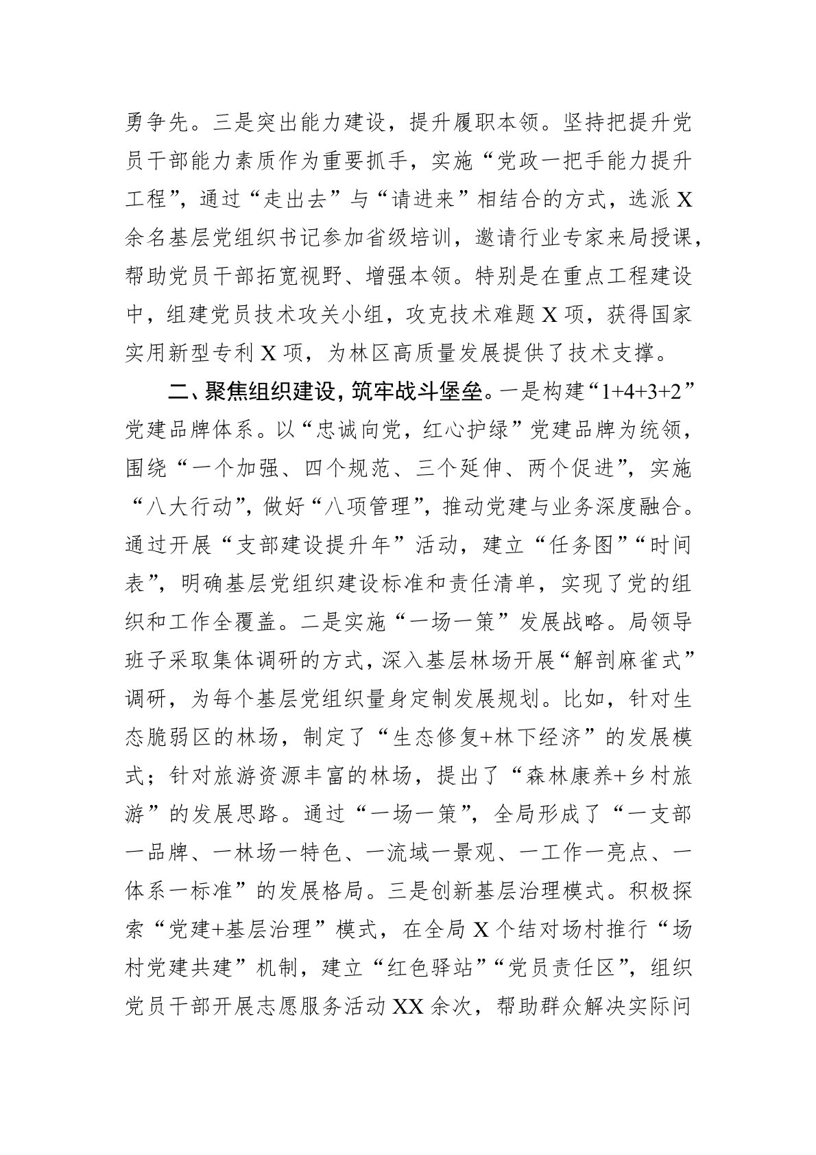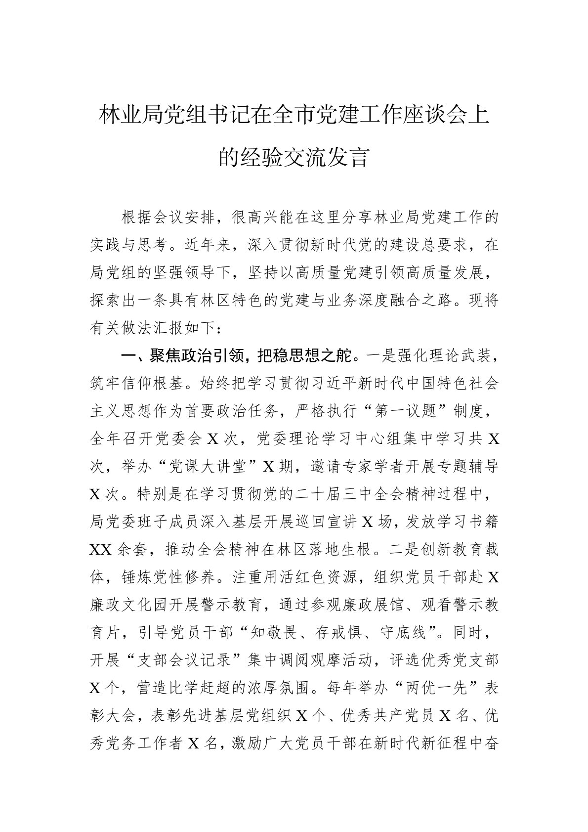 根据会议安排,很高兴能在这里分享林业局党建工作的实践与思考。近年来,深入贯彻新时代党的建设总要求,在局党组的坚强领导下,坚持以高质量党建引领高质量发展,探索出一条具有林区特色的党建与业务深度融合之路。现将有关做法汇报如下:一、聚焦政治引领,把稳思想之舵。一是强化理论武装,筑牢信仰根基。始终把学习贯彻习近平新时代中国特色社会主义思想作为首要政治任务,严格执行“第一议题”制度,全年召开党委会X次,党委理论学习中心组集中学习共X次,举办“党课大讲堂”X期,邀请专家学者开展专题辅导X次。特别是在学习贯彻党的二十届三中全会精神过程中,局党委班子成员深入基层开展巡回宣讲X场,发放学习书籍XX余套,推动全会...
