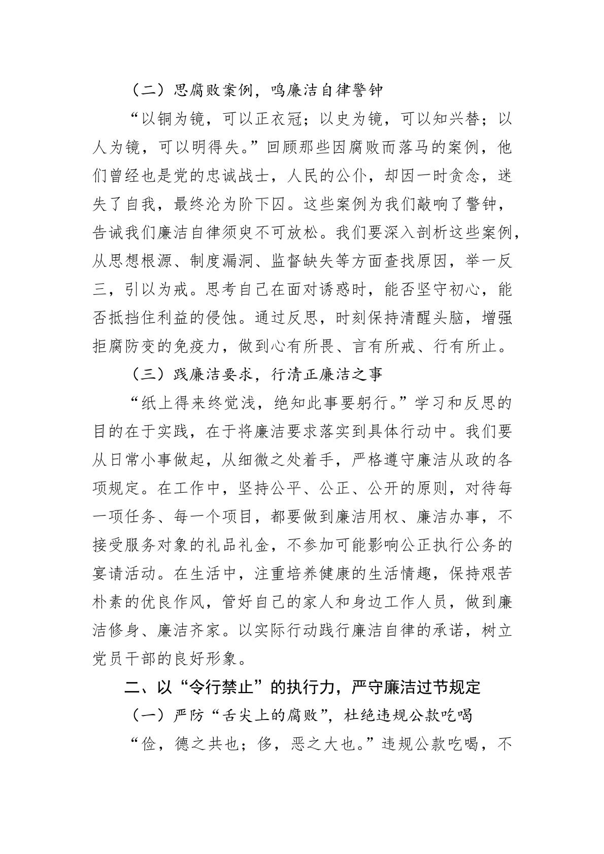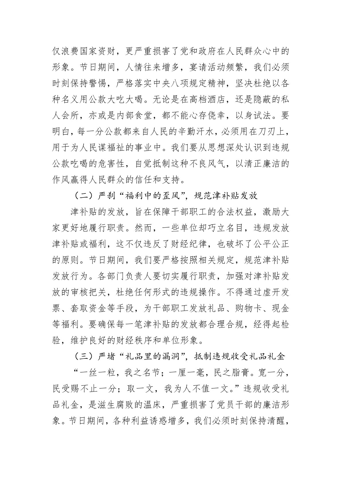 同志们:“五一”国际劳动节的钟声即将敲响,在这万象更新、充满活力的节日前夕,我们相聚在此,召开此次集体廉政谈话会,意义深远。节日是放松身心、阖家欢乐的时刻,却也是“四风”问题的高发期,是对我们党员干部党性修养、纪律意识的重大考验。正如古人云:“居安思危,思则有备,有备无患。”我们必须时刻保持警醒,以“节”为鉴,严守纪律红线,筑牢廉洁防线,确保度过一个风清气正、欢乐祥和的节日。借此机会,我讲几点意见。一、以“学思践悟”的笃行力,夯实廉洁从政根基(一)学党纪法规,明纪律规矩之矩“法者,天下之程式也,万事之仪表也。”党纪法规是每一位党员干部必须遵循的行为准则,是维护党的团结统一、完成党的任务的重要保...
