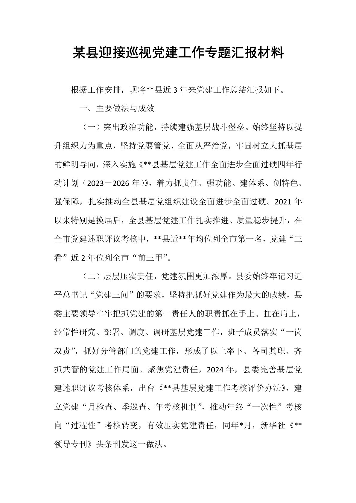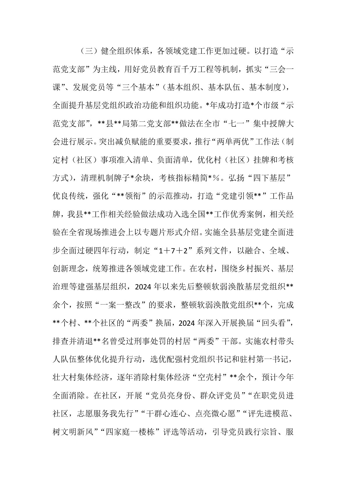 某县迎接巡视党建工作专题汇报材料根据工作安排,现将**县近3年来党建工作总结汇报如下。一、主要做法与成效(一)突出政治功能,持续建强基层战斗堡垒。始终坚持以提升组织力为重点,坚持党要管党、全面从严治党,牢固树立大抓基层的鲜明导向,深入实施《**县基层党建工作全面进步全面过硬四年行动计划(2023-2026年)》,着力抓责任、强功能、建体系、创特色、强保障,扎实推动全县基层党组织建设全面进步全面过硬。2021年以来特别是换届后,全县基层党建工作扎实推进、质量稳步提升,在全市党建述职评议考核中,**县近**年均位列全市第一名,党建“三看”近2年位列全市“前三甲”。(二)层层压实责任,党建氛围更加浓...