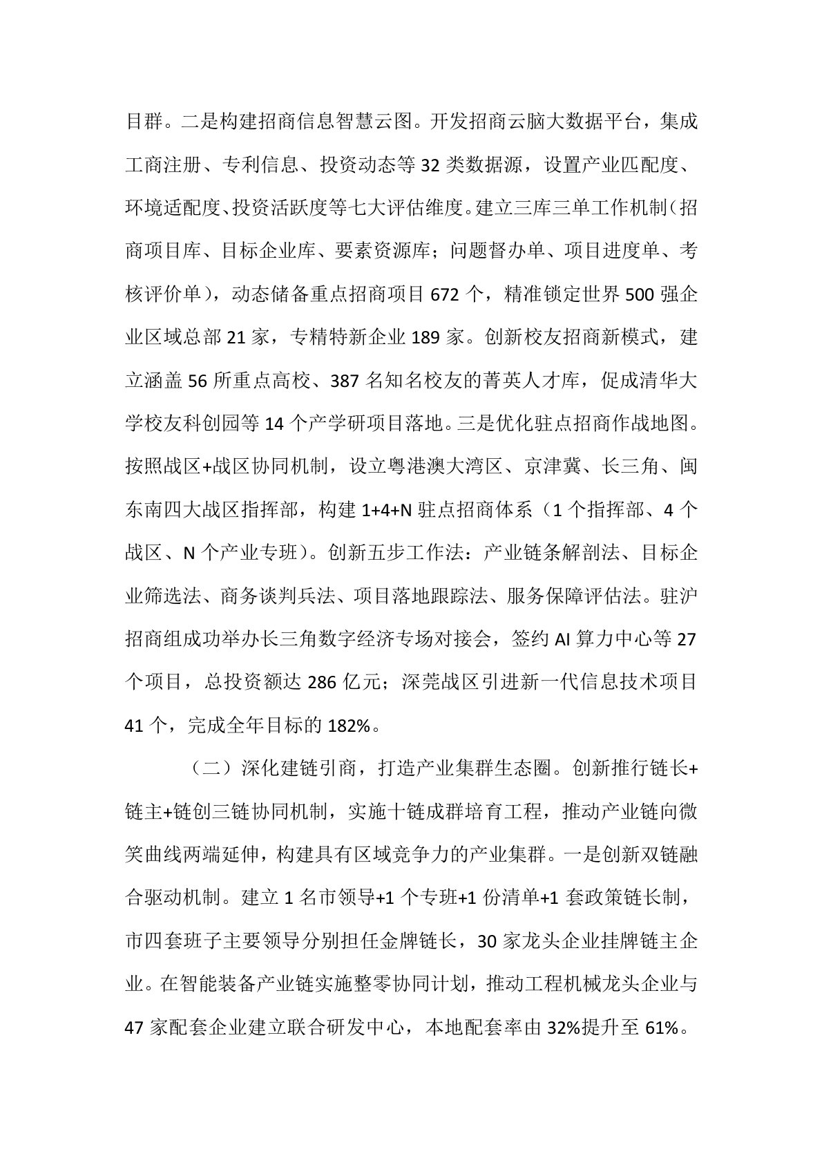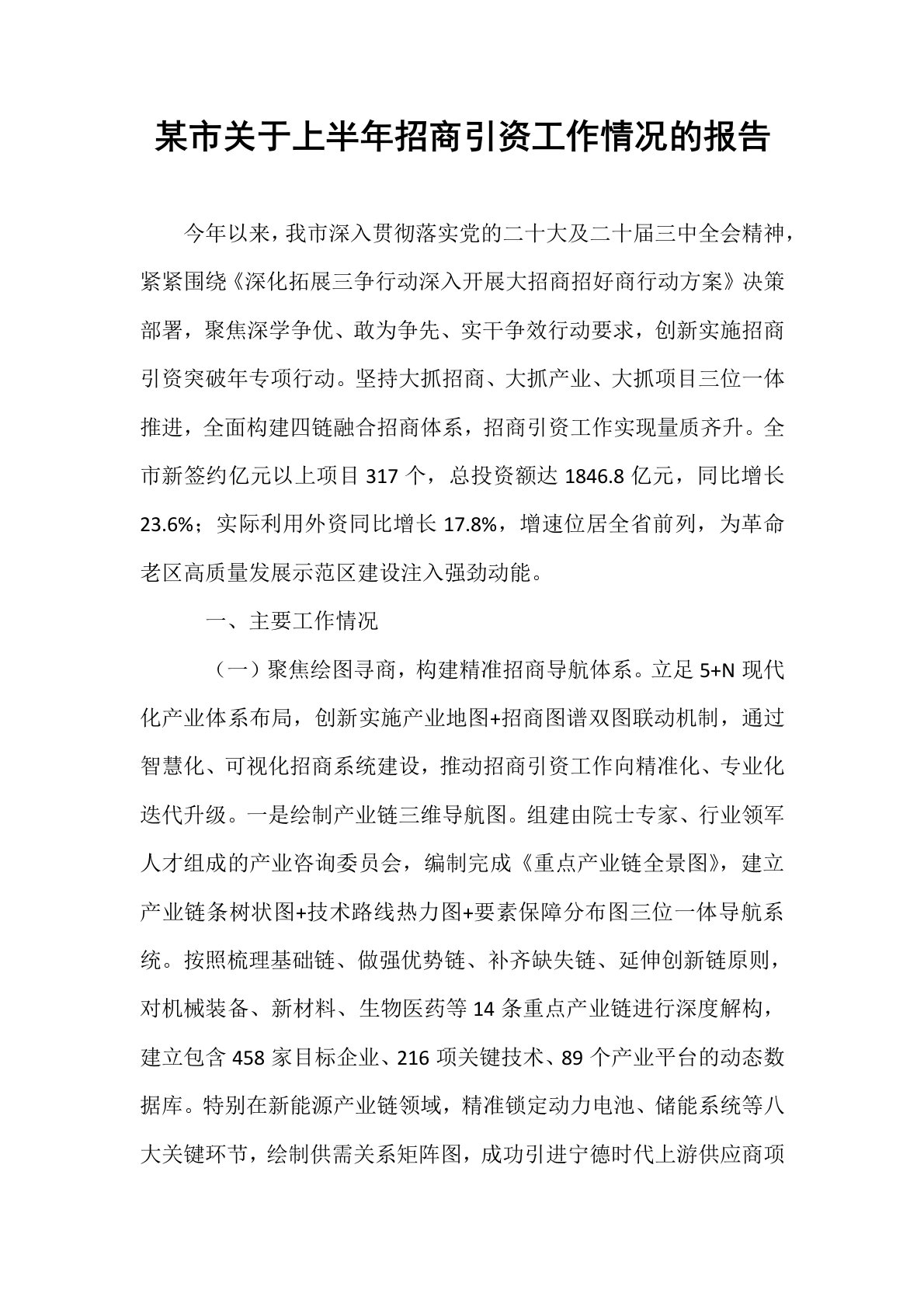 某市关于上半年招商引资工作情况的报告今年以来,我市深入贯彻落实党的二十大及二十届三中全会精神,紧紧围绕《深化拓展三争行动深入开展大招商招好商行动方案》决策部署,聚焦深学争优、敢为争先、实干争效行动要求,创新实施招商引资突破年专项行动。坚持大抓招商、大抓产业、大抓项目三位一体推进,全面构建四链融合招商体系,招商引资工作实现量质齐升。全市新签约亿元以上项目317个,总投资额达1846.8亿元,同比增长23.6%;实际利用外资同比增长17.8%,增速位居全省前列,为革命老区高质量发展示范区建设注入强劲动能。一、主要工作情况(一)聚焦绘图寻商,构建精准招商导航体系。立足5+N现代化产业体系布局,创新实...