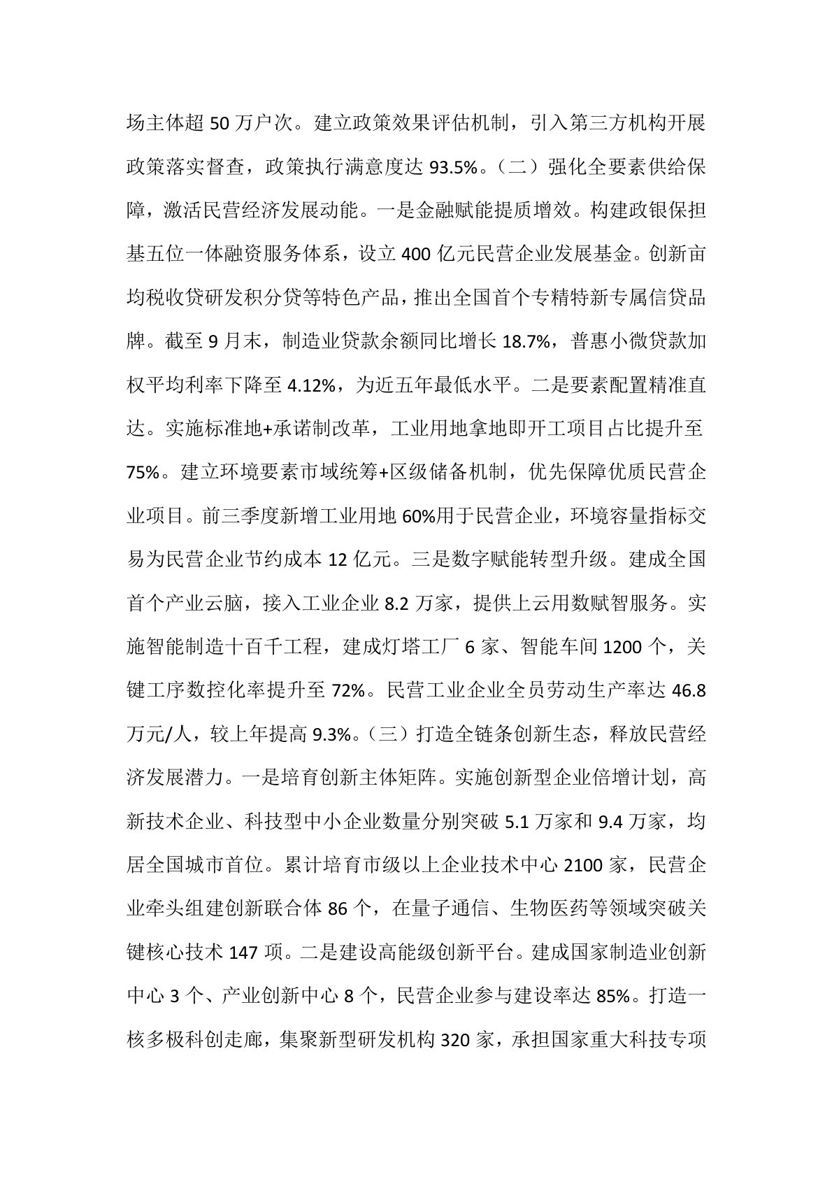 某市2025年上半年推动民营经济高质量发展工作情况报告今年以来,我市坚持以习近平新时代中国特色社会主义思想为指导,深入学习宣传贯彻党的二十大及二十届三中全会精神,全面贯彻落实习近平总书记关于民营经济工作的重要讲话和指示批示精神,坚持两个毫不动摇,推动民营企业加快迭代升级,发展稳健向好,民营经济规模总量走在全省前列,占GDP比重达68.5%;市场主体总量突破380万户,民营企业占比超过85%。一、主要工作情况(一)构建全周期政策体系,厚植民营经济发展沃土。一是强化顶层制度设计。建立1+N政策矩阵,出台《关于促进民营经济发展壮大的若干措施》及16个配套实施细则,形成涵盖市场准入、要素配置、权益保护...