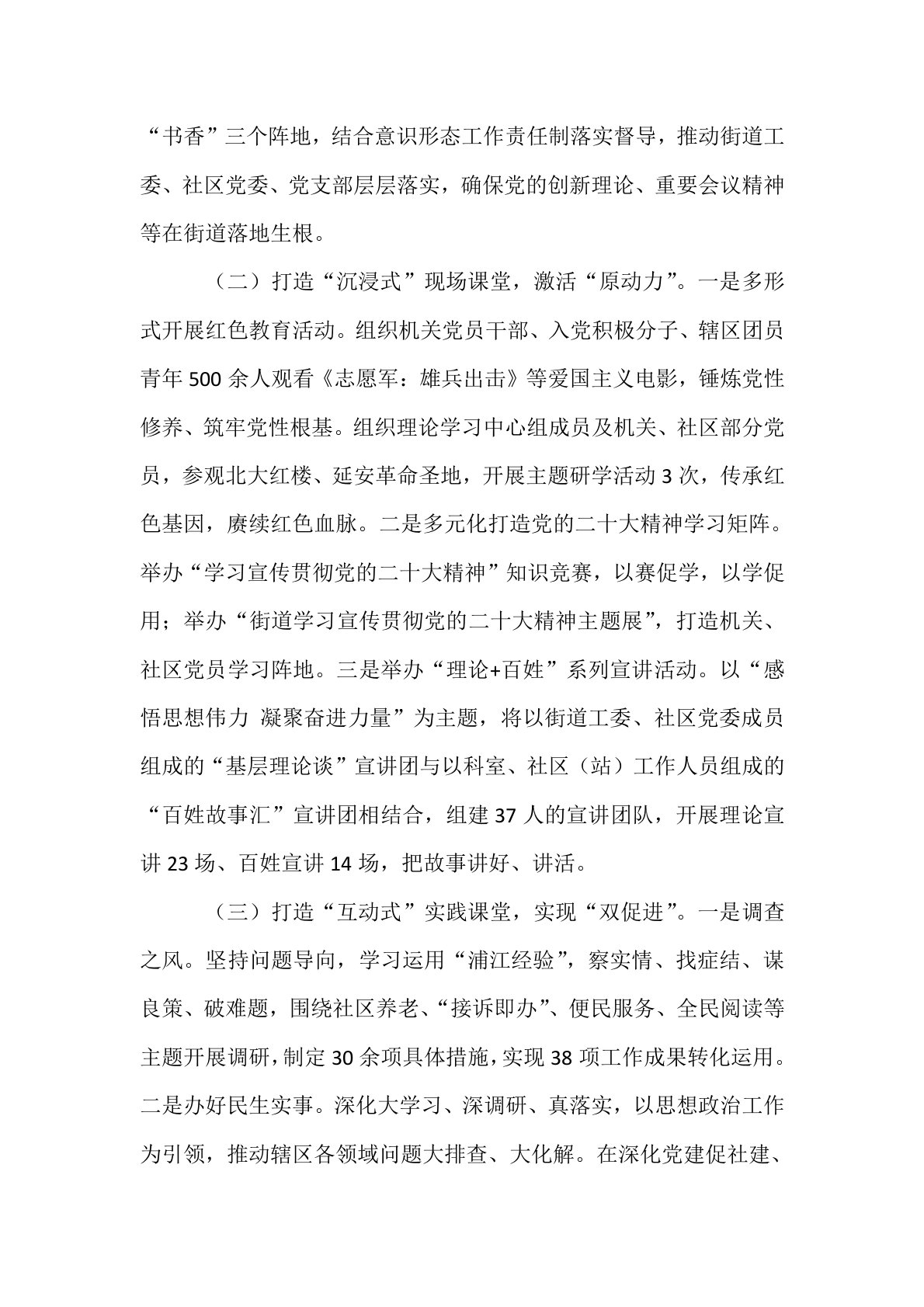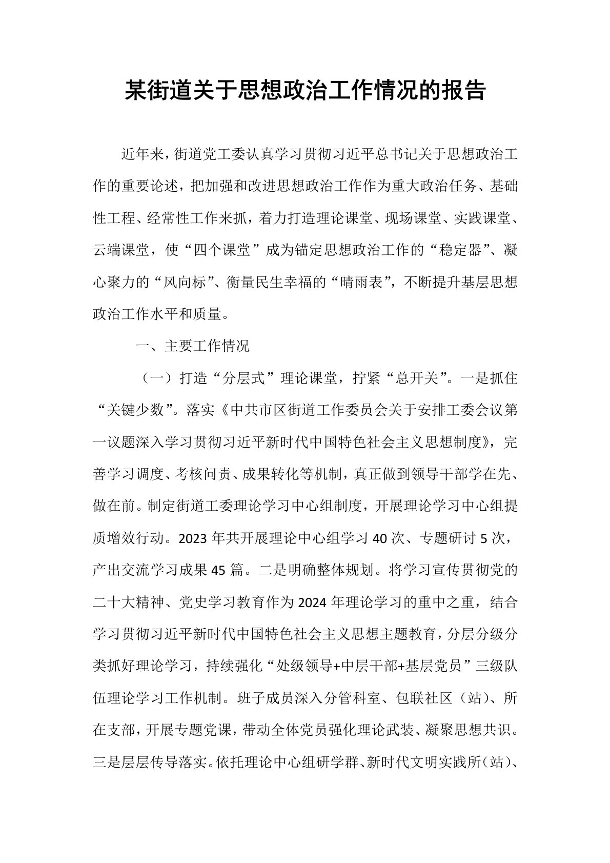某街道关于思想政治工作情况的报告近年来,街道党工委认真学习贯彻习近平总书记关于思想政治工作的重要论述,把加强和改进思想政治工作作为重大政治任务、基础性工程、经常性工作来抓,着力打造理论课堂、现场课堂、实践课堂、云端课堂,使“四个课堂”成为锚定思想政治工作的“稳定器”、凝心聚力的“风向标”、衡量民生幸福的“晴雨表”,不断提升基层思想政治工作水平和质量。一、主要工作情况(一)打造“分层式”理论课堂,拧紧“总开关”。一是抓住“关键少数”。落实《中共市区街道工作委员会关于安排工委会议第一议题深入学习贯彻习近平新时代中国特色社会主义思想制度》,完善学习调度、考核问责、成果转化等机制,真正做到领导干部学在...