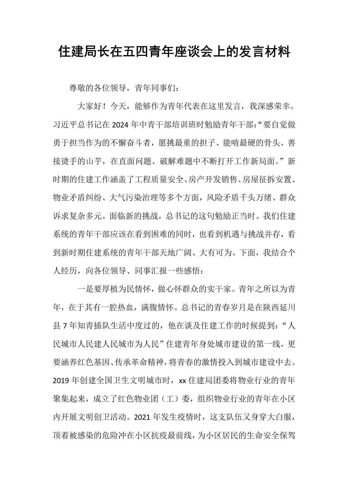 住建局长在五四青年座谈会上的发言材料尊敬的各位领导,青年同事们:大家好!今天,能够作为青年代表在这里发言,我深感荣幸。习近平总书记在2024年中青干部培训班时勉励青年干部:“要自觉做勇于担当作为的不懈奋斗者,愿挑最重的担子、能啃最硬的骨头、善接烫手的山芋,在直面问题、破解难题中不断打开工作新局面。”新时期的住建工作涵盖了工程质量安全、房产开发销售、房屋征拆安置、物业矛盾纠纷、大气污染治理等多个方面,风险矛盾千头万绪、群众诉求复杂多元。面临新的挑战,总书记的这句勉励正当时。我们住建系统的青年干部应该在看到困难的同时,也看到机遇与挑战并存,看到新时期住建系统的青年干部天地广阔、大有可为。下面,我结...